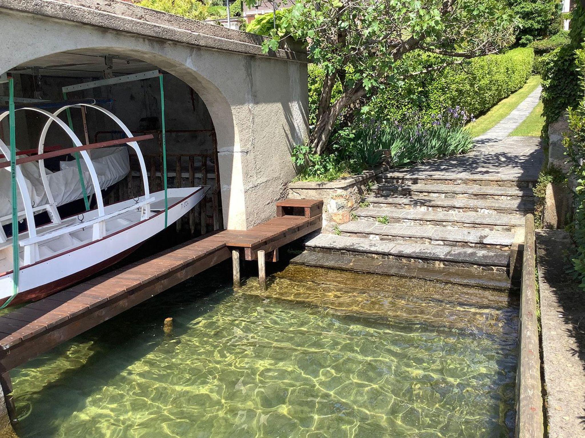 You can walk through the garden (approx. three minutes) to the private swimming bay. A wide granite staircase provides easy access to the lake. We recommend bathing shoes. As the bottom of the lake slopes gently down to the lake side, an adult can refresh themselves standing near the steps up to the centre of their body, depending on the water level of the lake. For further refreshment, there is also a shower with a drinking water connection. An outside staircase takes you to the boathouse's sun terrace. There you can enjoy the unique view of Lake Lugano. Sunshades, sun loungers and a weatherproof table and chairs are at your disposal. Another practical feature is the wind-protected dining area right next to the boathouse with a large round, light-coloured granite table and plenty of chairs. Do you prefer to lie in the shade out of the wind? The spot under the fig tree is ideal for this.