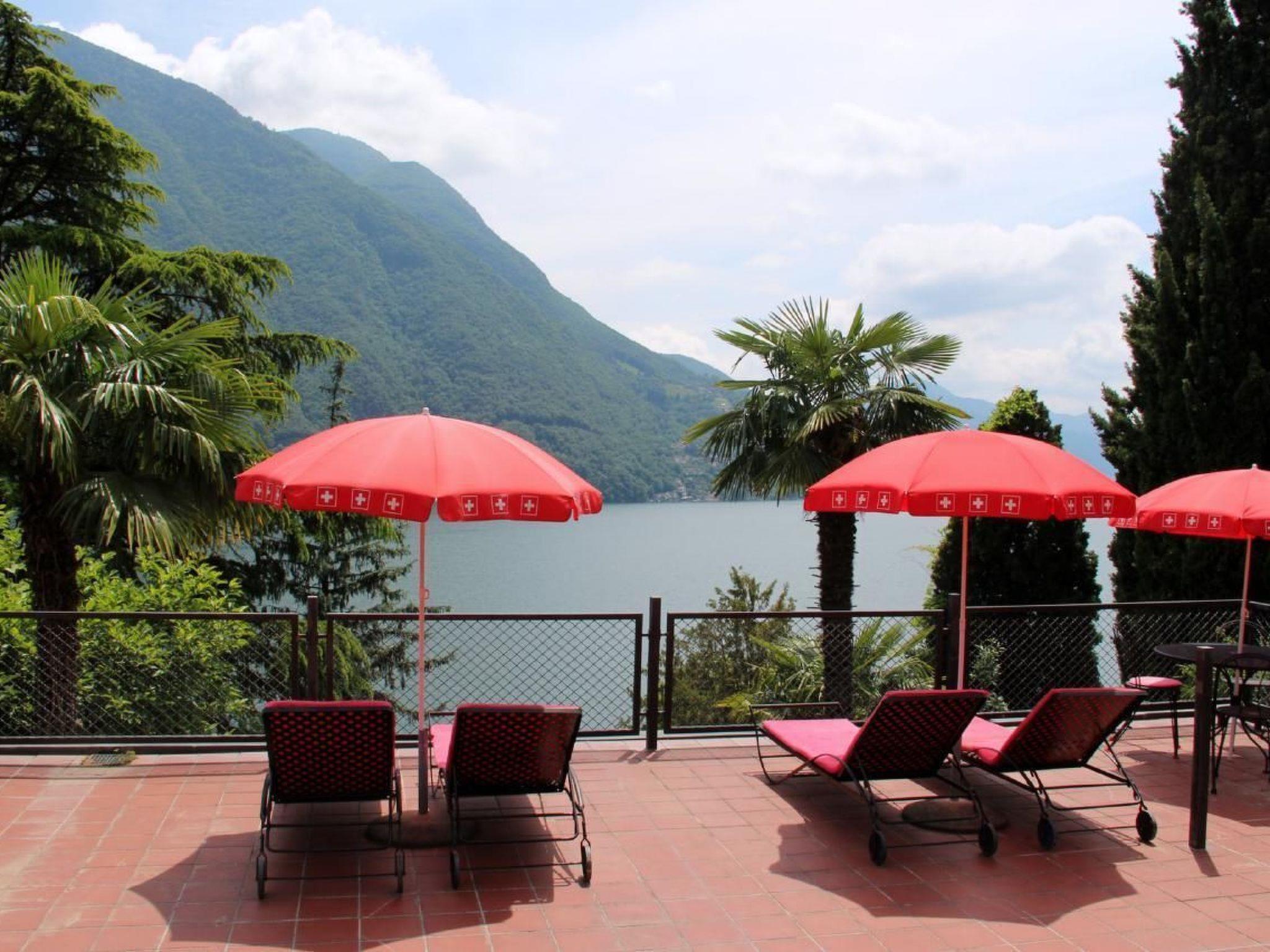 entrance from the outside -- with terraces/balconies for 1-8 persons is located in the exclusive district of Lugano-Castagnola at the foot of "Monte Bre" (the sunniest mountain in Switzerland). The extraordinary residence is enthroned above a terraced Mediterranean tree garden (close to nature) with palm trees between the private cul-de-sac Via Violetta and the ancient olive footpath from Lugano-Castagnola to the picturesque fishing village of "Gandria" (1.3 km).