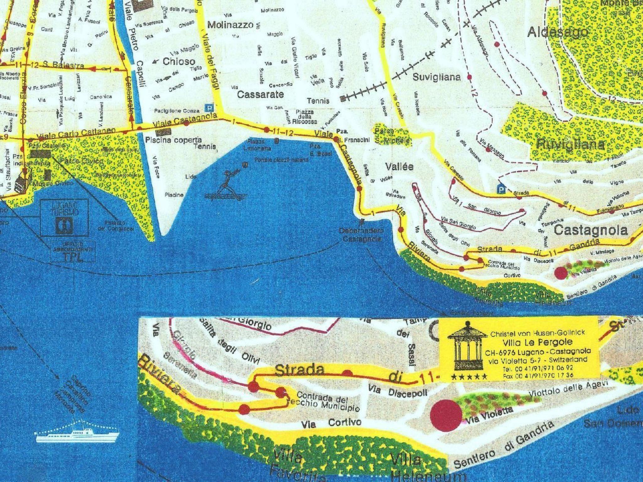 To: lake with bathing jetty (for adults) and landing stage 130 m + steps, scheduled boat at the "Villa Heleneum" museum 250 m, Lido San Domenico 400 m, bus 70-400 m, restaurants 300 m, grocers, Lido Lugano, tennis court, fitness centre, mountain railway to Monte Brè 1.2 to 1.5 km. Centre of Lugano 2.5 km. Residence managed by the owner, who lives on site.