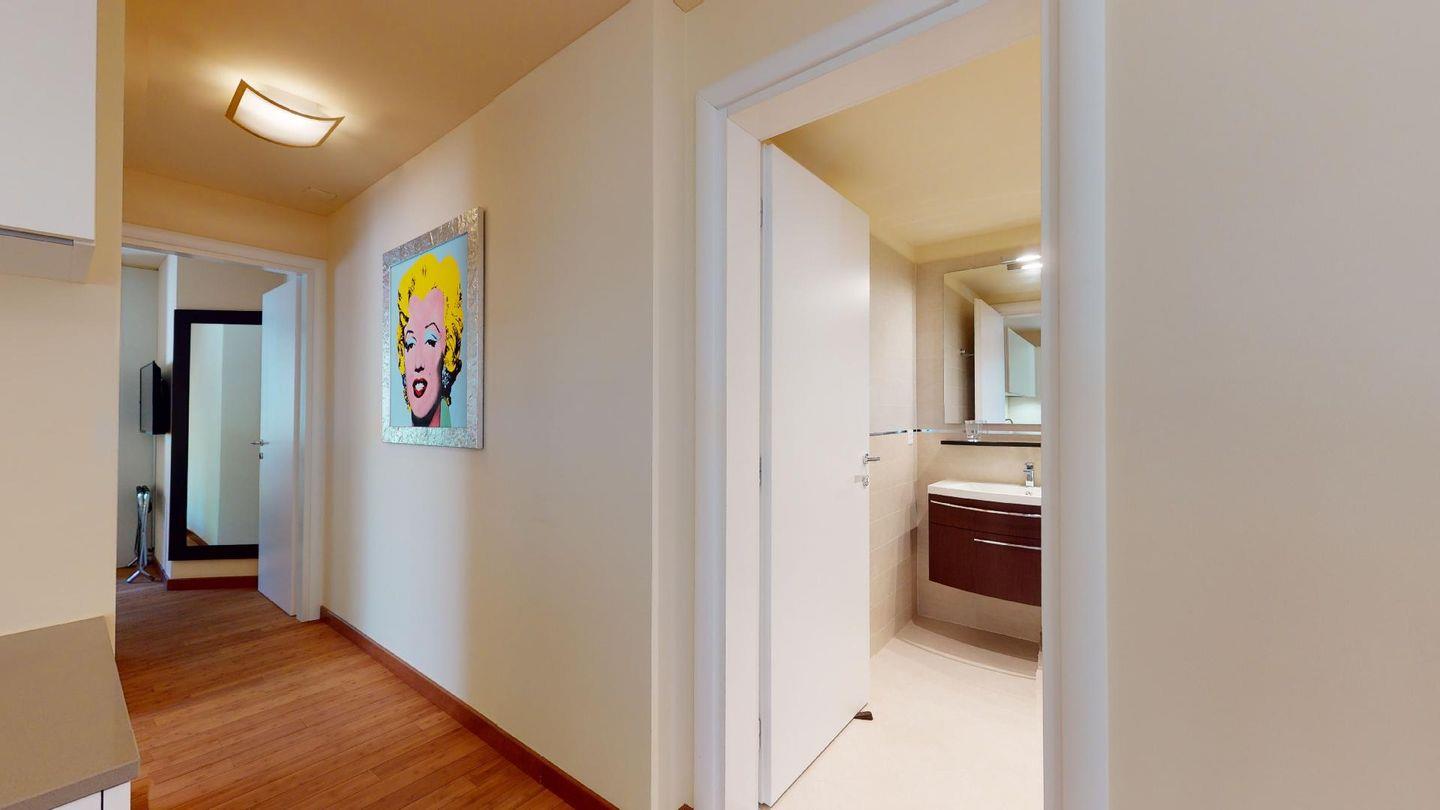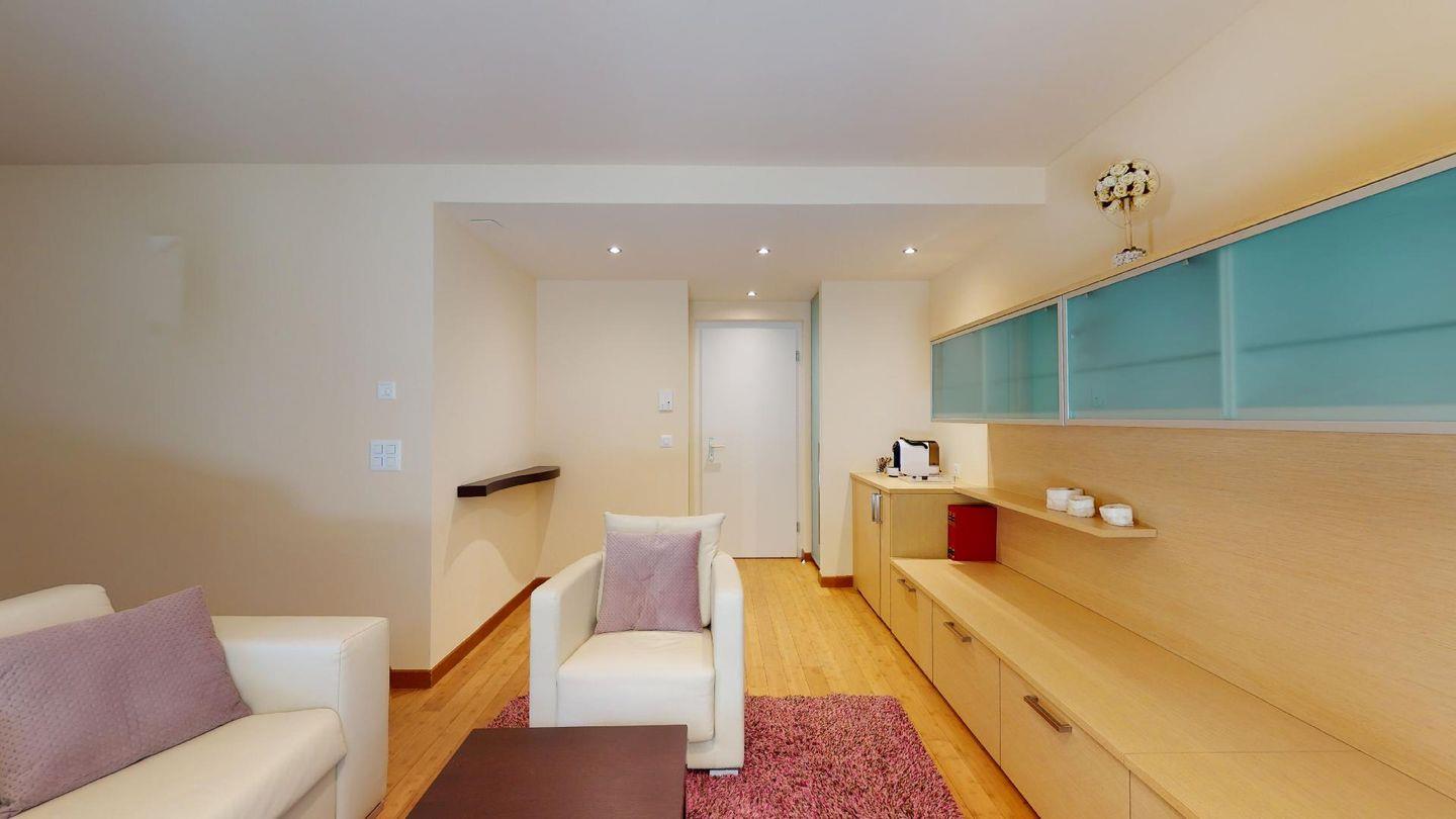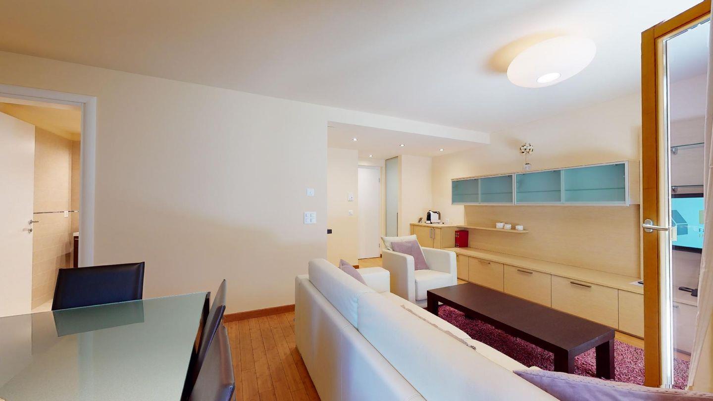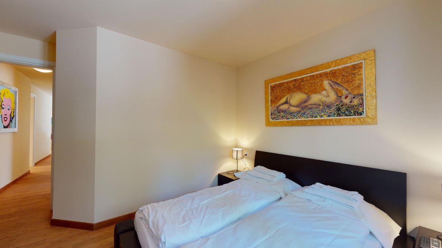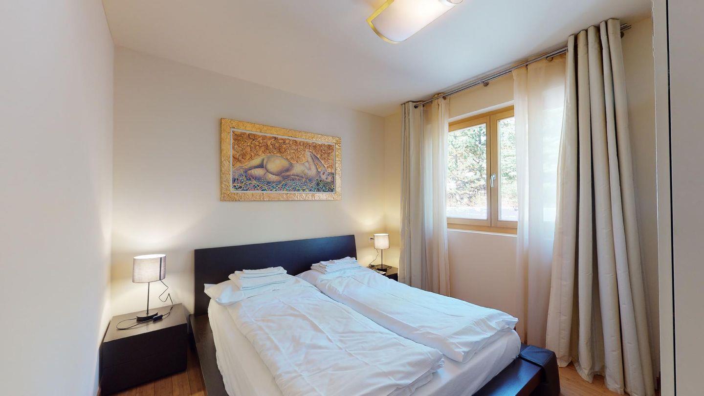 Moderne 3½ Zimmerwohnung im Erdgeschoss, ca. 58m² gross. Eingang mit Garderobe. Offenes Wohn- und Esszimmer mit Küchenzeile. Esstisch mit sechs Stühlen, ein Sofa, Smart-TV und Terrasse. Küche mit Herd, Ofen, Kühlschrank und Geschirrspüler. Ein Doppelzimmer mit Smart-TV. Ein Zimmer mit zwei Einzelbetten. Badezimmer mit Wanne, Lavabo, Toilette und Bidet. WLAN. Gemeinsamer Ski- und Veloraum, sowie Waschmaschine im Untergeschoss. 1 Parkplatz in der Tiefgarage (Höhe max. 210 cm).