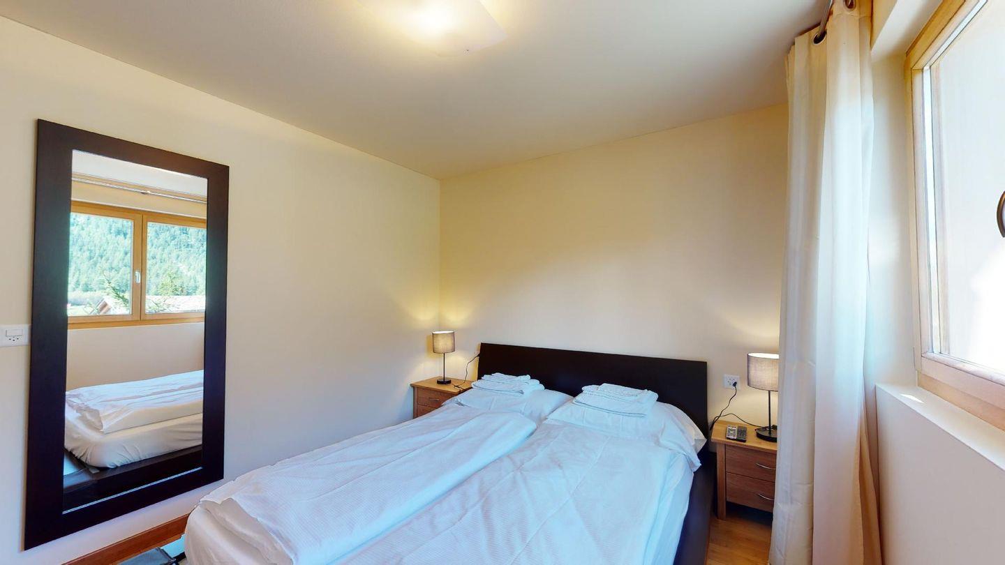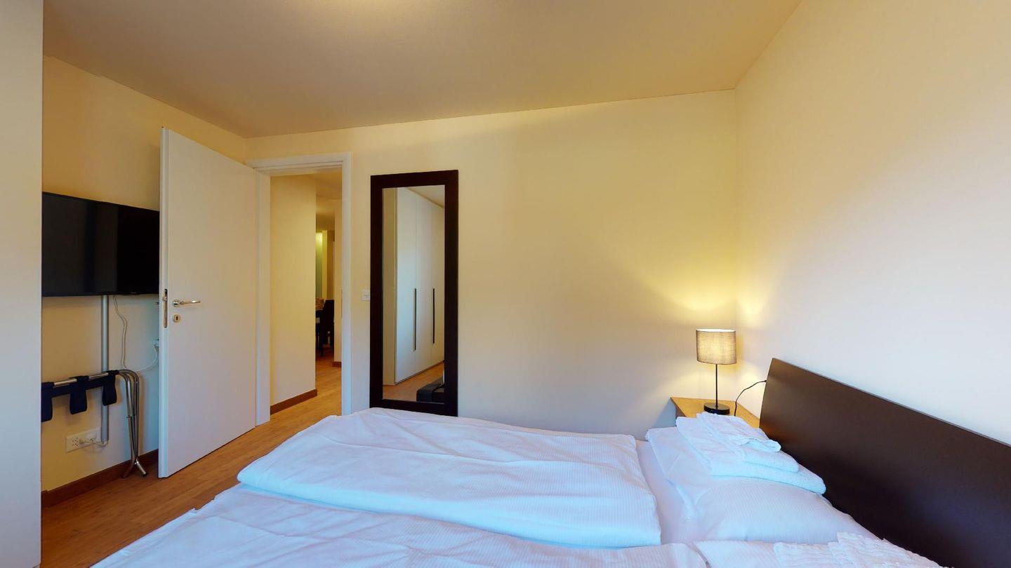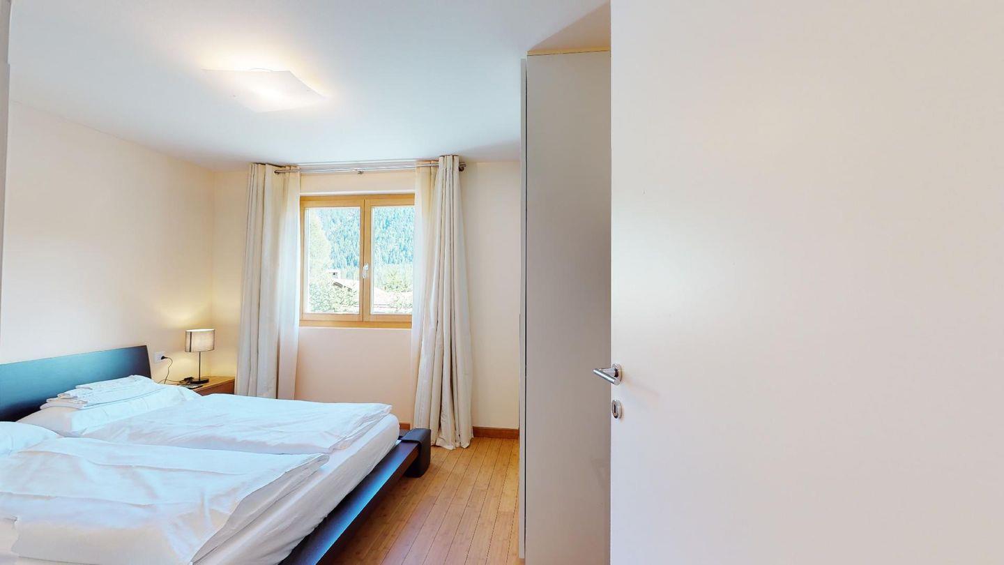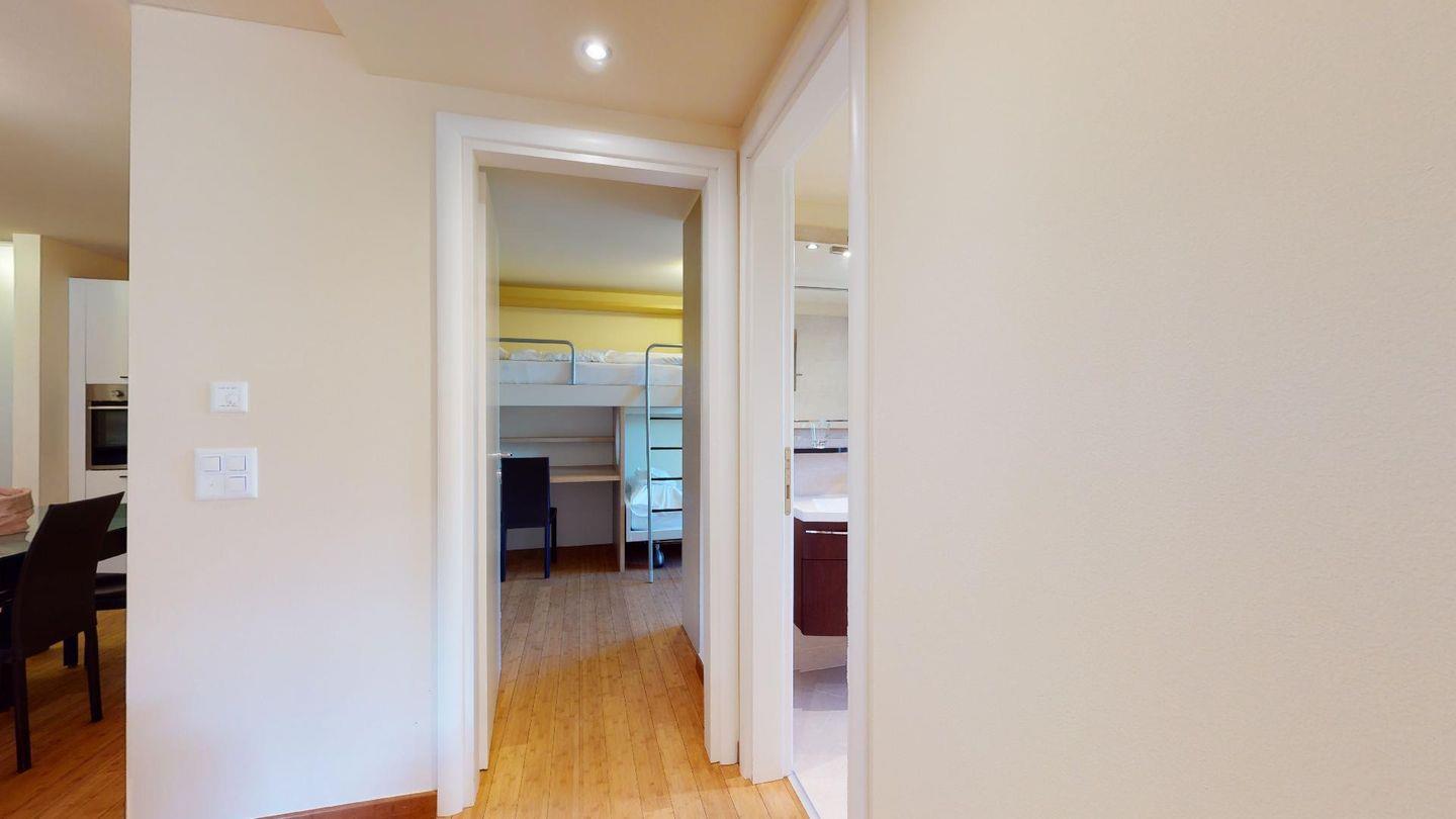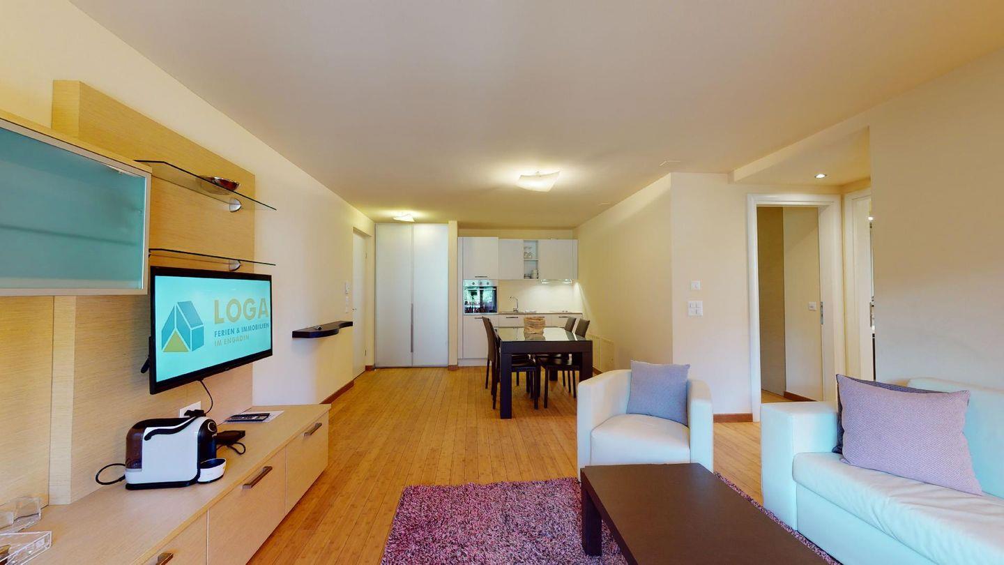 Moderne 3½ Zimmerwohnung im 1. Stock, ca. 63m² gross. Eingang mit Garderobe. Offenes Wohn- und Esszimmer mit Küchenzeile. Esstisch mit vier Stühlen, ein Sofa, Smart-TV und Balkon. Küche mit Herd, Ofen, Kühlschrank und Geschirrspüler. Ein Doppelzimmer mit Smart-TV. Ein Zimmer mit einem Einzelbett und einem Hochbett, Balkon. Badezimmer mit Wanne, Lavabo, Toilette und Bidet. WLAN. Gemeinsamer Ski- und Veloraum, sowie Waschmaschine im Untergeschoss. 1 Parkplatz in der Tiefgarage (Höhe max. 210 cm).