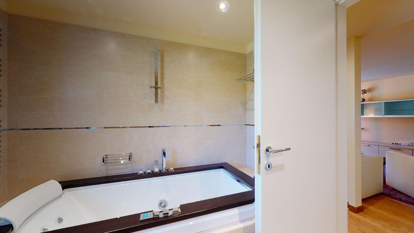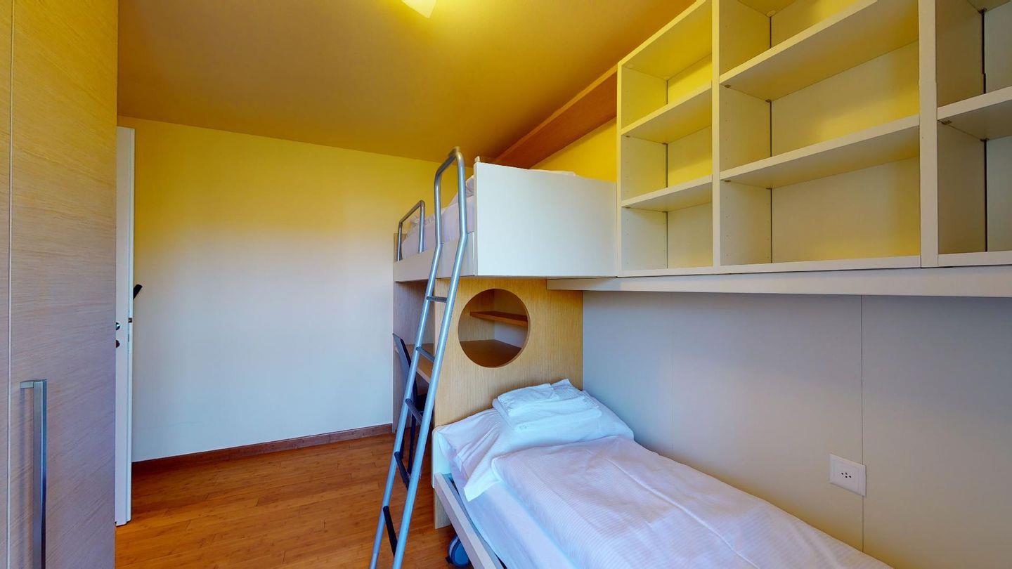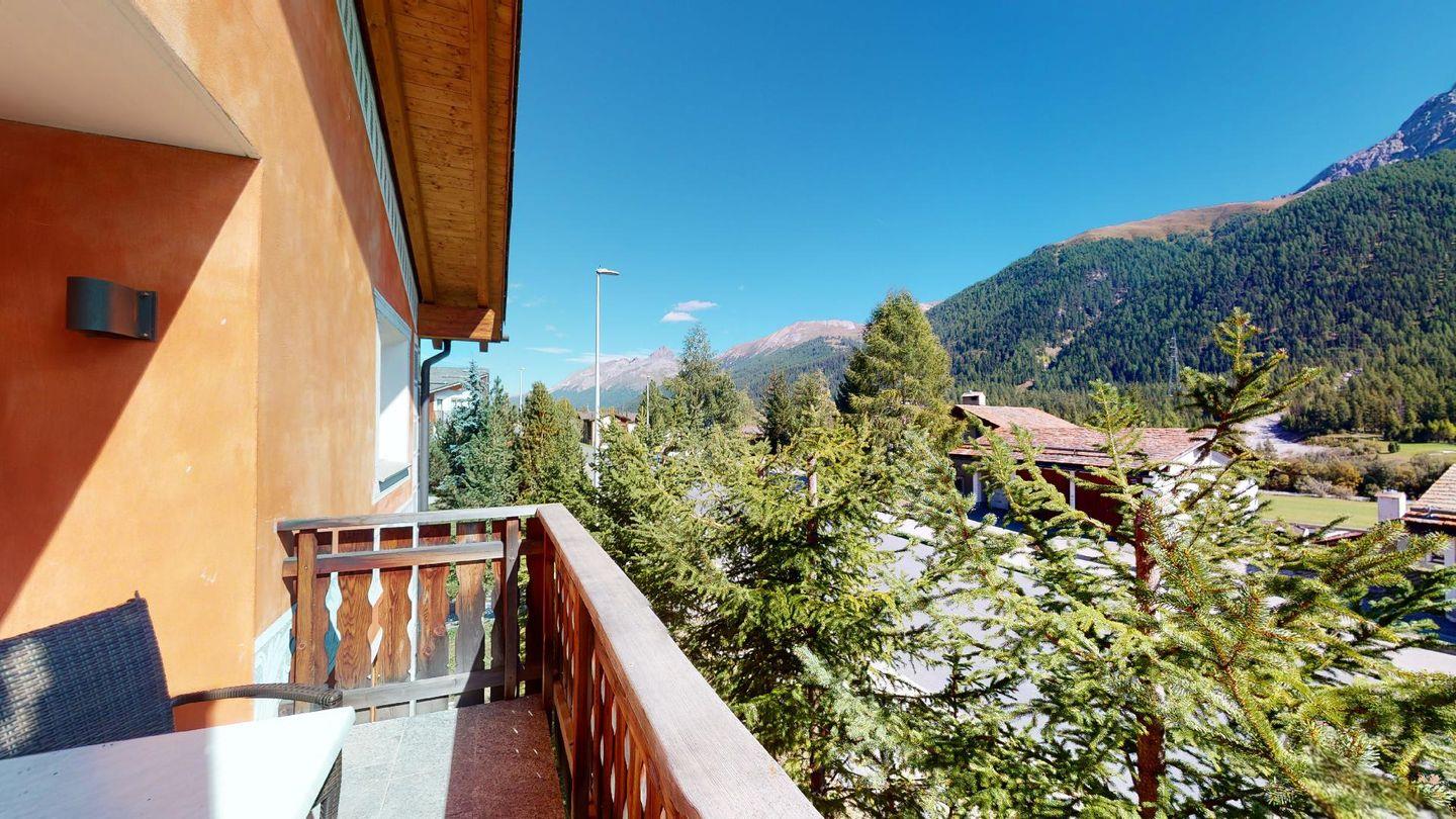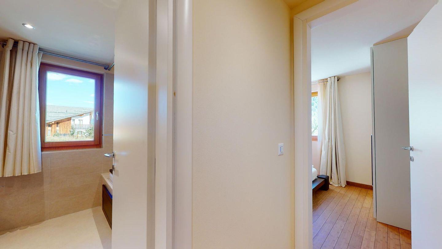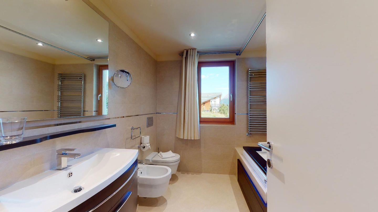 Moderne 3½ Zimmerwohnung im 1. Stock, ca. 63m² gross. Eingang mit Garderobe. Offenes Wohn- und Esszimmer mit Küchenzeile. Esstisch mit vier Stühlen, ein Sofa, Smart-TV und Balkon. Küche mit Herd, Ofen, Kühlschrank und Geschirrspüler. Ein Doppelzimmer mit Smart-TV. Ein Zimmer mit einem Einzelbett und einem Hochbett, Balkon. Badezimmer mit Wanne, Lavabo, Toilette und Bidet. WLAN. Gemeinsamer Ski- und Veloraum, sowie Waschmaschine im Untergeschoss. 1 Parkplatz in der Tiefgarage (Höhe max. 210 cm).