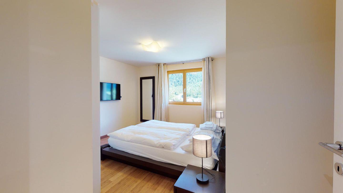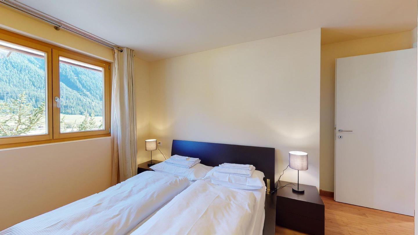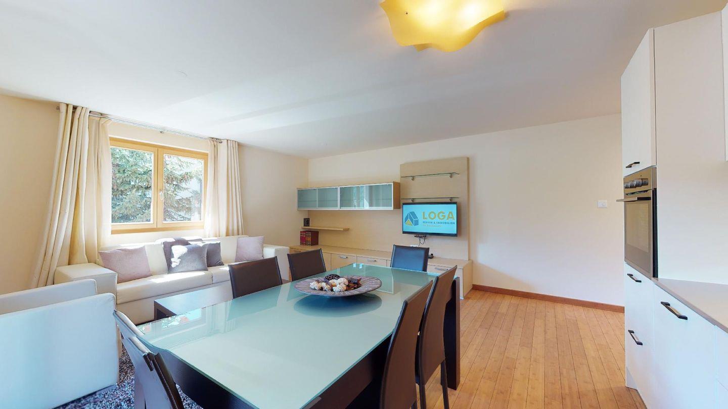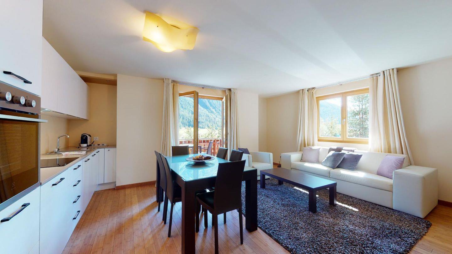 Moderne 3½ Zimmerwohnung im 1. Stock, ca. 67m² gross. Eingang mit Garderobe. Offenes Wohn- und Esszimmer mit Küchenzeile. Esstisch mit sechs Stühlen, ein Sofa, Smart-TV und Balkon. Küche mit Herd, Ofen, Kühlschrank und Geschirrspüler. Ein Doppelzimmer mit Smart-TV. Ein Zimmer mit einem Einzelbett und einem Hochbett. Badezimmer mit Wanne, Lavabo, Toilette und Bidet. WLAN. Gemeinsamer Ski- und Veloraum, sowie Waschmaschine im Untergeschoss. 1 Parkplatz in der Tiefgarage (Höhe max. 210 cm).
