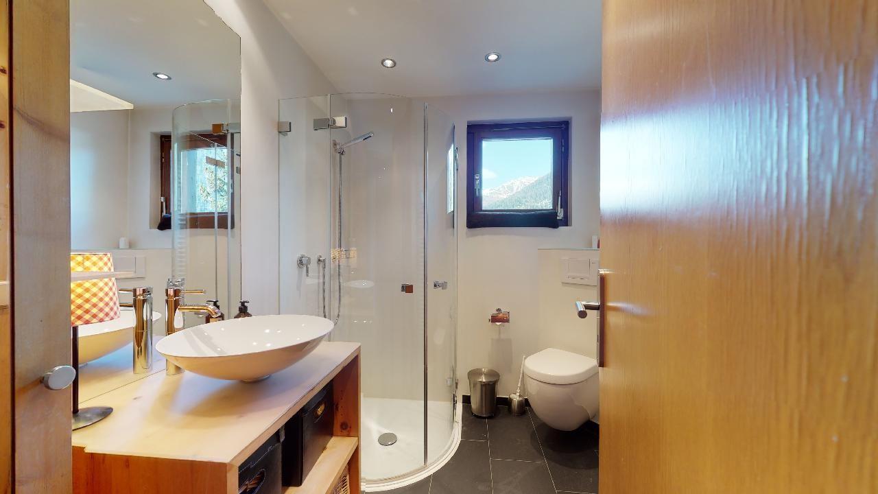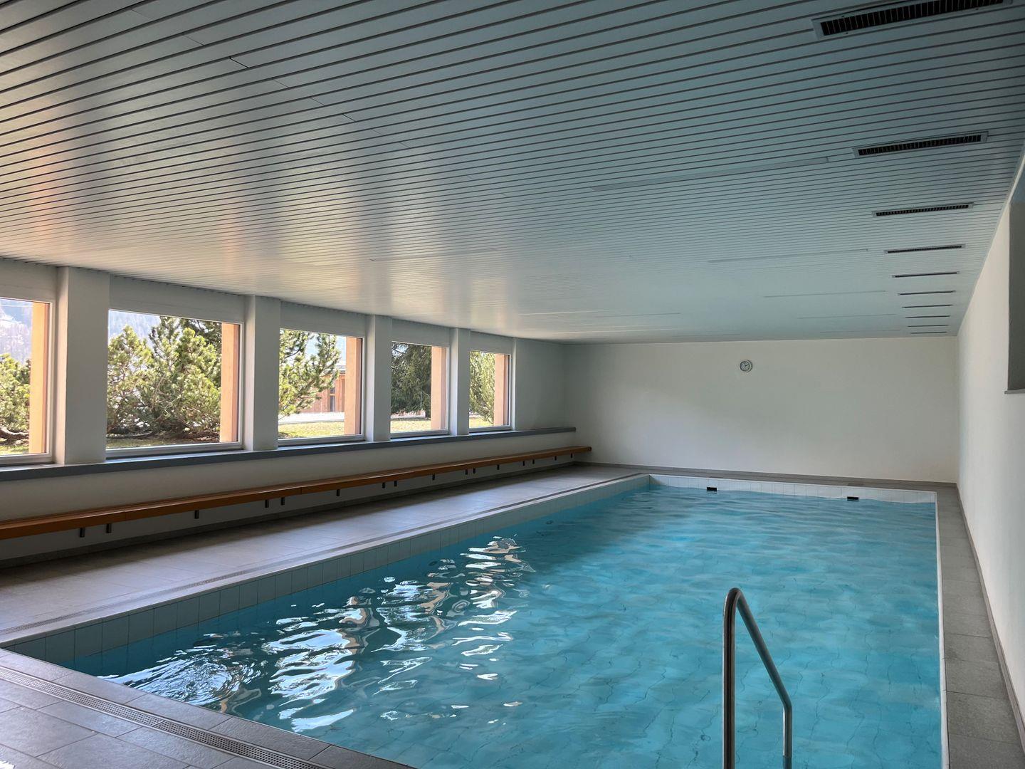 Eine Besonderheit dieser Wohnung ist der Wellnessbereich mit Hallenbald und Sauna zur gemeinsamen Nutzung. Im Hallenbad hat es Fenster, somit ist es mit Tageslicht ausgestattet und es ist das ganze Jahr von 07:00 Uhr - 22:00 Uhr geöffnet. Die Sauna kann kostenpflichtig genutzt werden. Ebenso zur gemeinschaftlichen Nutzung stehen ein Ski- und Veloraum sowie eine Waschküche zur Verfügung.