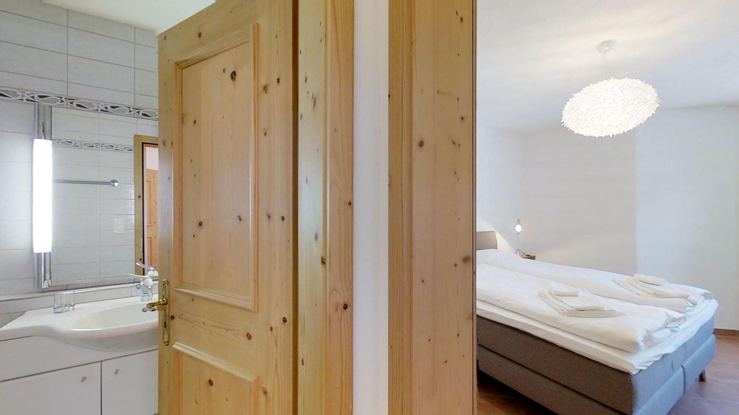 Moderne 2½-Zimmerwohnung im ersten Obergeschoss auf etwa 60 Quadratmetern. Heller Eingangsbereich mit offener Garderobe. Schlafzimmer mit Doppelbett. Wohnzimmer mit Esstisch für 4 Personen. Gemütliche Sofaecke mit Sofabett für 2 Personen. Kamin. Zugang zum Balkon mit Bergsicht. TV/Radio/WIFI. Abgetrennte Küche mit Herd, Kühlschrank/Kühlfach, Chicco d'oro Kaffeemaschine. Badezimmer mit Badewanne, Waschbecken, WC. Separater Abstellraum. Garagenplatz. Skikeller, Waschküche im Haus. Haustiere sind erlaubt.