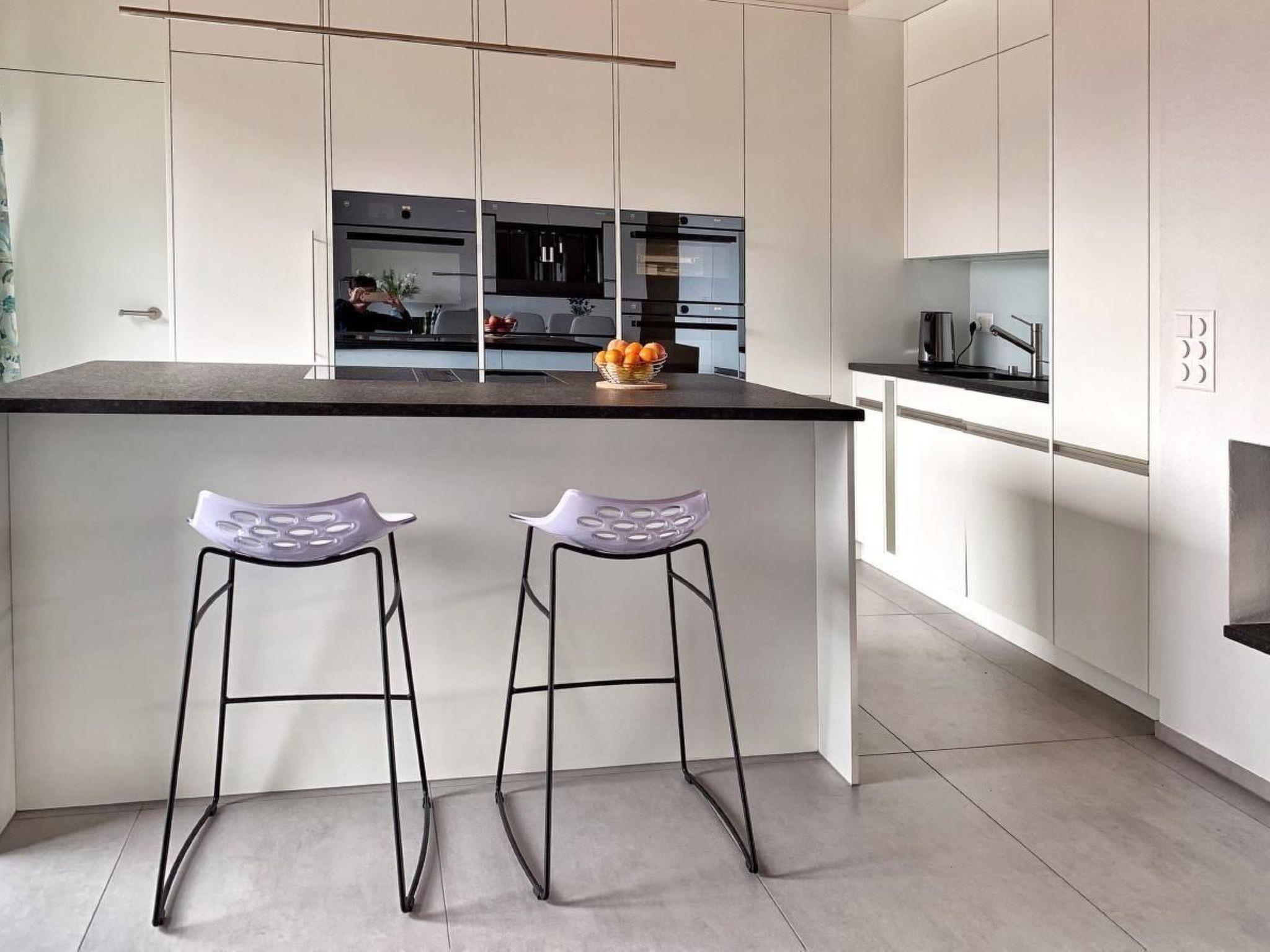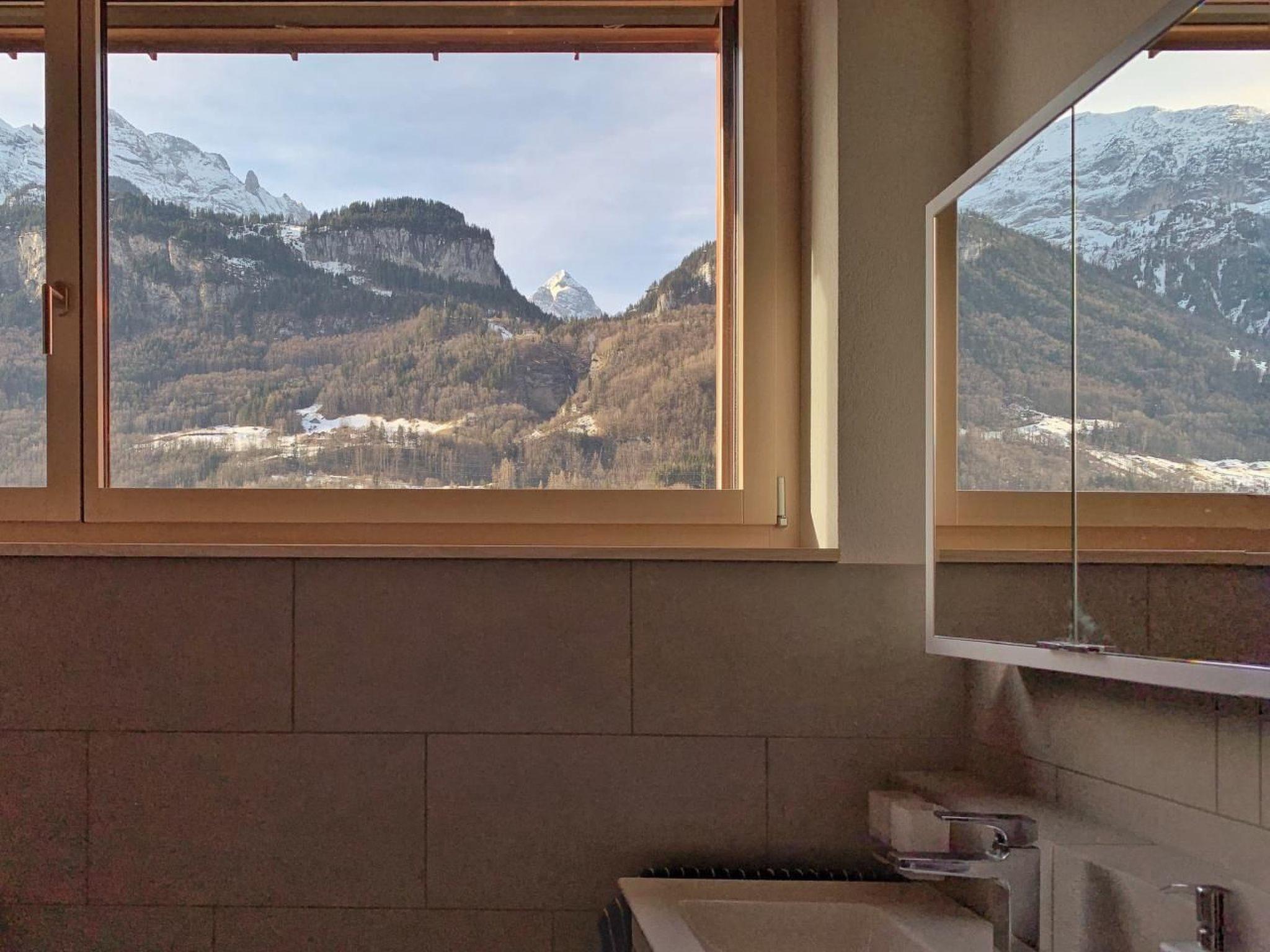The tastefully furnished holiday flat at the foot of the Hasliberg was renovated to a high standard in 2019 and offers maximum comfort. With three bedrooms, each equipped with double beds, the flat offers space for six people. The bathrooms adjoining the bedrooms are equipped with spacious rain showers. One bathroom also has a bathtub with light effects. The living room of the 150m² flat offers a panoramic view of the mountains, a fireplace and balconies on both sides with barbecue facilities. The adjoining open-plan kitchen with cooking island and induction hob offers modern equipment including a dishwasher, steam cooker, oven, plate warmer and a fondue and raclette set. The dining table for six people can be extended to seat ten guests. A utility room with washing machine, tumble dryer, iron and ironing board, a guest WC and a drying room in the basement with washing line and dehumidifier round off the holiday flat's facilities. There is a parking space in the underground car park and the flat is accessible via a lift.