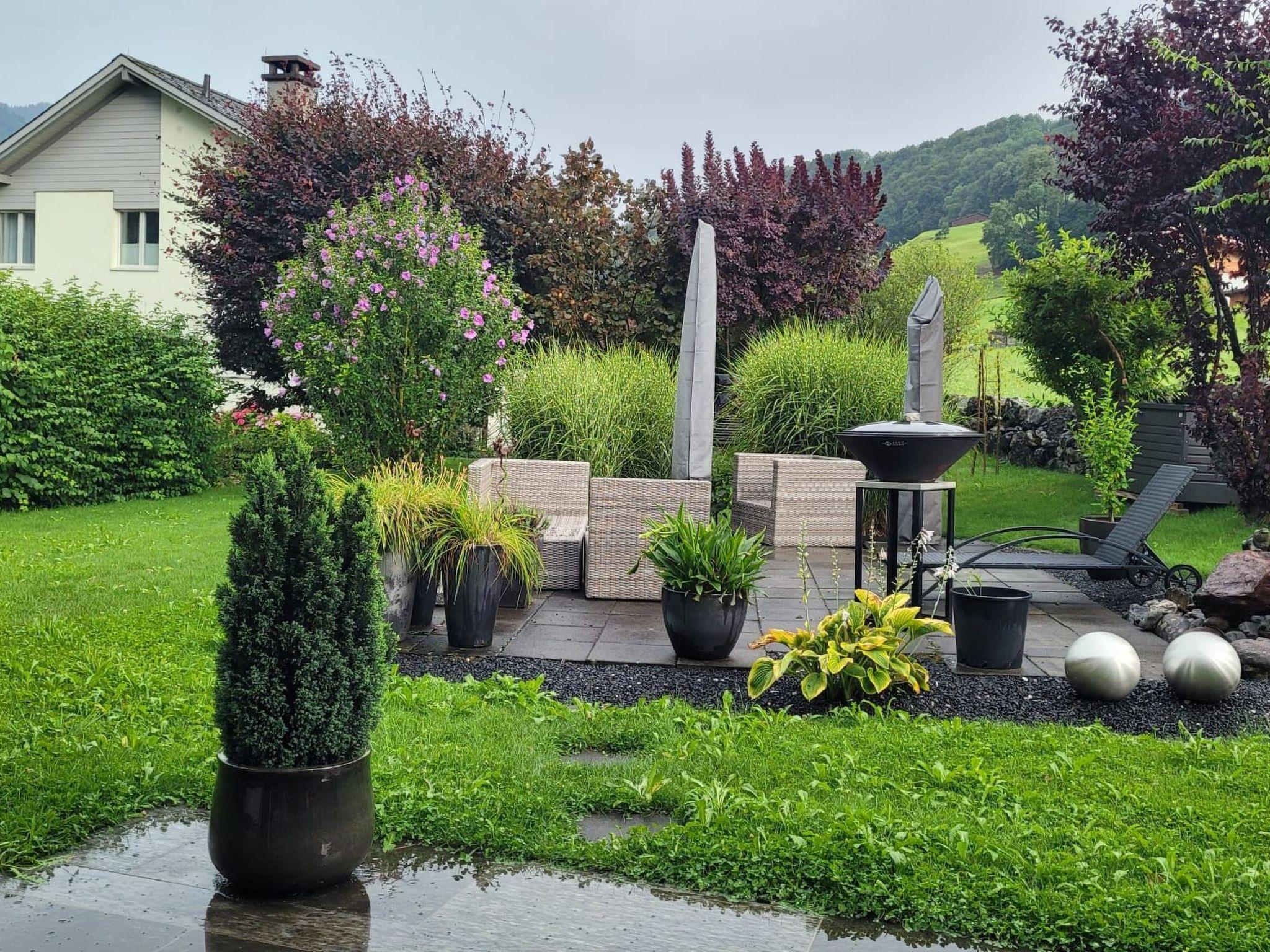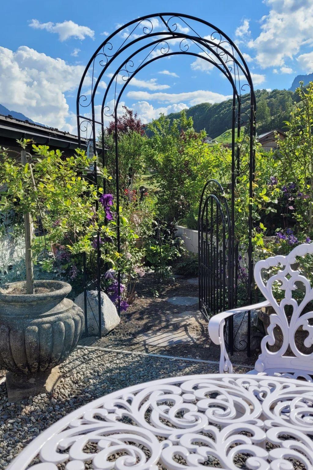 The outdoor area of the "Vreneli" is an oasis of calm, with an English garden with a seating area and a main garden with a sunny terrace that invites you to relax. Surrounded by fragrant herbs and with a view of the picturesque Vrenelis Gärtli, you will find your own personal haven of peace here. Whether you welcome the day with a coffee or enjoy the evening sun - our garden offers you the perfect setting.