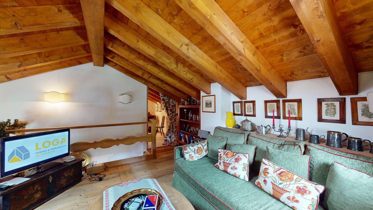 3½ - Zimmer-Duplexwohnung, ca. 105m², im OG/DG, mit Galerie, an ruhiger Lage mit schöner Bergsicht. Wohn- und Esszimmer mit Balkon und Sicht ins Roseg Tal und zur Julierkette. Geschlossene Küche mit Geschirrspüler und Backofen. Kaffeemaschine Chicco d'Oro. Ein Doppelzimmer mit eigenem Bad mit Wanne, WC, Lavabo und Bidet. Zweites Schlafzimmer mit zwei Einzelbetten. Badezimmer mit Bad mit Dusche, WC und Bidet. Auf der offenen Galerie befindet sich ein weiterer Wohnraum mit Sofa und TV. Eigene Waschmaschine in der Wohnung. Zwei Garagenplätze. Ski- und Veloraum zur Mitbenützung. Nichtraucherwohnung. Haustiere sind nicht erlaubt.