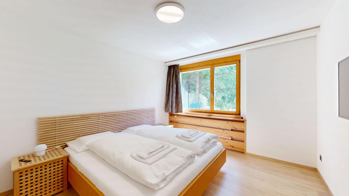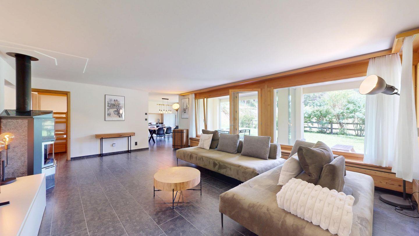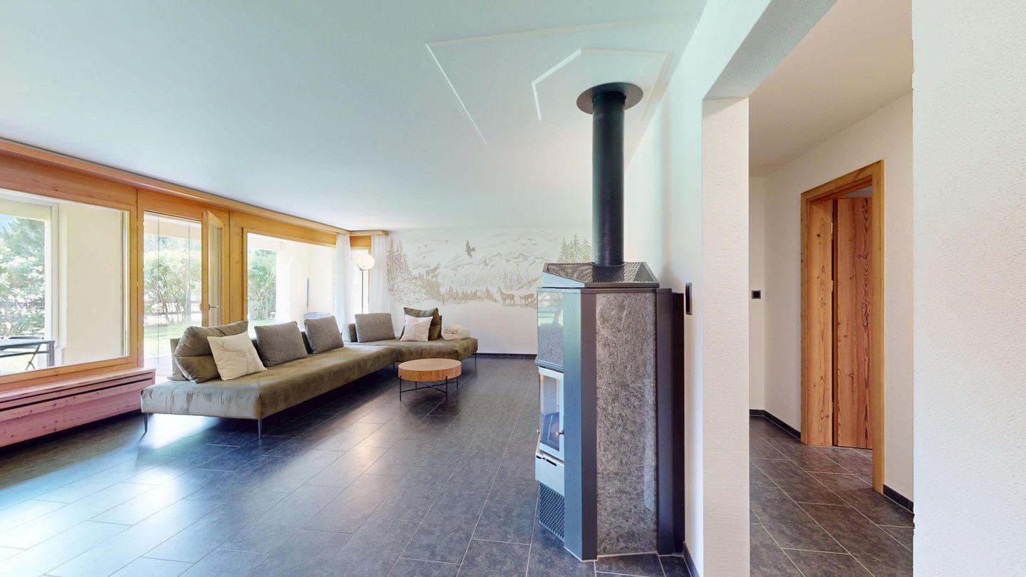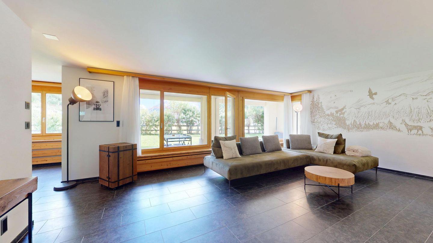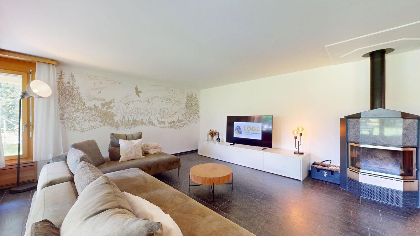Moderne und sehr geschmackvoll eingerichtete 4½-Zimmerwohnung im Erdgeschoss. Eingang mit Garderobe. Wohnzimmer mit TV, Schwedenofen und Ausgang auf die Terrasse. Offene Küche mit Essbereich, Induktionsherd, Geschirrspüler und Ausgang zum Wintergarten. Zwei Doppelzimmer mit TV, eines mit Ausgang zum Balkon, eines mit begehbarem Kleiderschrank. Ein Schlafzimmer mit Etagenbett. Zwei Badezimmer mit Dusche, WC, Lavabo. Eigene Waschmaschine und Tumbler. Ein Garagenstellplatz ist ebenfalls vorhanden. Haustiere sind nicht erlaubt.