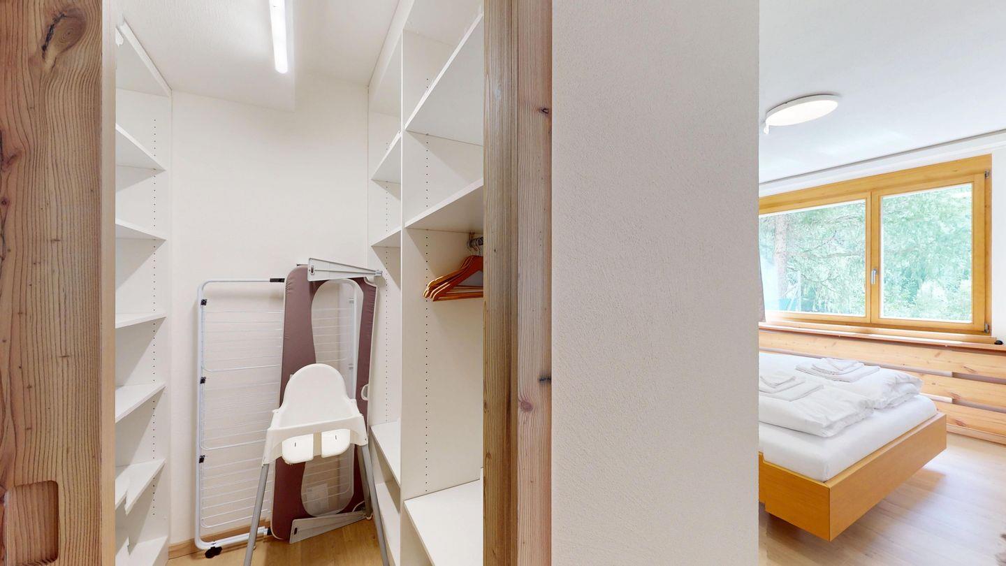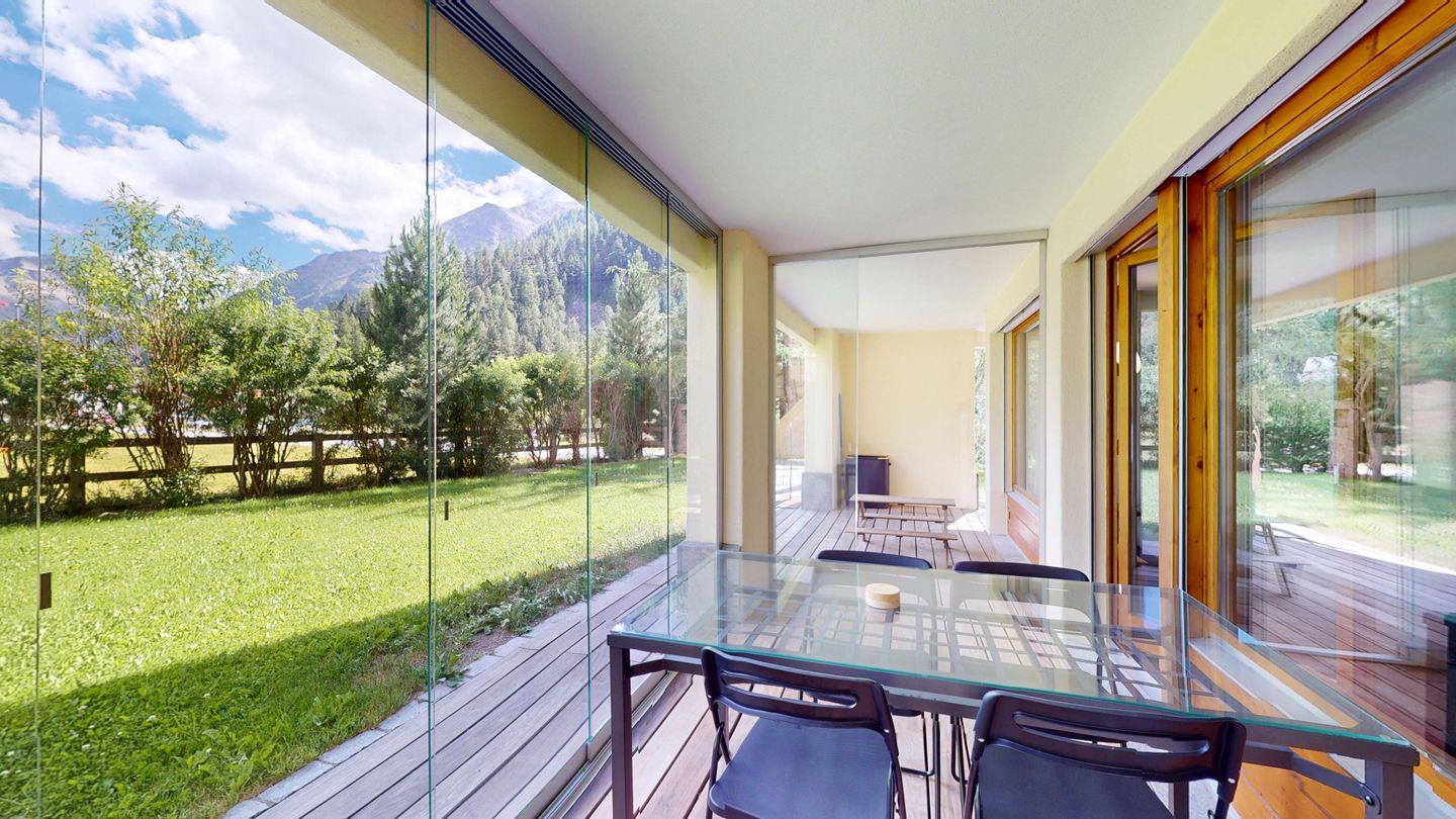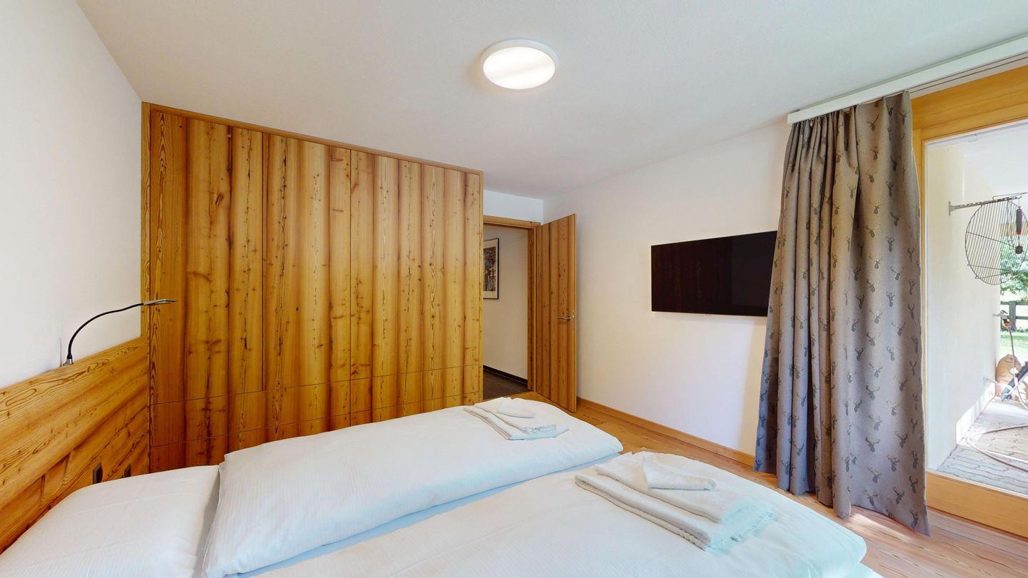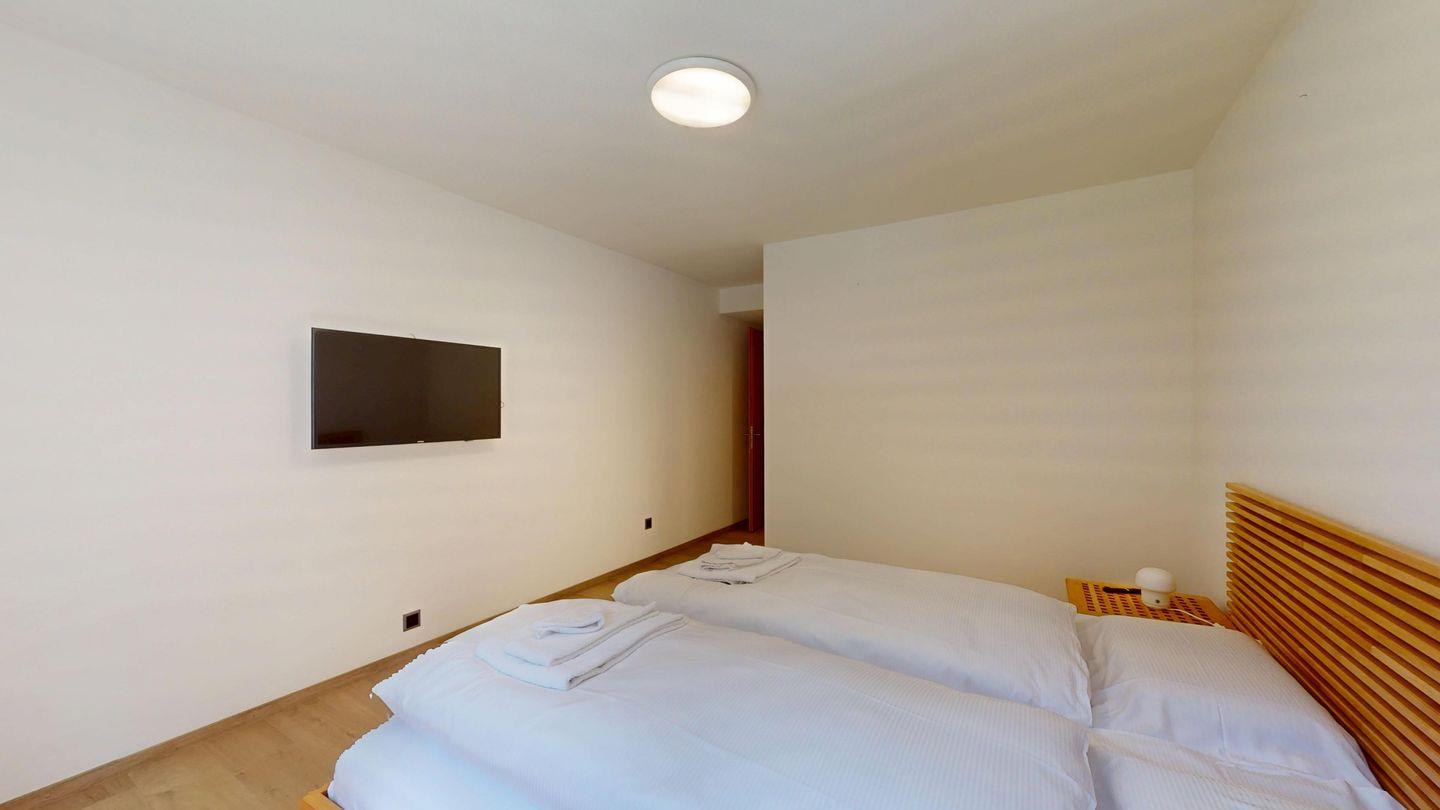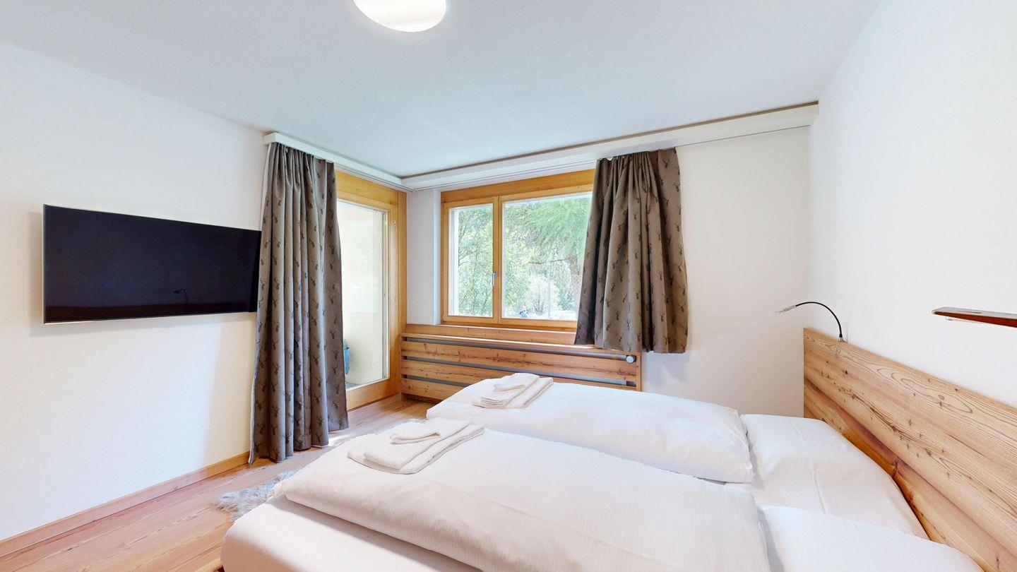 Moderne und sehr geschmackvoll eingerichtete 4½-Zimmerwohnung im Erdgeschoss. Eingang mit Garderobe. Wohnzimmer mit TV, Schwedenofen und Ausgang auf die Terrasse. Offene Küche mit Essbereich, Induktionsherd, Geschirrspüler und Ausgang zum Wintergarten. Zwei Doppelzimmer mit TV, eines mit Ausgang zum Balkon, eines mit begehbarem Kleiderschrank. Ein Schlafzimmer mit Etagenbett. Zwei Badezimmer mit Dusche, WC, Lavabo. Eigene Waschmaschine und Tumbler. Ein Garagenstellplatz ist ebenfalls vorhanden. Haustiere sind nicht erlaubt.