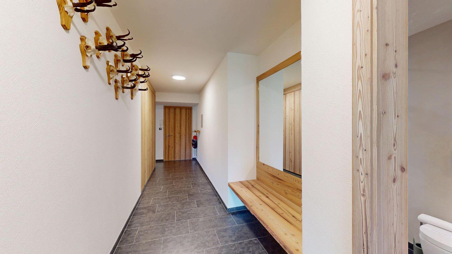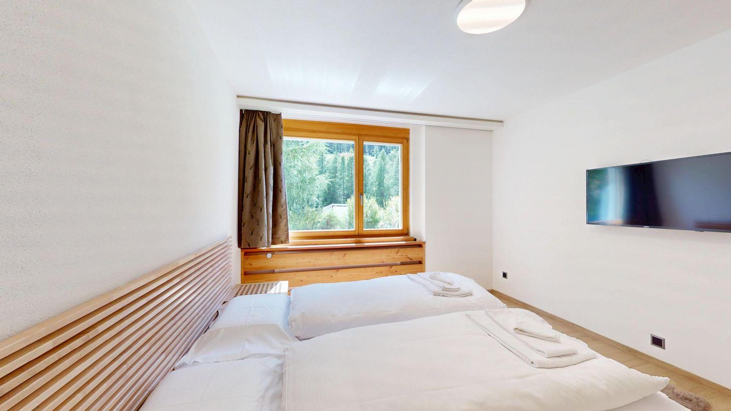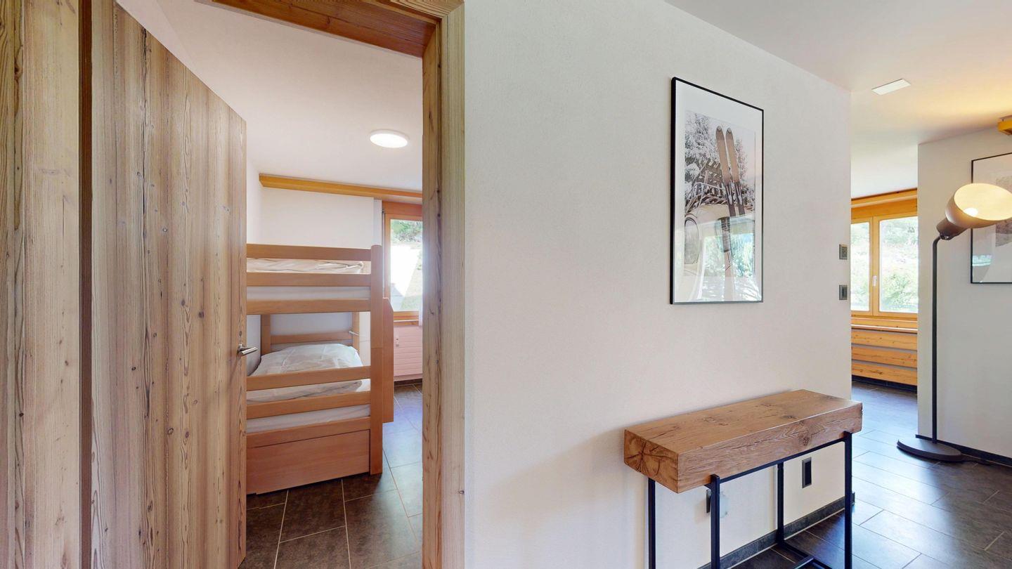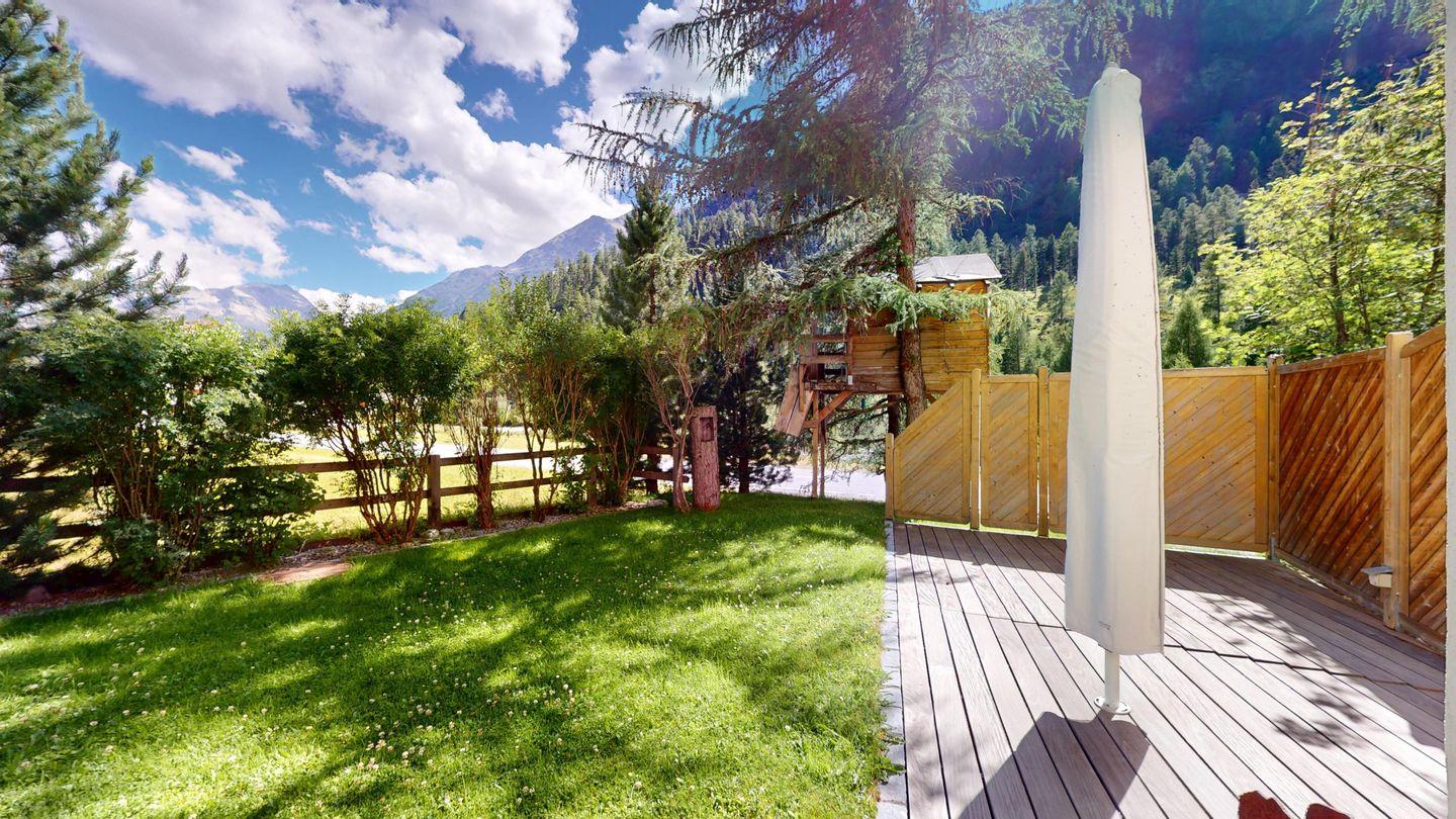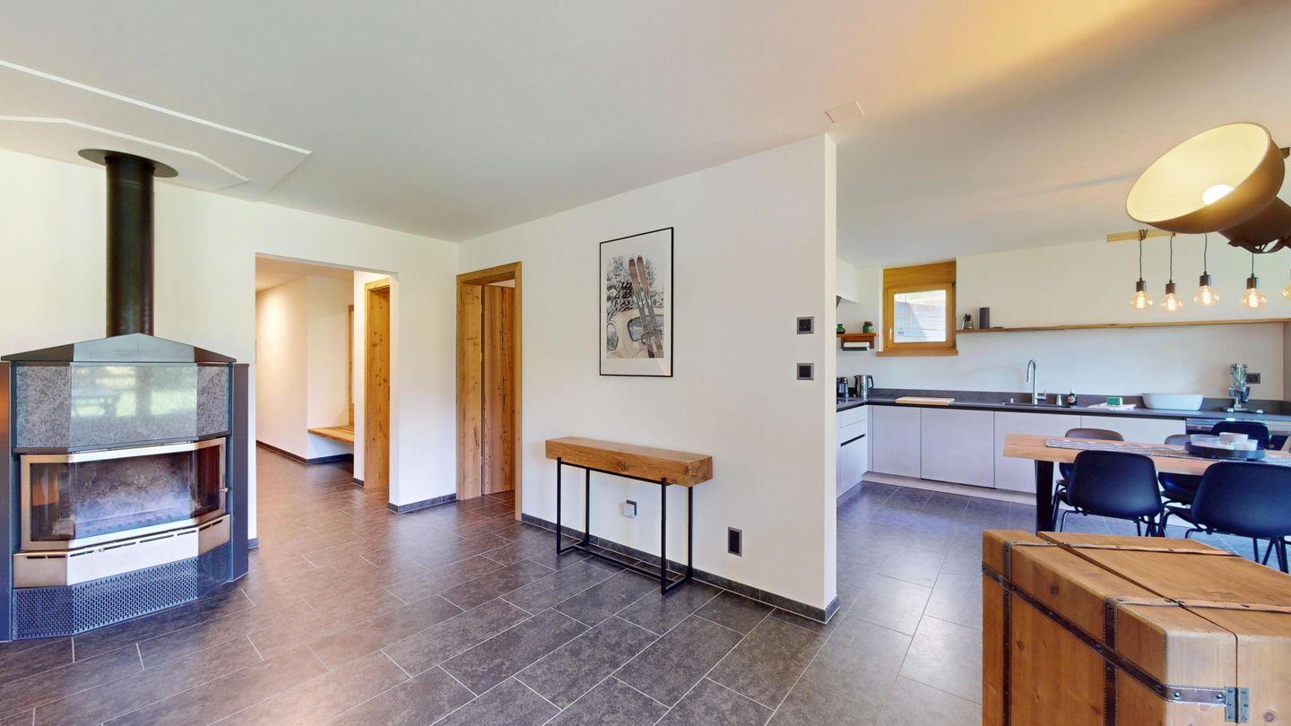 Moderne und sehr geschmackvoll eingerichtete 4½-Zimmerwohnung im Erdgeschoss. Eingang mit Garderobe. Wohnzimmer mit TV, Schwedenofen und Ausgang auf die Terrasse. Offene Küche mit Essbereich, Induktionsherd, Geschirrspüler und Ausgang zum Wintergarten. Zwei Doppelzimmer mit TV, eines mit Ausgang zum Balkon, eines mit begehbarem Kleiderschrank. Ein Schlafzimmer mit Etagenbett. Zwei Badezimmer mit Dusche, WC, Lavabo. Eigene Waschmaschine und Tumbler. Ein Garagenstellplatz ist ebenfalls vorhanden. Haustiere sind nicht erlaubt.