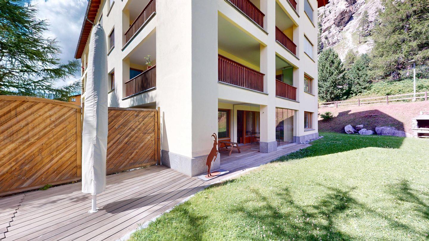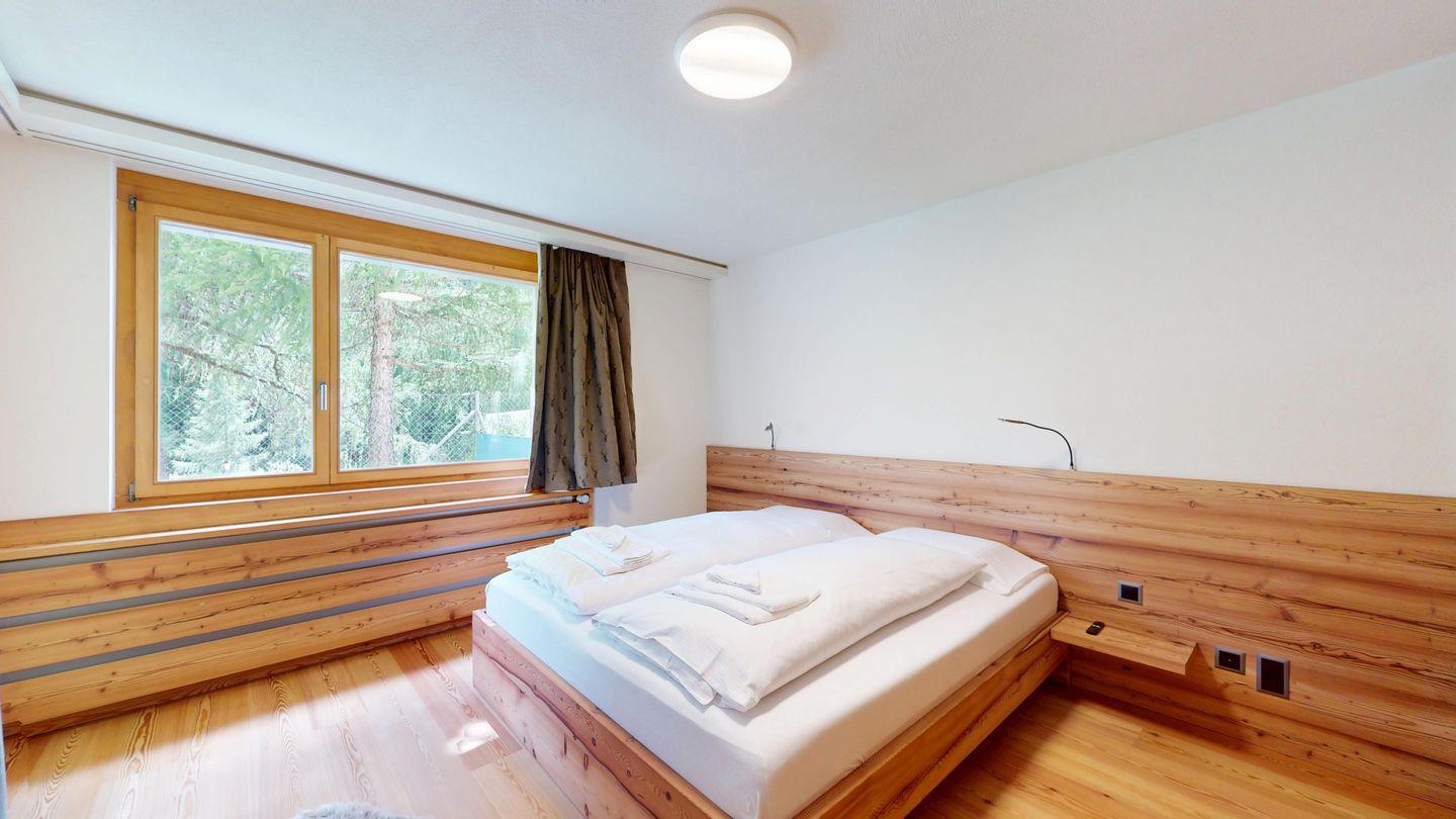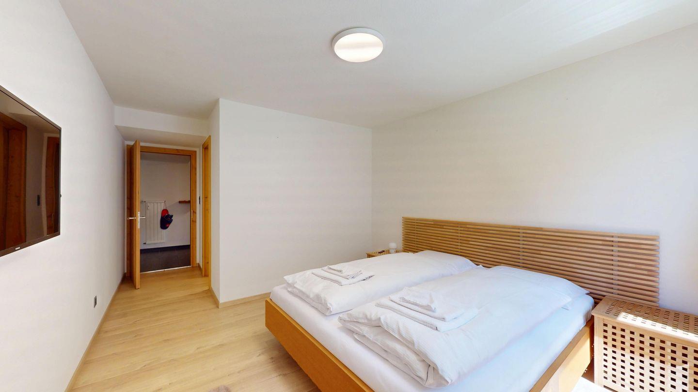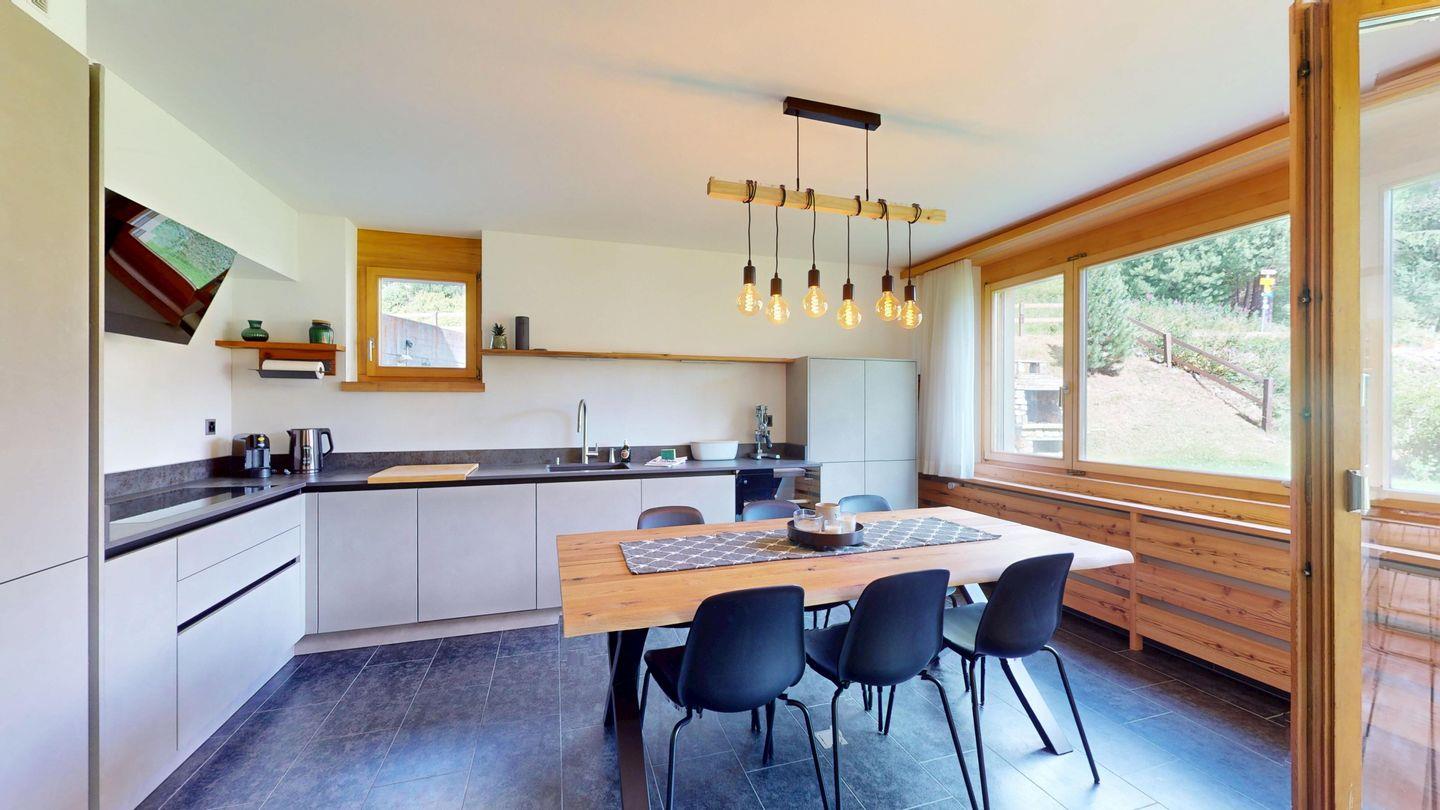 Moderne und sehr geschmackvoll eingerichtete 4½-Zimmerwohnung im Erdgeschoss. Eingang mit Garderobe. Wohnzimmer mit TV, Schwedenofen und Ausgang auf die Terrasse. Offene Küche mit Essbereich, Induktionsherd, Geschirrspüler und Ausgang zum Wintergarten. Zwei Doppelzimmer mit TV, eines mit Ausgang zum Balkon, eines mit begehbarem Kleiderschrank. Ein Schlafzimmer mit Etagenbett. Zwei Badezimmer mit Dusche, WC, Lavabo. Eigene Waschmaschine und Tumbler. Ein Garagenstellplatz ist ebenfalls vorhanden. Haustiere sind nicht erlaubt.