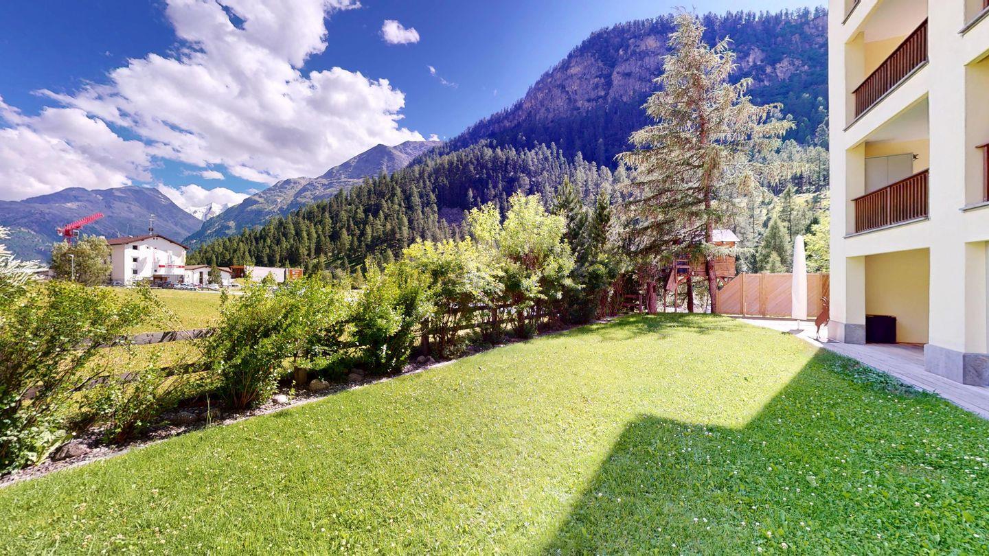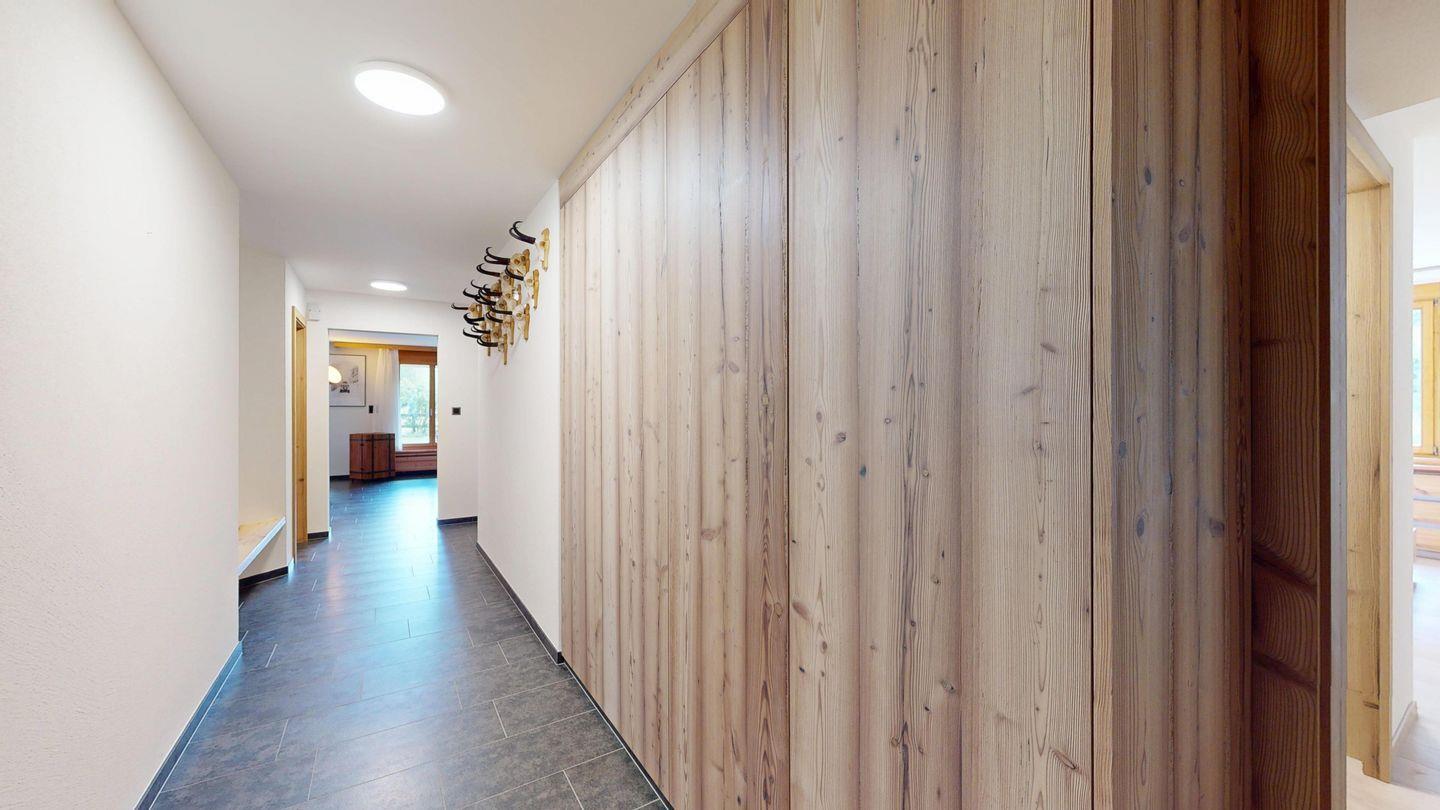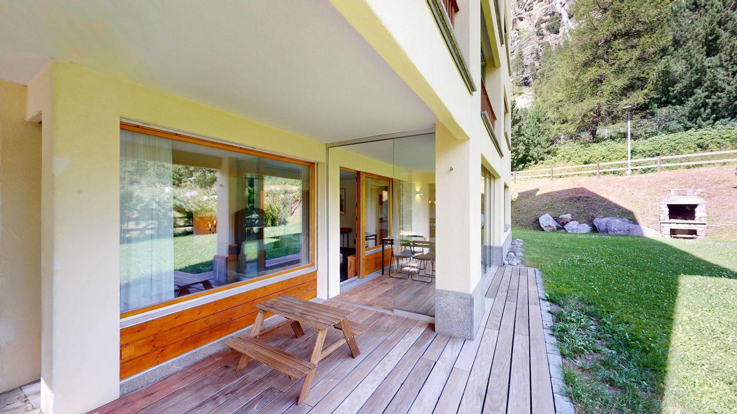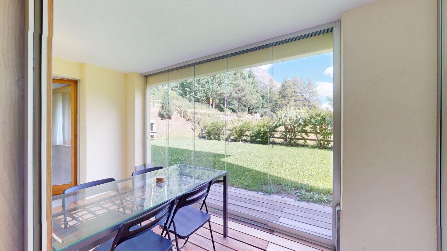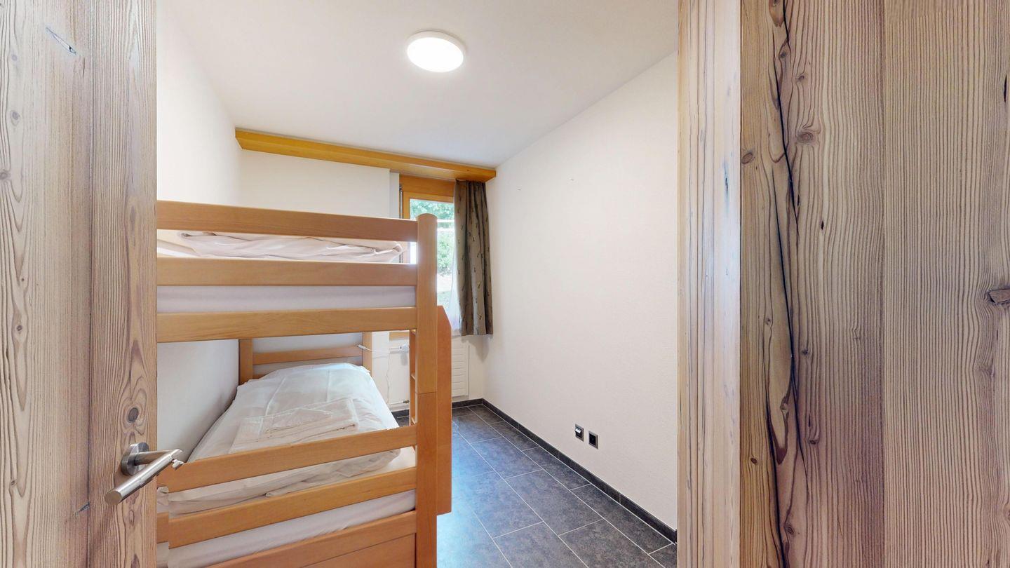 Moderne und sehr geschmackvoll eingerichtete 4½-Zimmerwohnung im Erdgeschoss. Eingang mit Garderobe. Wohnzimmer mit TV, Schwedenofen und Ausgang auf die Terrasse. Offene Küche mit Essbereich, Induktionsherd, Geschirrspüler und Ausgang zum Wintergarten. Zwei Doppelzimmer mit TV, eines mit Ausgang zum Balkon, eines mit begehbarem Kleiderschrank. Ein Schlafzimmer mit Etagenbett. Zwei Badezimmer mit Dusche, WC, Lavabo. Eigene Waschmaschine und Tumbler. Ein Garagenstellplatz ist ebenfalls vorhanden. Haustiere sind nicht erlaubt.