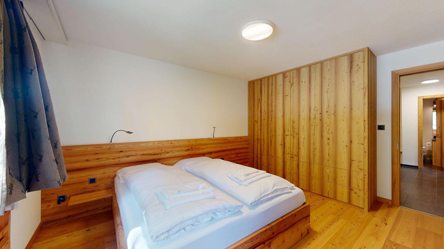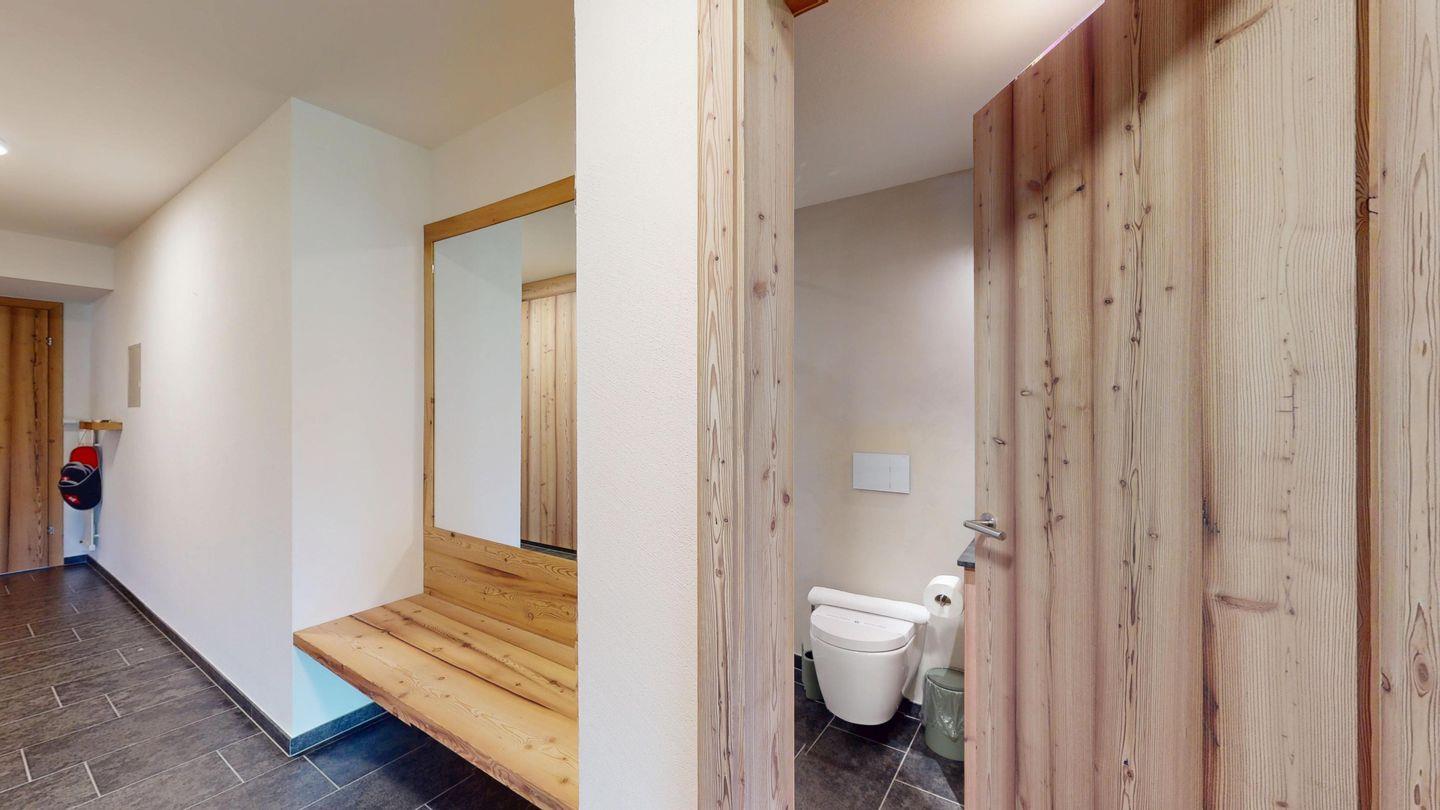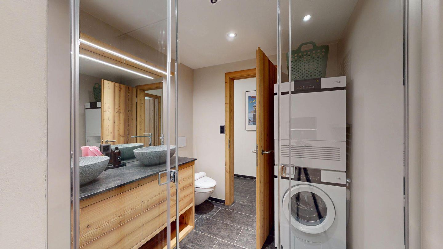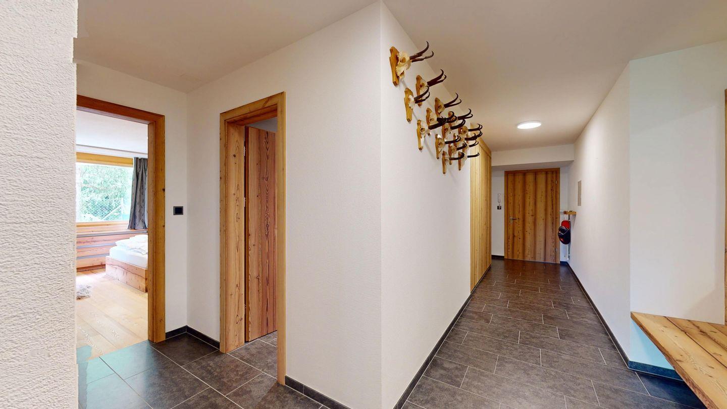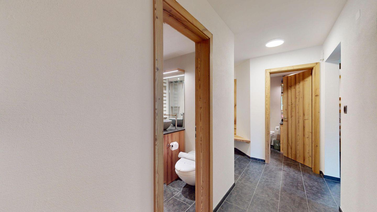 Moderne und sehr geschmackvoll eingerichtete 4½-Zimmerwohnung im Erdgeschoss. Eingang mit Garderobe. Wohnzimmer mit TV, Schwedenofen und Ausgang auf die Terrasse. Offene Küche mit Essbereich, Induktionsherd, Geschirrspüler und Ausgang zum Wintergarten. Zwei Doppelzimmer mit TV, eines mit Ausgang zum Balkon, eines mit begehbarem Kleiderschrank. Ein Schlafzimmer mit Etagenbett. Zwei Badezimmer mit Dusche, WC, Lavabo. Eigene Waschmaschine und Tumbler. Ein Garagenstellplatz ist ebenfalls vorhanden. Haustiere sind nicht erlaubt.