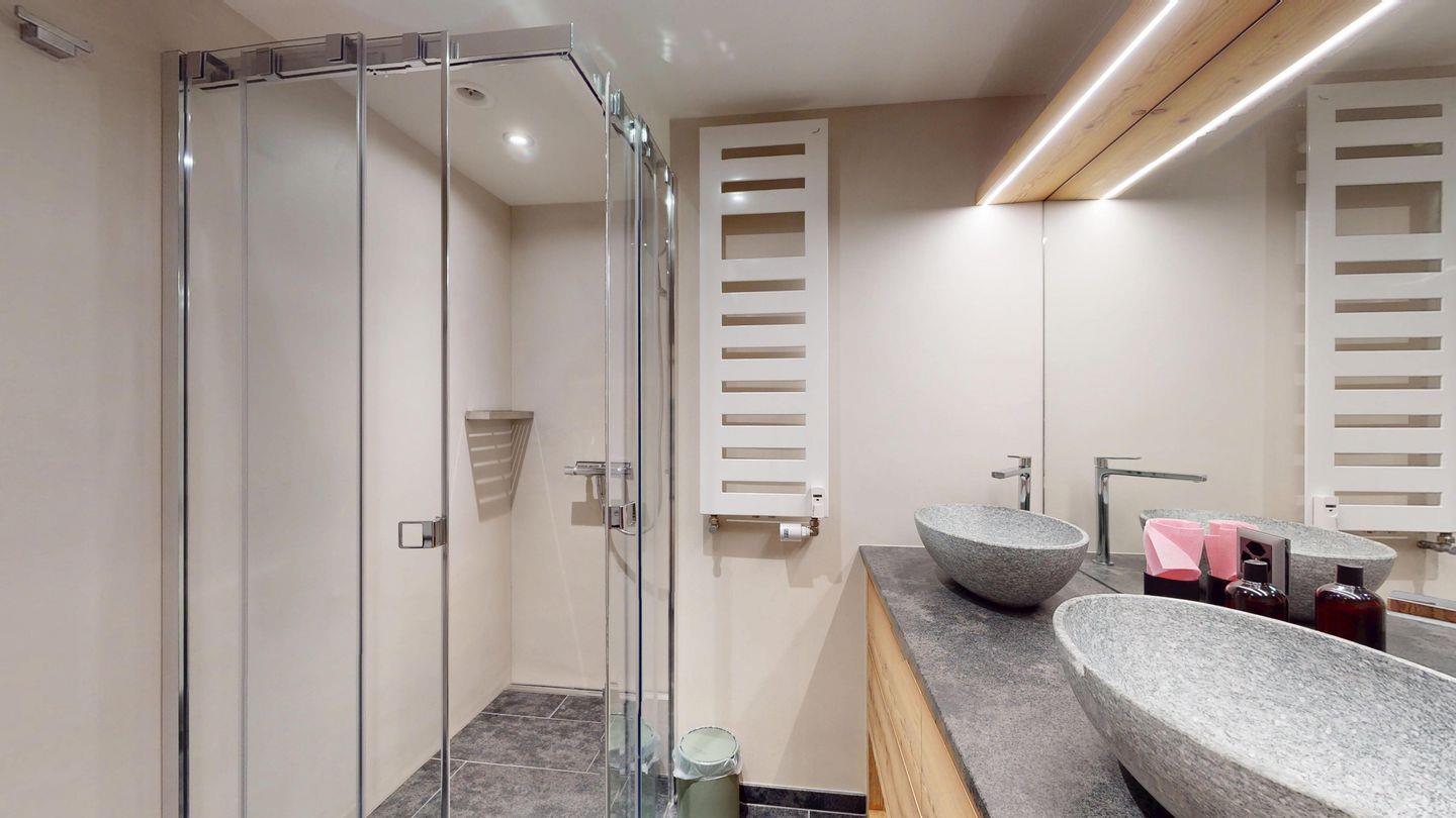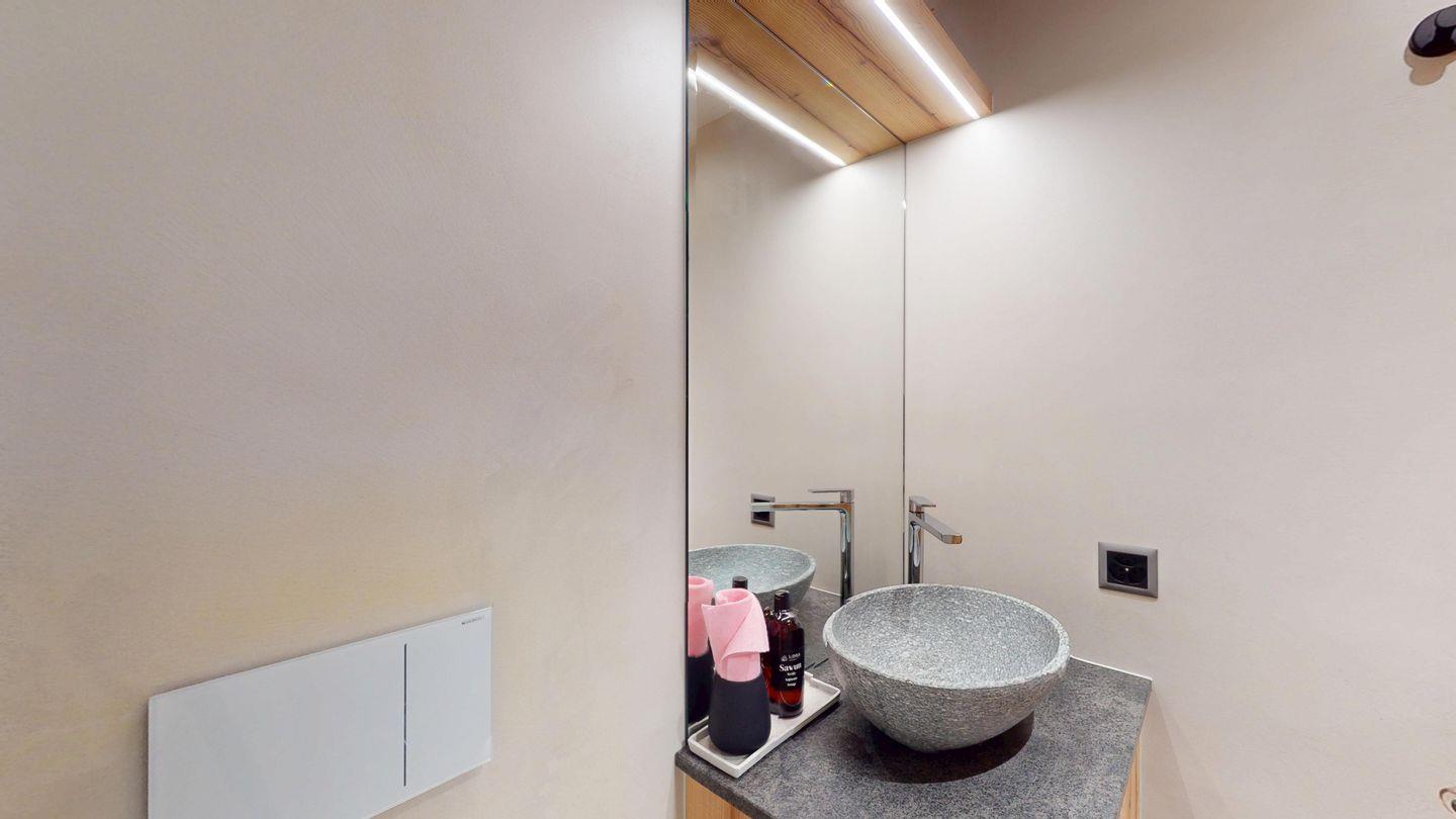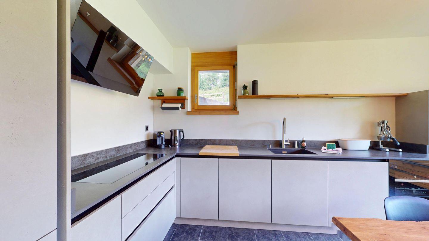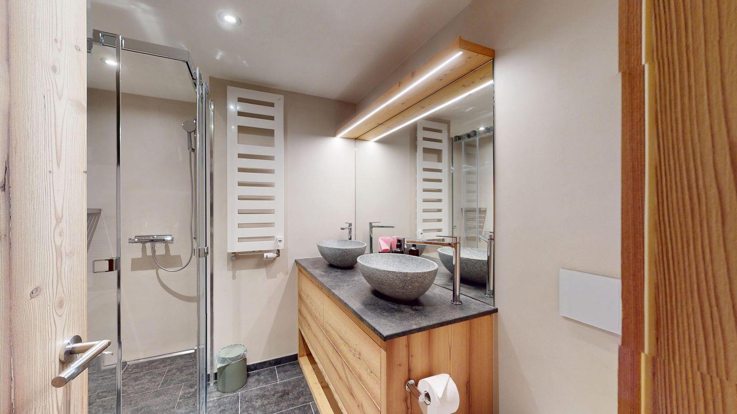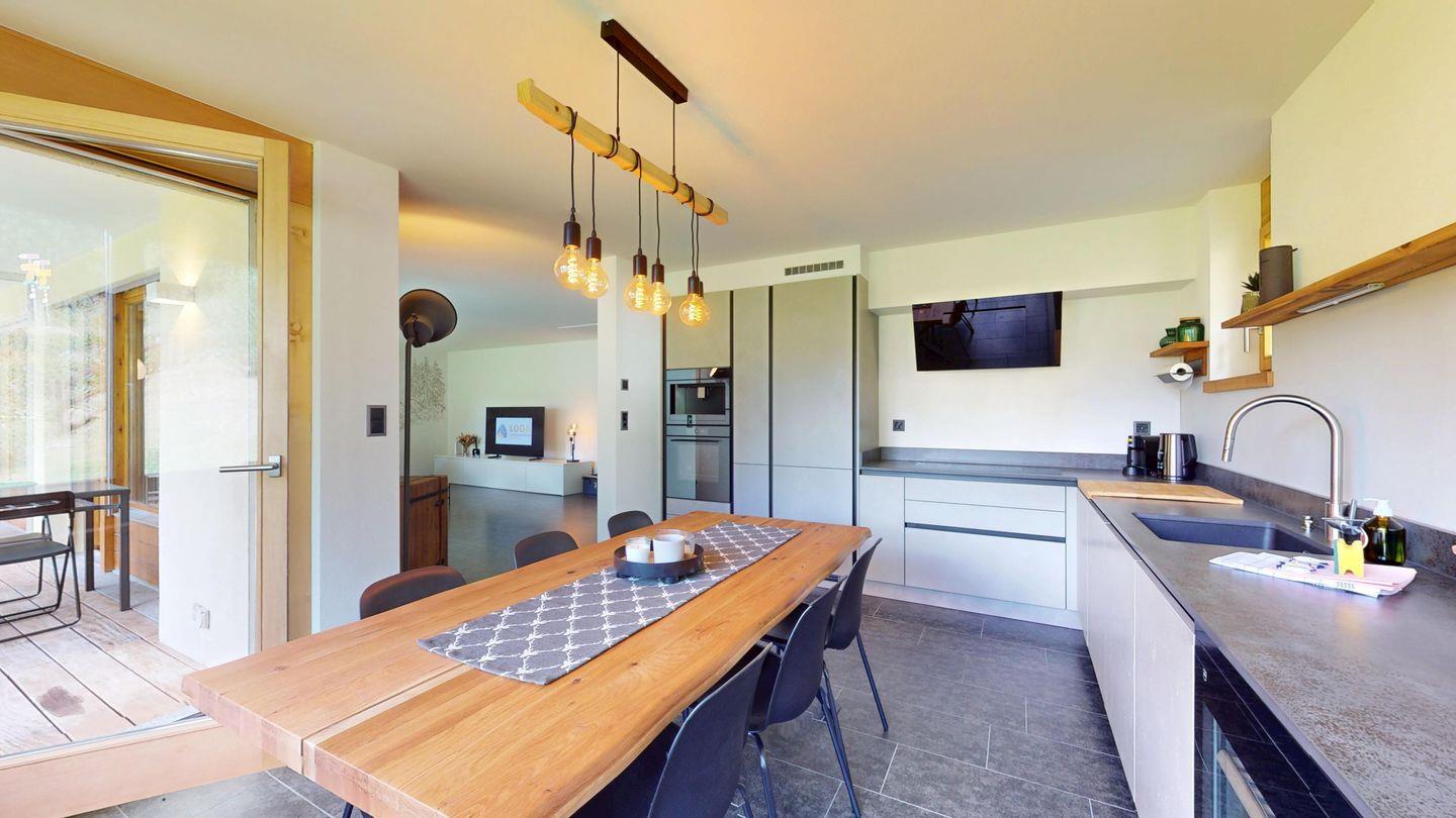Moderne und sehr geschmackvoll eingerichtete 4½-Zimmerwohnung im Erdgeschoss. Eingang mit Garderobe. Wohnzimmer mit TV, Schwedenofen und Ausgang auf die Terrasse. Offene Küche mit Essbereich, Induktionsherd, Geschirrspüler und Ausgang zum Wintergarten. Zwei Doppelzimmer mit TV, eines mit Ausgang zum Balkon, eines mit begehbarem Kleiderschrank. Ein Schlafzimmer mit Etagenbett. Zwei Badezimmer mit Dusche, WC, Lavabo. Eigene Waschmaschine und Tumbler. Ein Garagenstellplatz ist ebenfalls vorhanden. Haustiere sind nicht erlaubt.