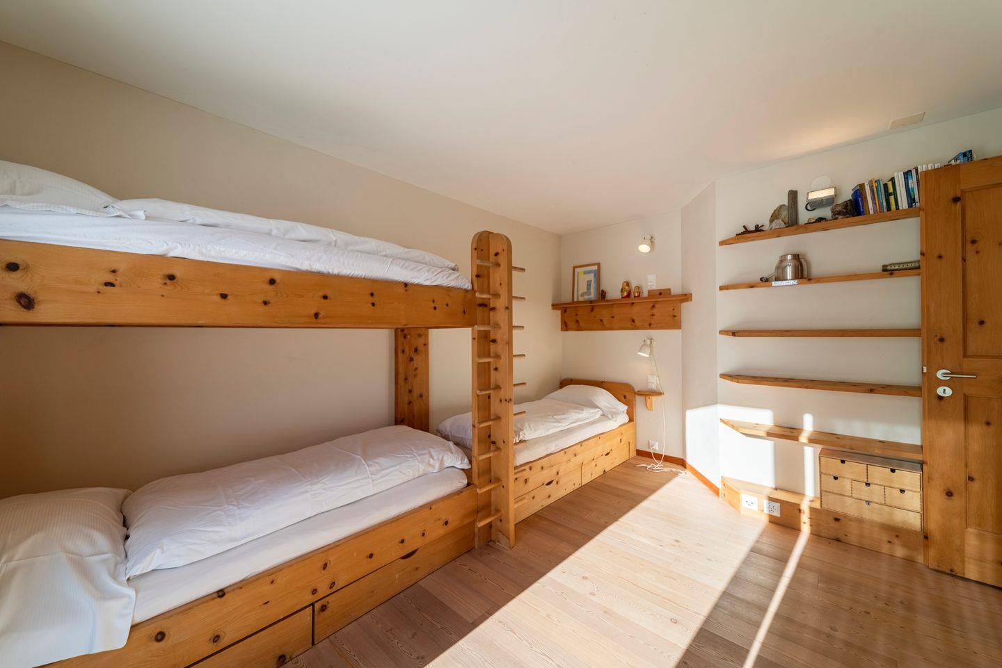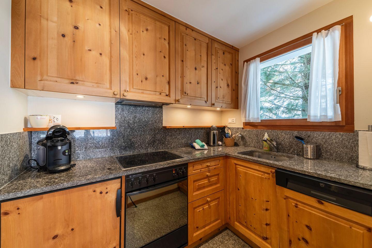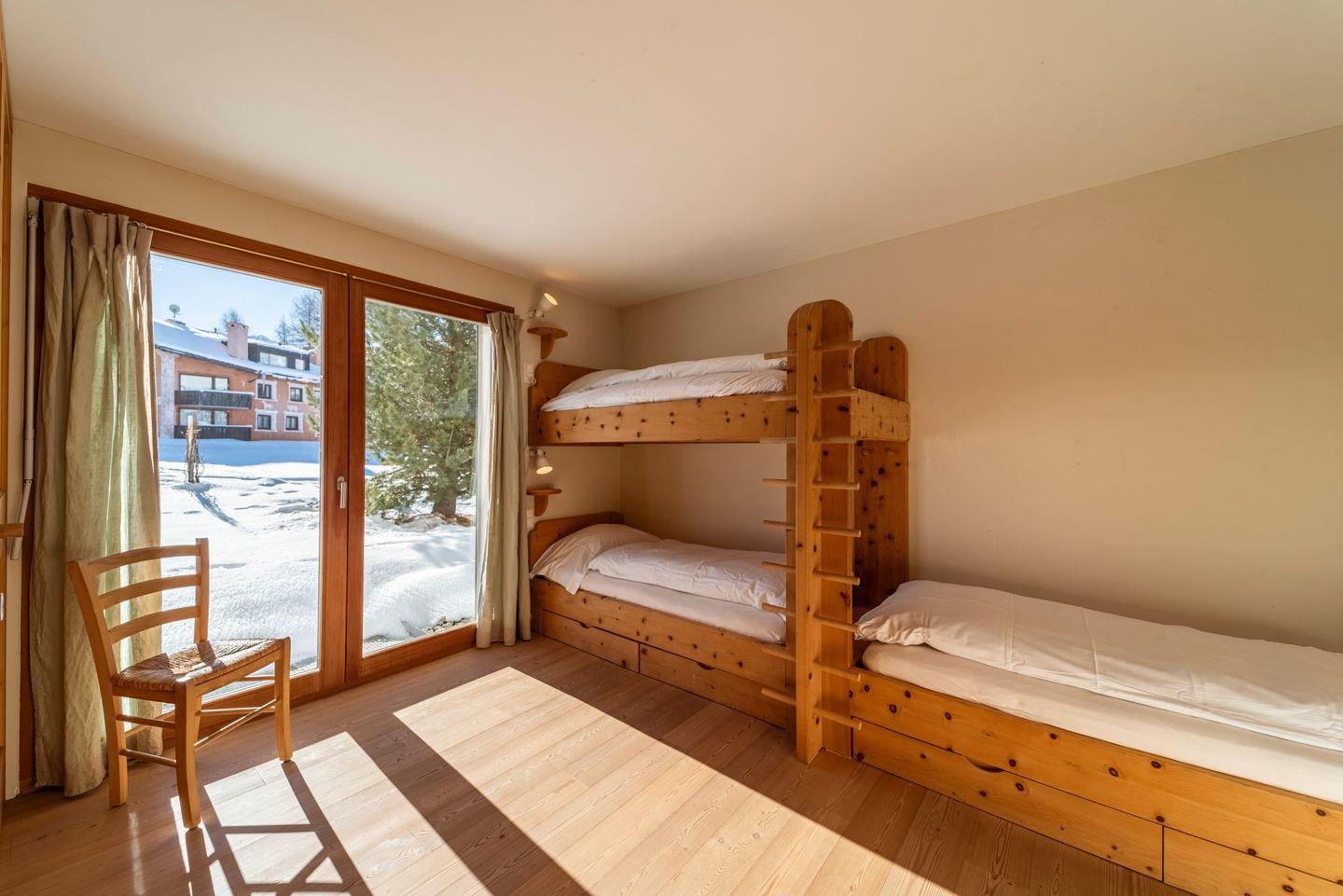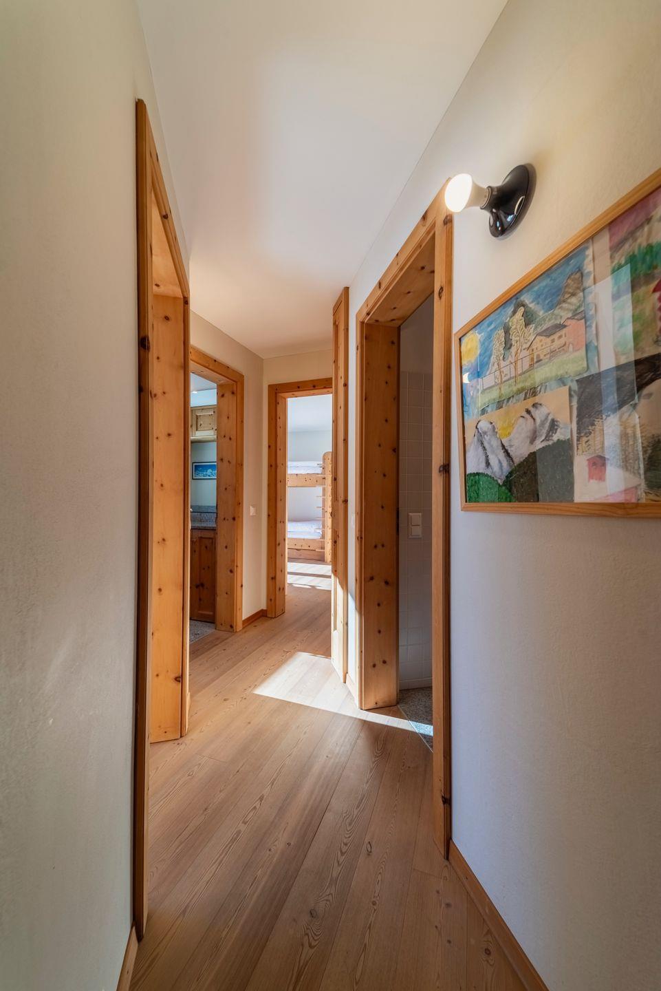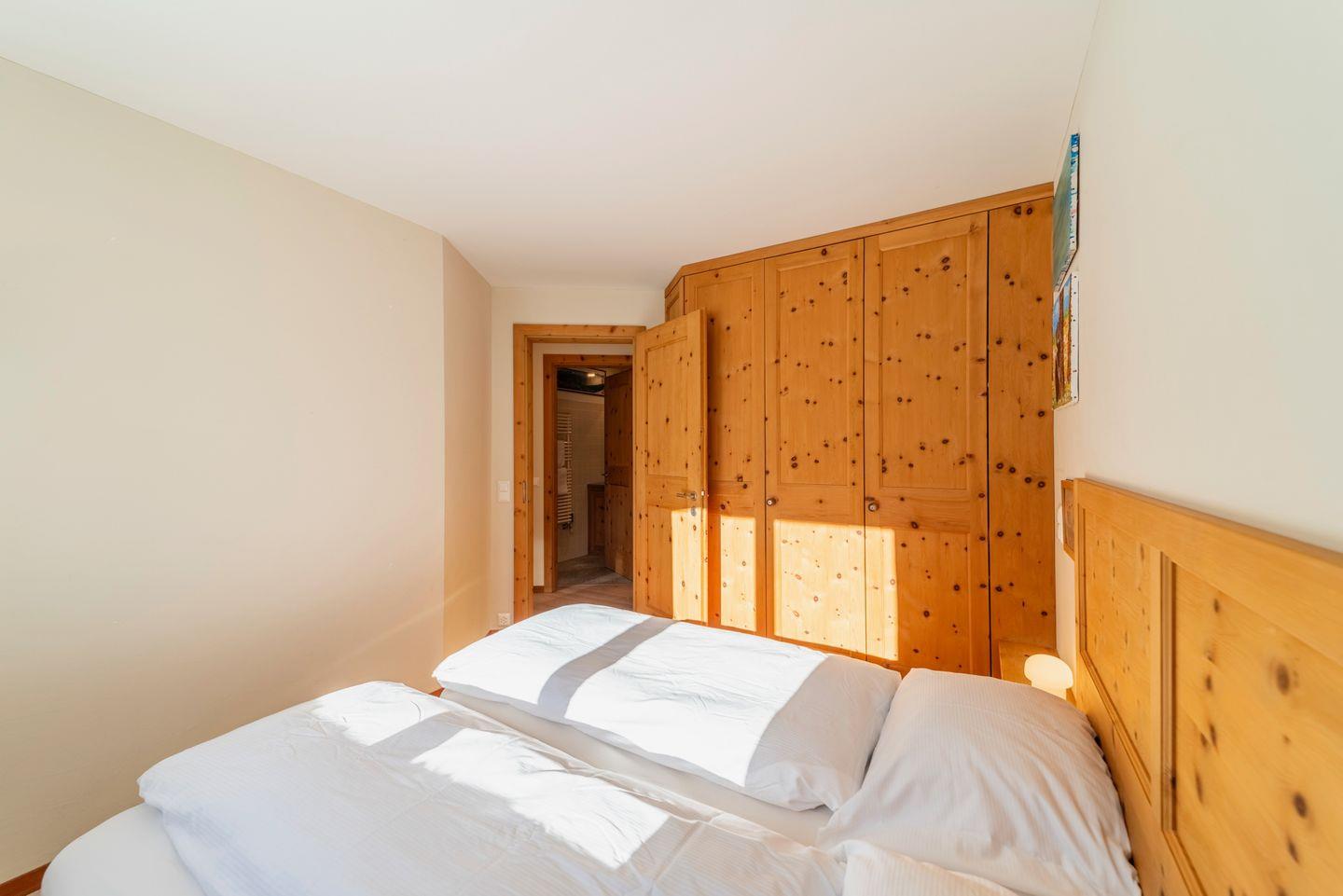 3½-Zimmerwohnung im Erdgeschoss mit Lift. Eingang mit Garderobe, Wohn- / Essbereich, TV, Ausgang zur Terrasse. Halboffene Küche mit Backofen, Geschirrspüler und Kühlschrank. 1 Zimmer mit Doppelbett. 1 Zimmer mit einem Etagenbett und einem Einzelbett. Badezimmer mit Badewanne, Toilette und Waschbecken. Ein Parkplatz in der Garage. Gemeinschaftliche Waschküche und Skiraum. Nichtraucherwohnung. Haustiere sind nicht erlaubt.