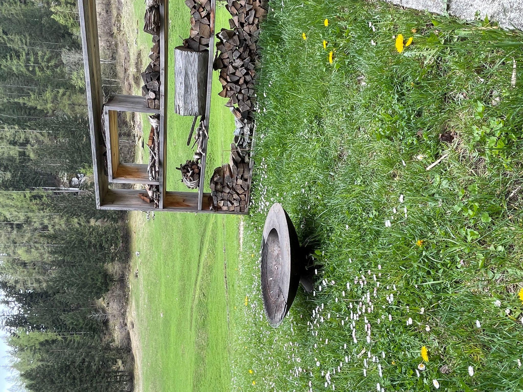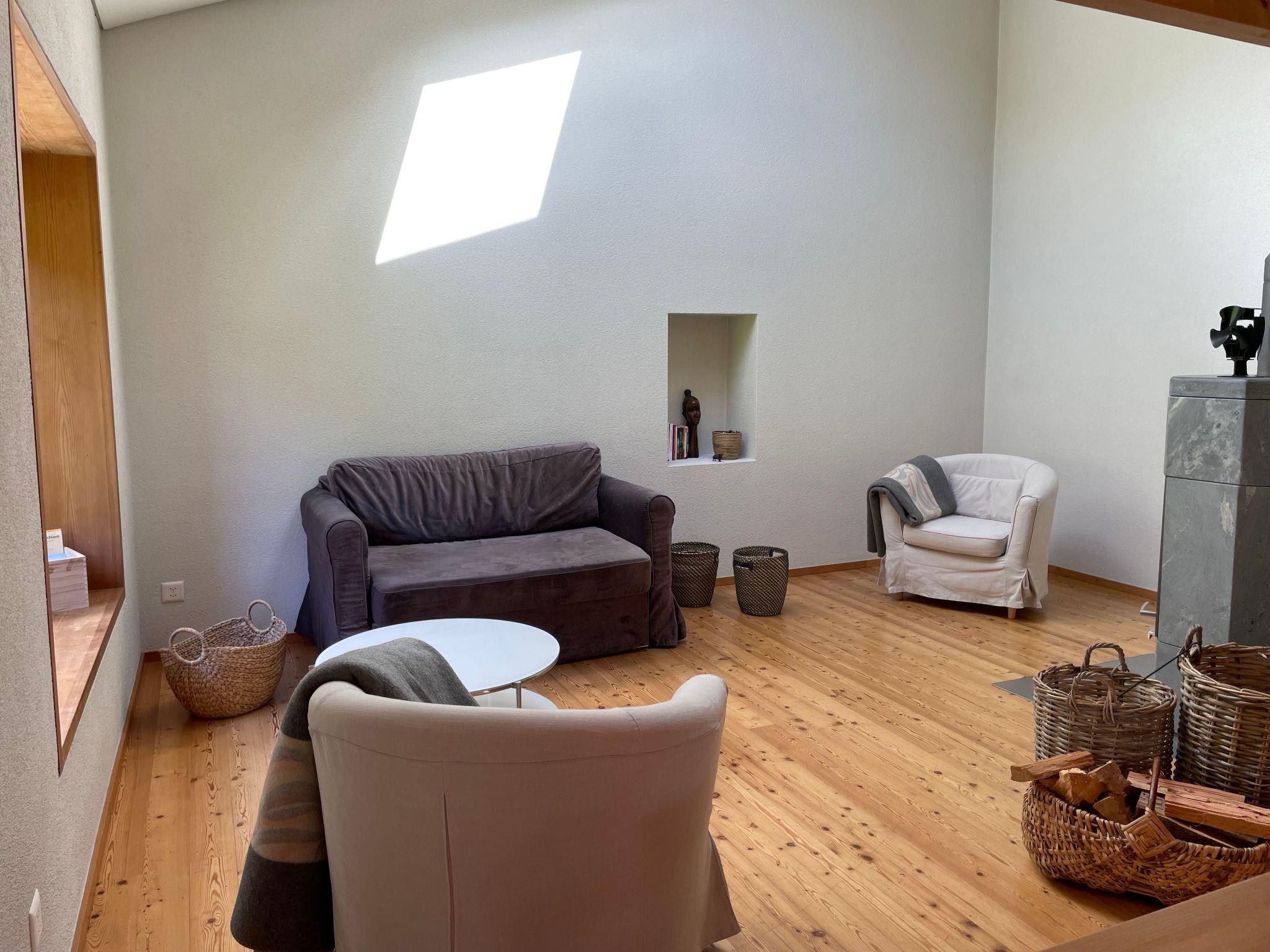 In the outdoor area of the Maiensäss, you will be welcomed by a lovingly landscaped garden for your exclusive use. The renovation of the outdoor area in 2021 with new chairs, table, parasol and a barbecue invites you to spend cosy hours outdoors. The landscaped car park and the provided wood boxes for firewood provide practical amenities during your stay.
