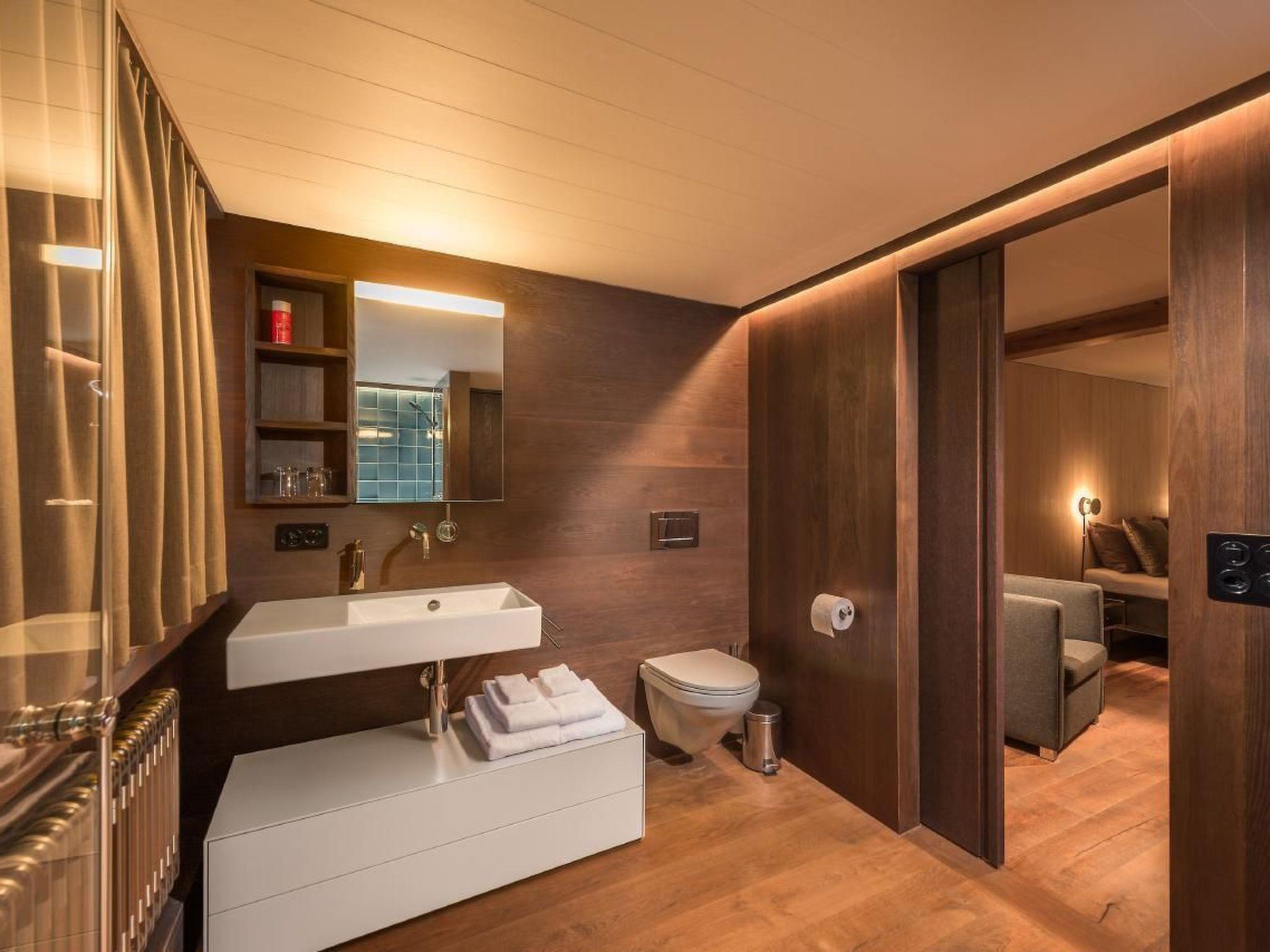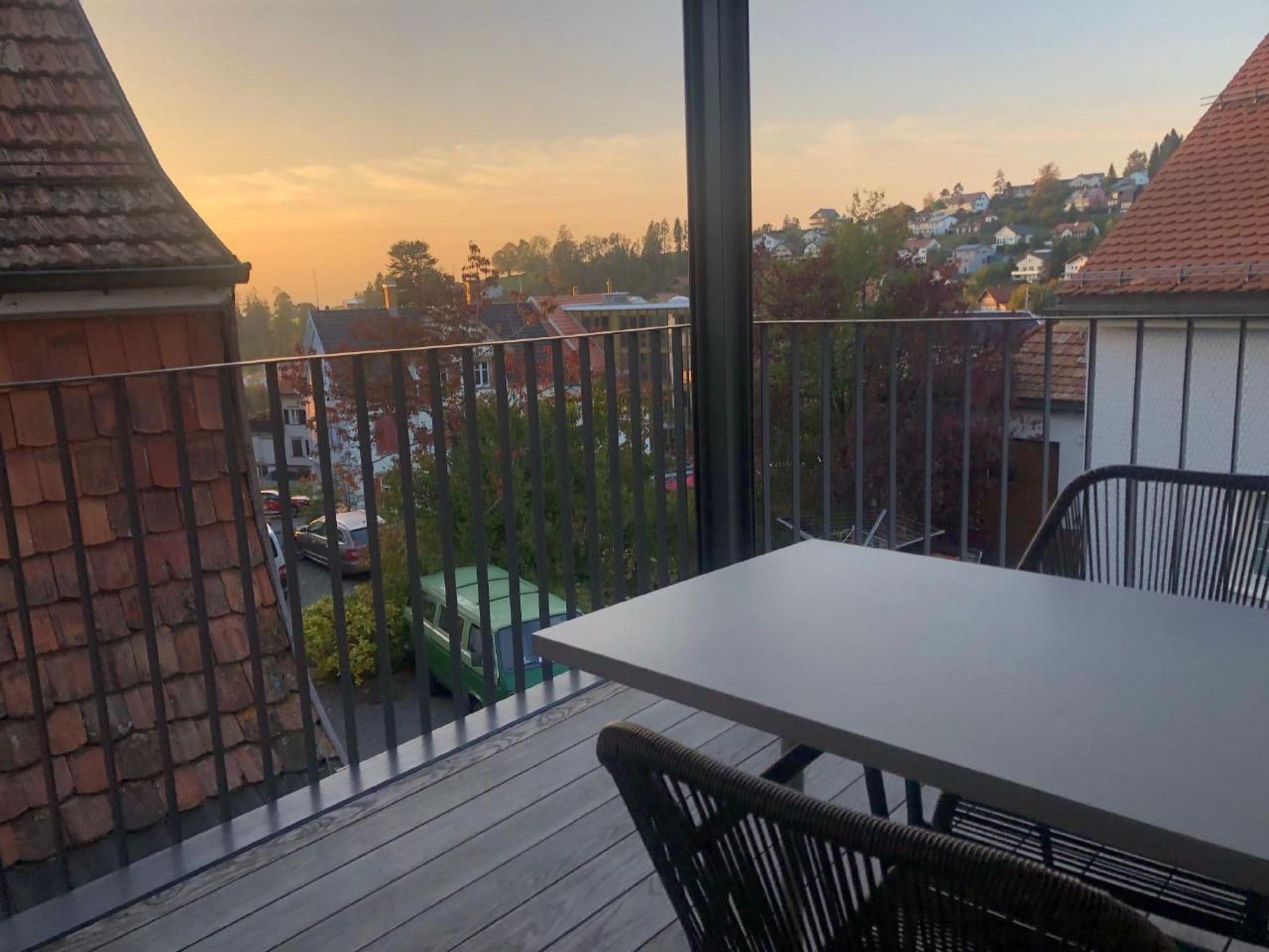 Spending the night here, with a unique view over the Appenzellerland as far as the Säntis, is an experience at any time of year.in the stylishly renovated, listed building on the historic village square of Rehetobel, old building fabric is combined with modernity. The stately five-storey building has served several purposes in its 230 years. Where there is now a pretty pub, the "Gasthaus Dorf5" with a beautiful garden, invites you to linger, there used to be the Rehetobel post office. The upper floors, which were used as a telegraph office and business premises, now house three flats with a high standard of finish. The spacious, light-flooded flat offers a 180-degree view, a beautiful balcony and a spacious living room with a fireplace. The bathroom and bedroom with dressing room and the open-plan kitchen are furnished to a high standard. The natural building fabric with historic parquet floors and selected materials are of a high aesthetic standard. The technical equipment and the special lighting concept leave nothing to be desired, and the central location in the Appenzeller Vorderland is ideal for exploring the Alpstein region, the nearby Lake Constance region and the extremely attractive city of St.Gallen. The flat offers plenty of space for two people and there are many cosy places to relax. Cooking in the modern kitchen is a pleasure - or would you prefer to be spoilt in the "Beizli" downstairs? for more than two people we recommend the flat "Kronbergblick" or "Säntispanorama" in the same house.