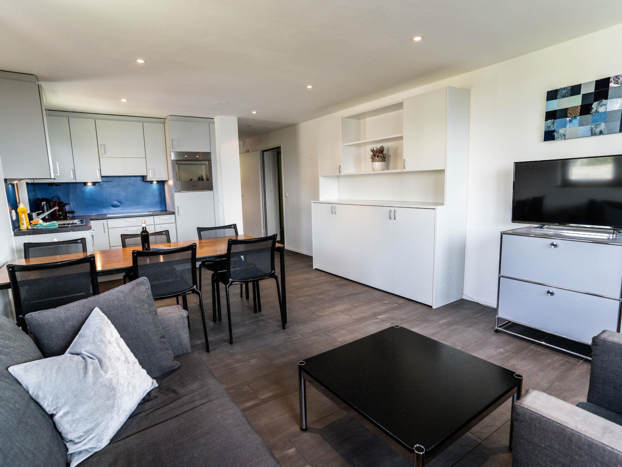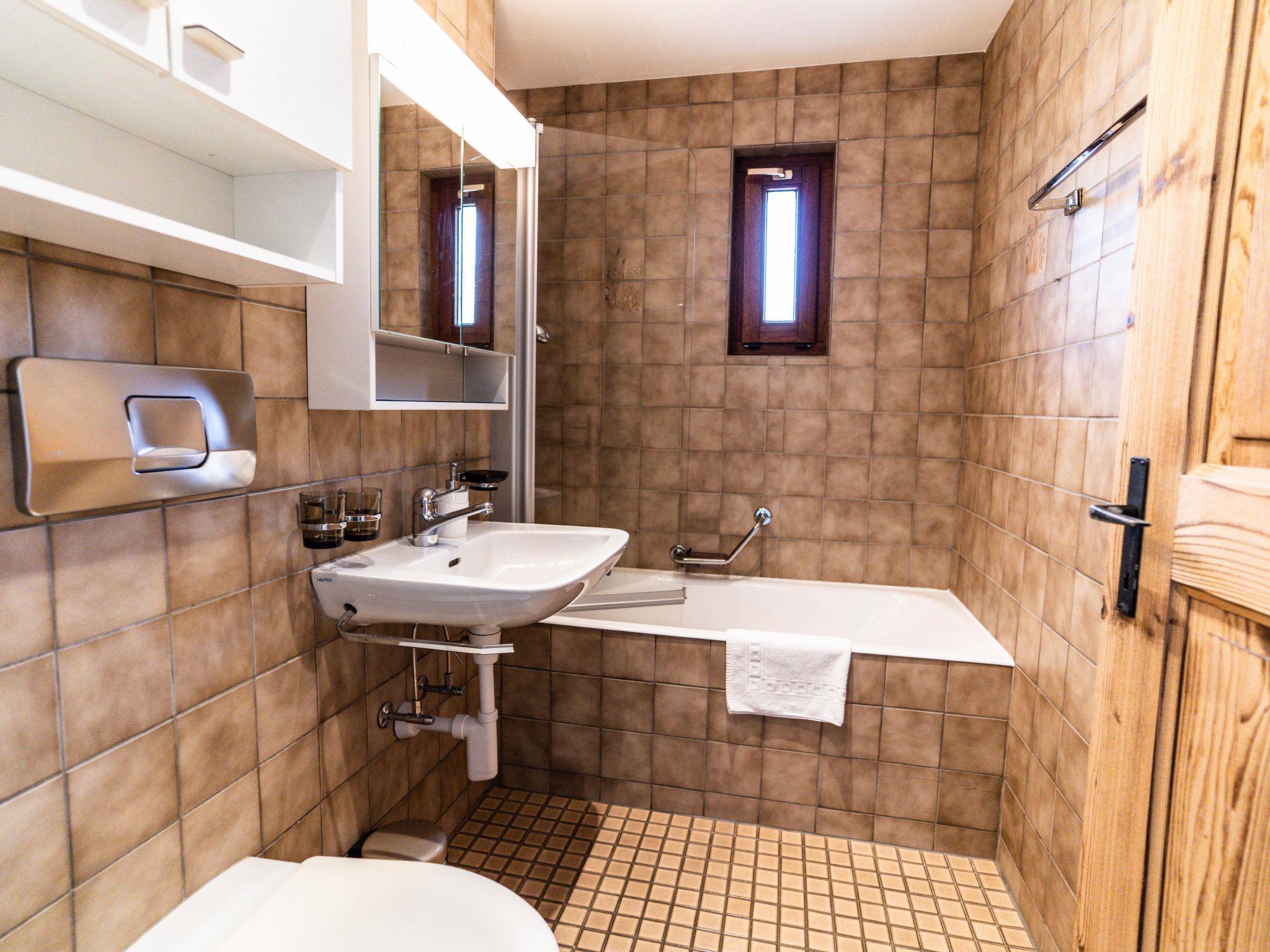 The apartment on the 3rd floor of the Sportina building accommodates 1 to 5 people and is cozy as well as modernly furnished. Two bedrooms with double beds, one of which has a separate shower/WC, ensure comfort. The living room has a dining table and a practical wall bed. The kitchen is equipped with a Nespresso coffee machine, dishwasher and other amenities. The bathroom includes a bathtub/WC. Underfloor heating, TV and free Wi-Fi are available. The south- and west-facing balcony with a table and chairs offers a view of the Valais Alps. The building has an elevator, a laundry room in the basement and a ski storage room with a boot dryer.