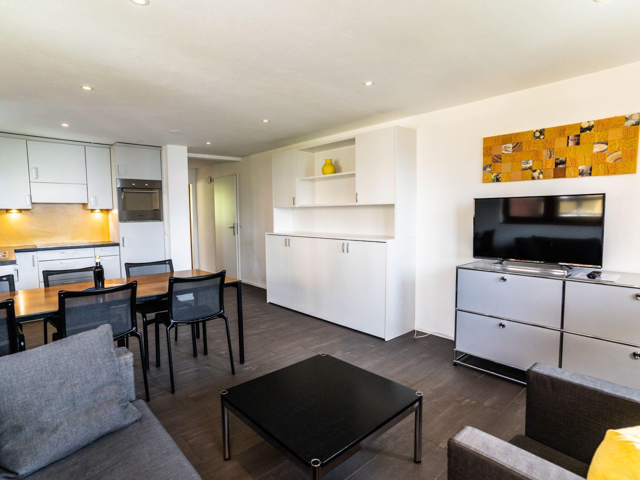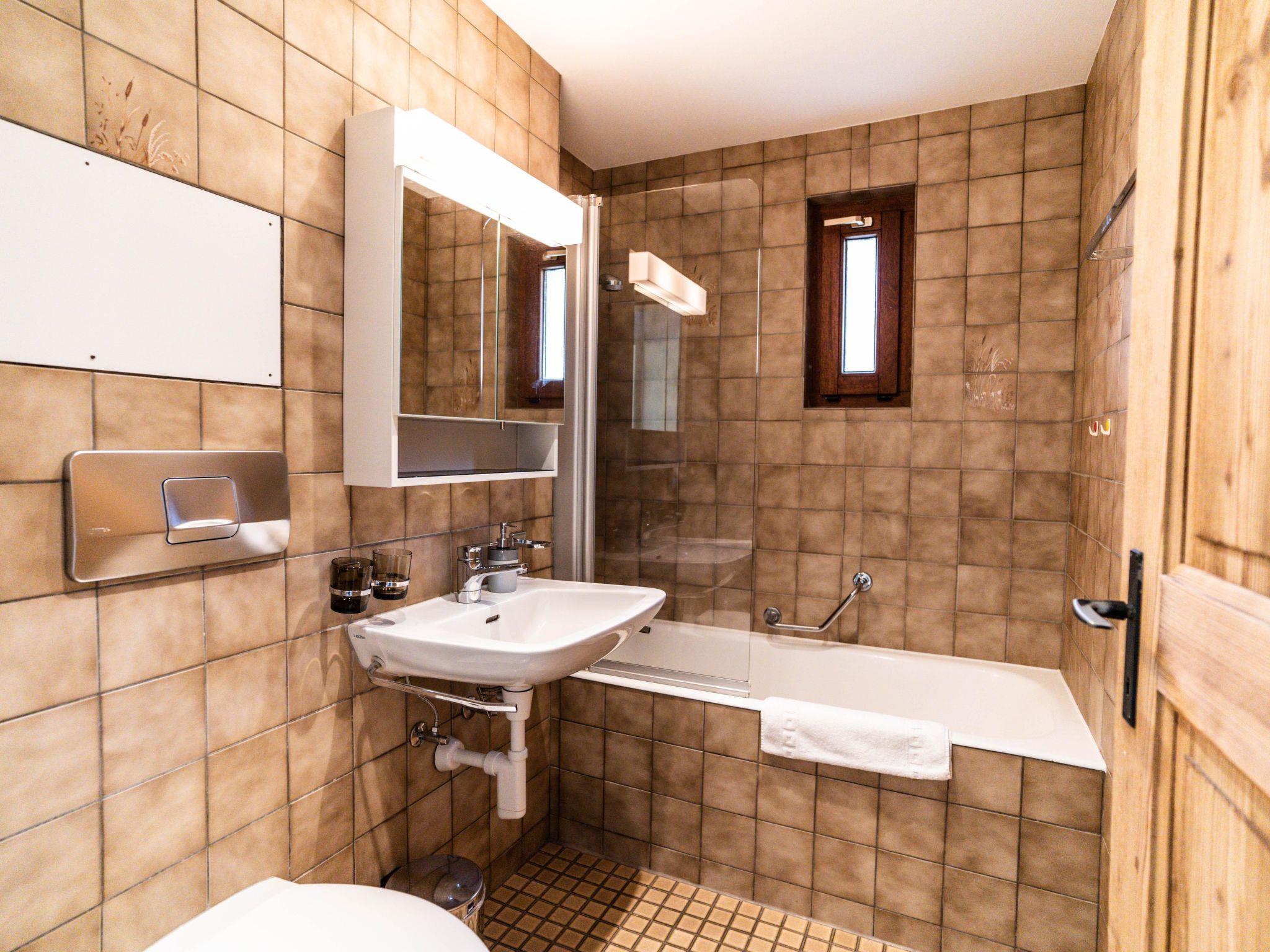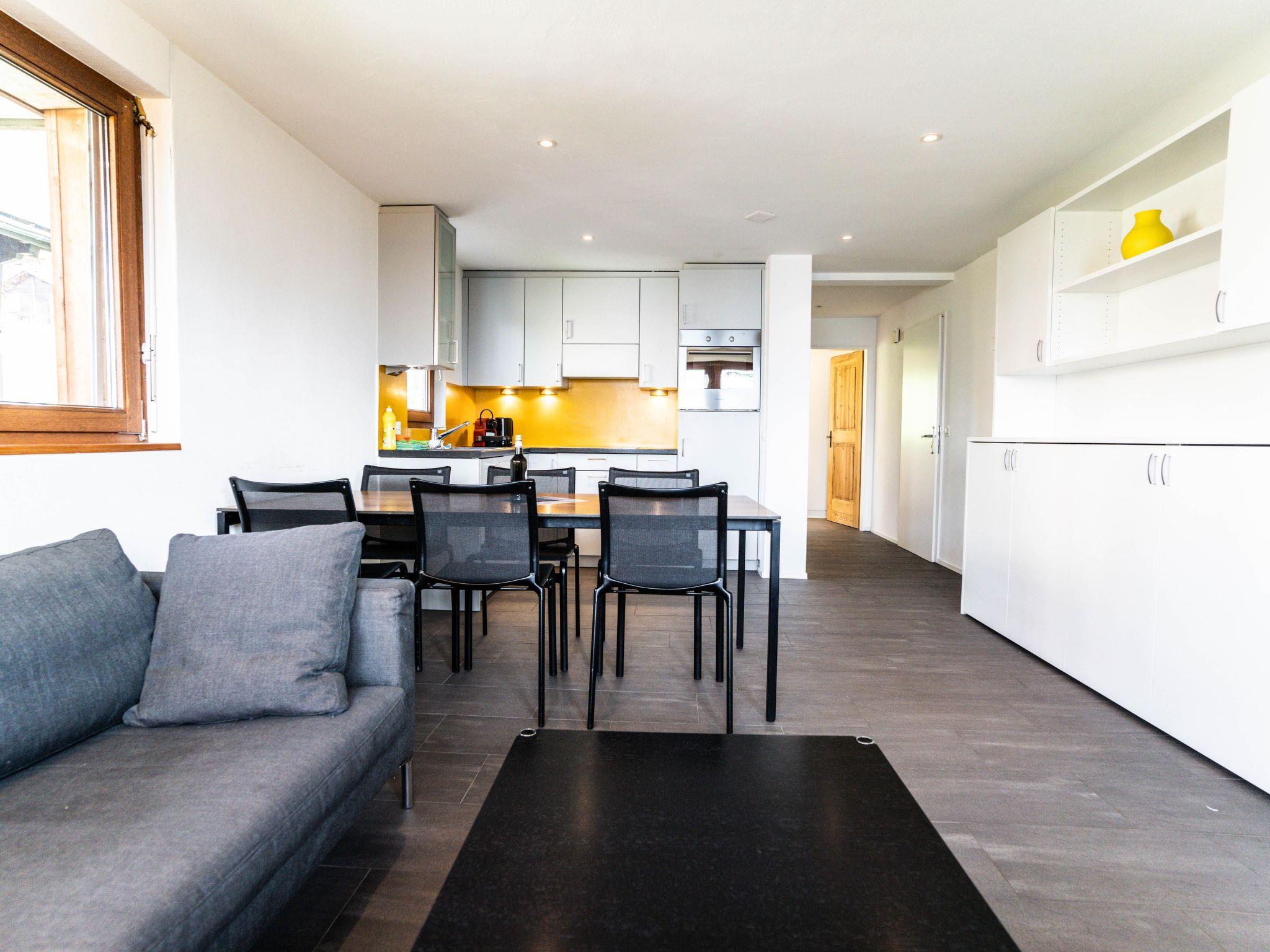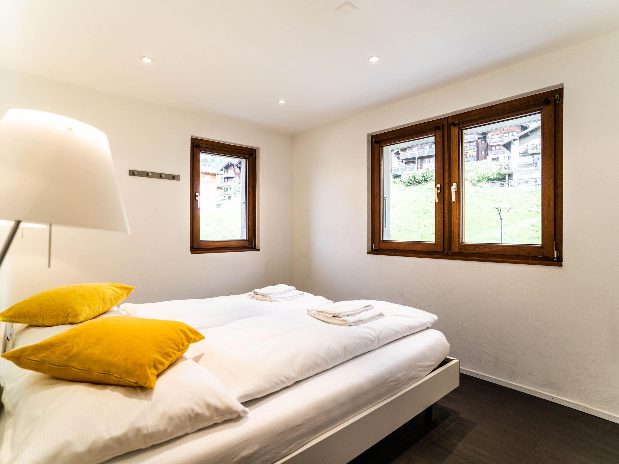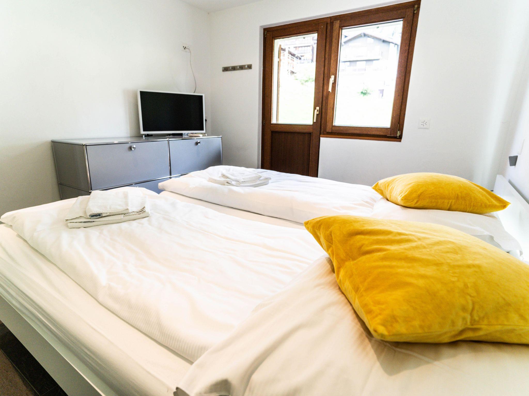 The apartments in the Sportina house are modern and comfortably furnished. All units feature a south and west balcony with a table and chairs, as well as views of the Valais Alps. The 3½-room apartment accommodates 1 to 5 people. It includes two bedrooms with double beds, one of which has its own shower and toilet. The living room has a dining table and a practical fold-down bed. The kitchen is equipped with a dishwasher and a Nespresso coffee machine. The bathroom has a bathtub and toilet. Additional amenities include underfloor heating, TV, free Wi-Fi, as well as a ski storage room with a boot dryer and a laundry room in the basement. A lift is available.