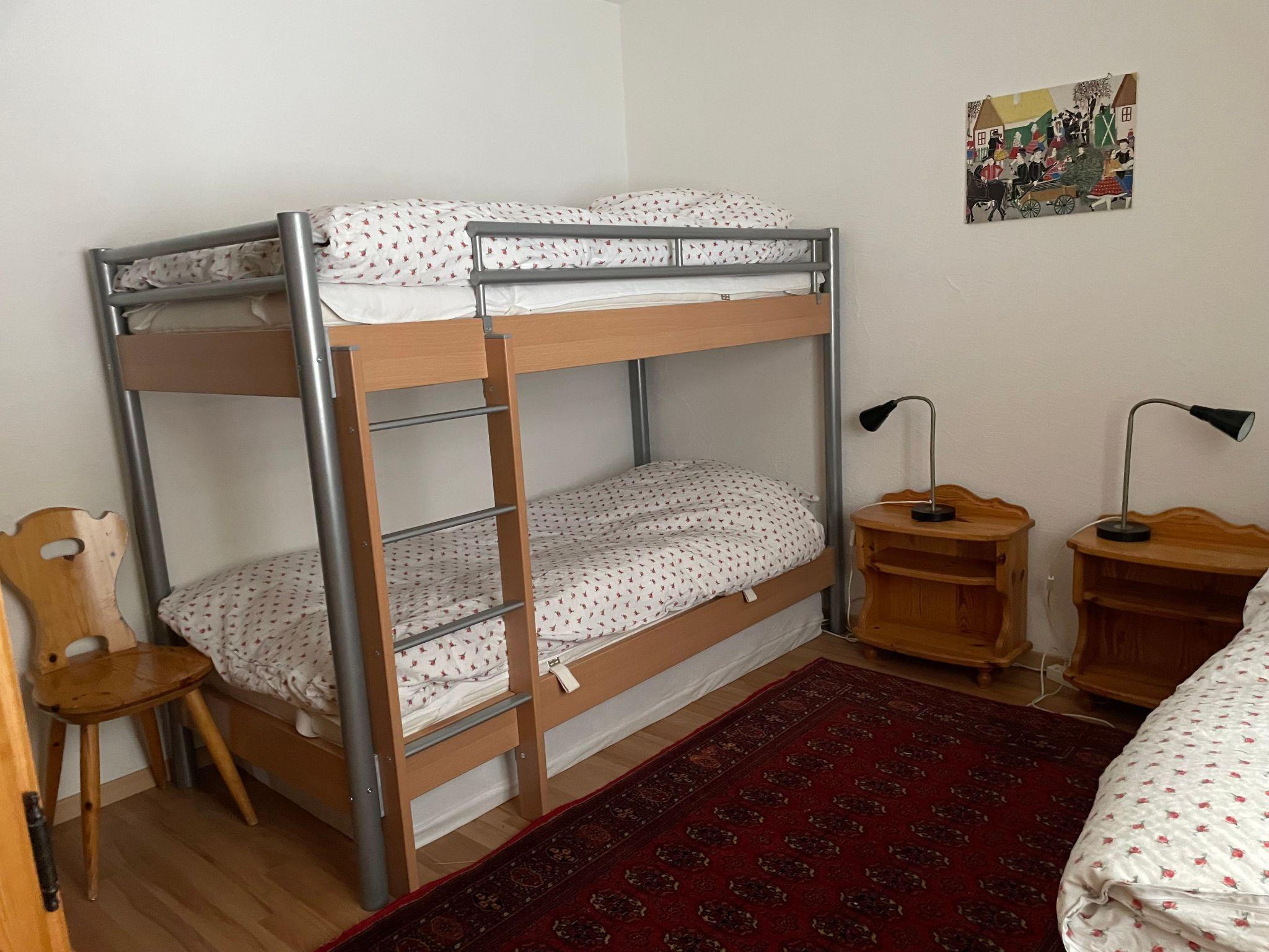 Inside, a comfortably furnished flat awaits you. The living room has a cosy sofa set, a dining area with table and 6 chairs, TV, radio with CD player and telephone for your comfort. A bedroom with a double bed, including a built-in wardrobe and chest of drawers, and a children's room with a bunk bed and a single bed are ideal for a good night's sleep. The kitchen is fully equipped with modern appliances such as a fridge, freezer, oven with warming drawer, ceramic hob and a Nespresso machine. There is also a bathroom with bath and shower, WC and a separate WC.