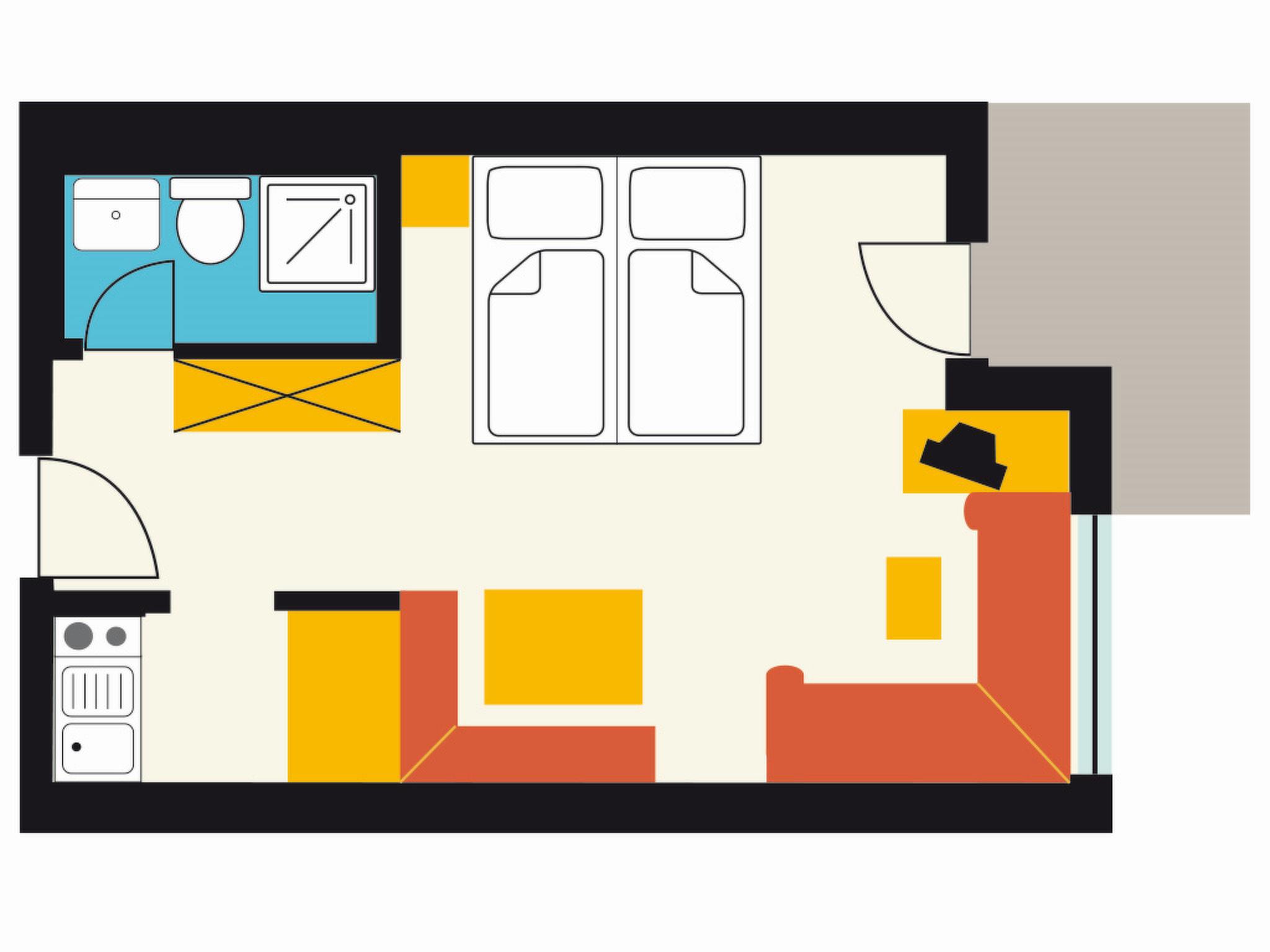 28 m2. More information by the provider: 28 m2, living-/bedroom with foldaway beds, sofa with little table, bench seat with dining table, kitchenette with 2 plate stove, fridge etc. bathroom, satellite TV/radio, telephone, internet. Possibility to contact us for any questions you have since we live in the same building.