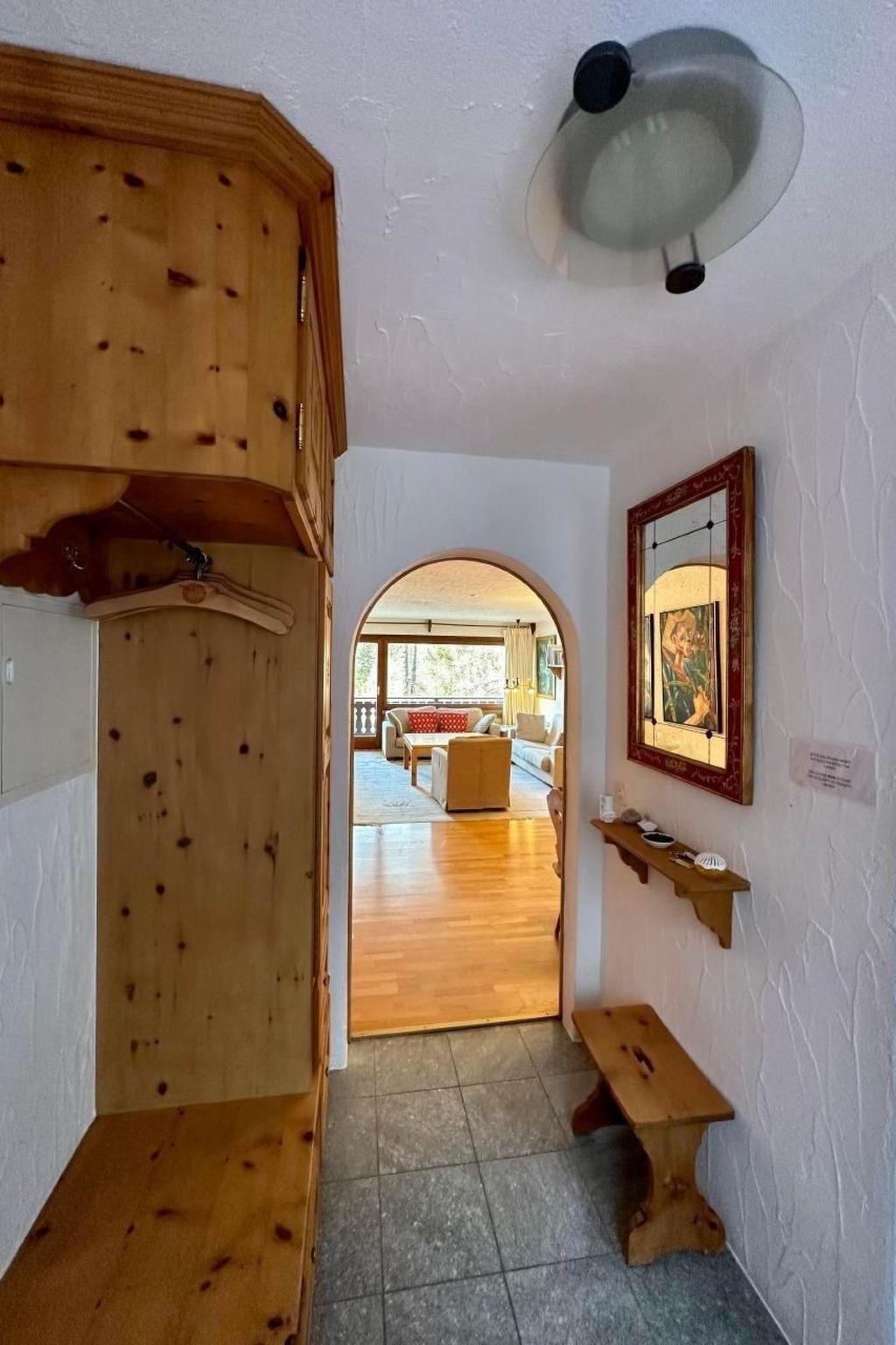 Bright and charming 3-room flat on the 4th floor (75m2) with balcony and beautiful view of the lakes and Julier. Close to bus stop, ski slopes and hiking trails. Large living room with Swiss pine dining area, new kitchen, 1 double room, 1 triple room with 1 bunk bed and 1 single bed, bathroom with bath, bidet and WC. Washing machine, large indoor pool and sauna in the building. Pets are not allowed. Non-smoking flat.