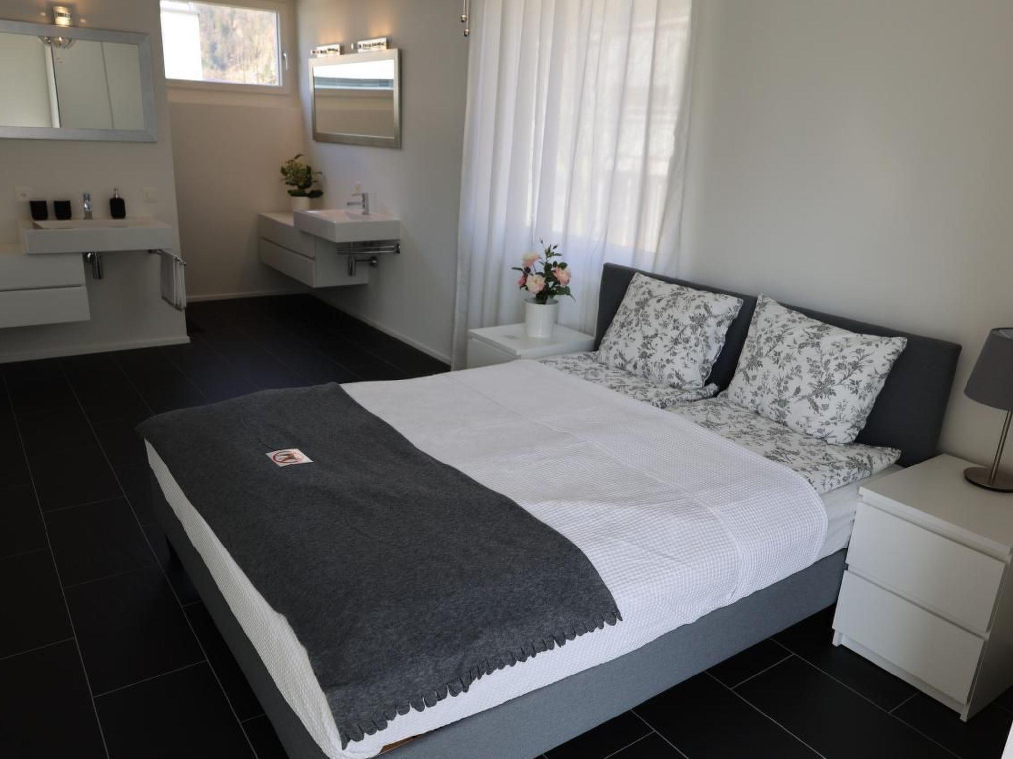 We are offering a dream villa with direct access to the lake in Sisikon, directly on Lake Lucerne with an idyllic panoramic view of the lake and mountains. You have an unobstructed view of the mountain landscape and the lake. A private bathing area on the lake with bathing ladder is available for your use. The house is fully furnished and modernly equipped. All you need to do is bring your suitcases. On the ground floor is the living area with kitchen, conservatory and guest WC. Direct access to the private garden, from which you also have direct access to the sunbathing lawn by the lake. The garden is equipped with a dining table and sun loungers, parasol and barbecue. It is also possible to book the villa for 1-4 people with reduced space. Depending on the number of people or your individual needs, the available space can be customised and individual bedrooms and bathrooms can be booked. When booking for 1-2 people, you will receive a bedroom with en suite bathroom and separate guest WC as standard. For 3-4 people, a second bedroom and a second bathroom. For an additional charge, a third bedroom can also be booked according to your requirements.