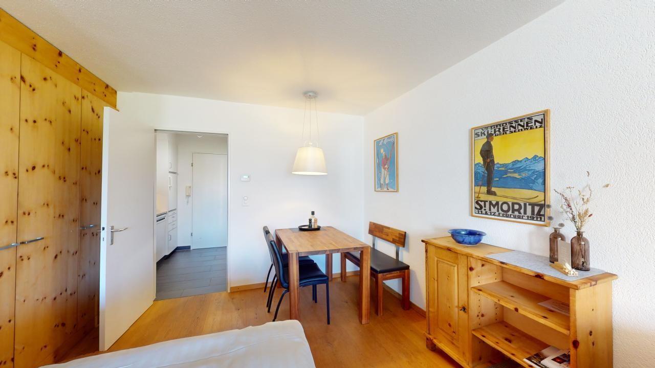 Gemütliche 1- Zimmer-Ferienwohnung im 3. Stock. Liebevoll renoviertes Wohn- /Esszimmer mit wohlriechendem Arvenholz. Überdachter Balkon mit Verglasung die je nach Witterung geöffnet/geschlossen werden kann. Kleine Küche, Bad mit Dusche, Wohn- /Esszimmer mit 2 integrierte Schrankbett 80/200cm. Im Ferienhaus befindet sich ein Lift. Beschränkte Anzahl Aussenparkplätze (max. 1 Auto/Wohnung, nicht reserviert). Fitnessraum zur öffentlichen Nutzung befindet sich im Ferien-Wohnhaus.