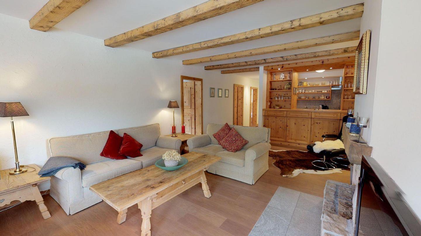 Die 4- Zimmer Ferienwohnung ist sehr stilvoll und hochwertig mit einheimischem Arvenholz und Naturstein eingerichtet. Grosszügiges Wohn- /Esszimmer mit Kamin, Südbalkon. Moderne, gut ausgestattete Küche mit Backofen, 1 Doppelschlafzimmer mit Bad/DU. 2 Schlafzimmer mit je 2 separaten Betten. 1 DU/WC. Waschmaschine, Tumbler zur Mitbenützung. Parkplatz.