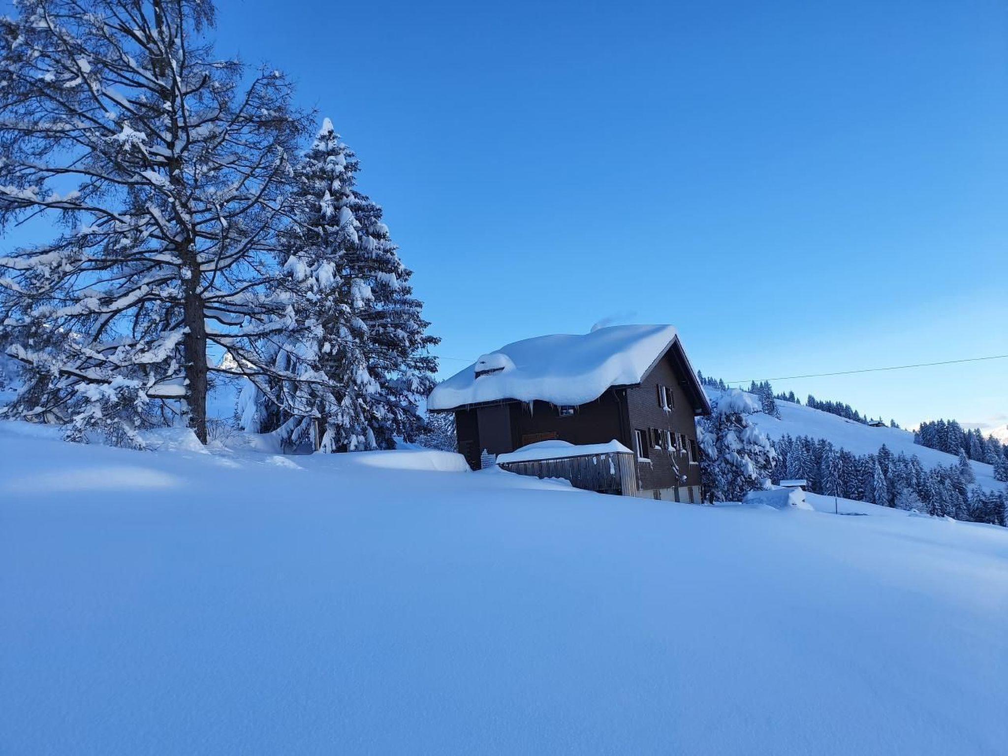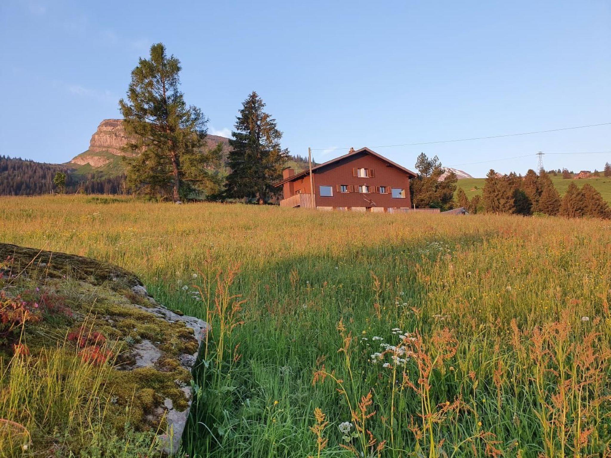 The unique location at 1225 metres above sea level, directly adjacent to the alpine meadow, will also inspire you. The location is sunny all year round with panoramic views over the valley and into the mountains on all sides. Hiking, biking, skiing and sledging trails directly from the front door. It is possible to drive right up to the house. The house can be reached on foot in approx. 12 minutes from the Iltios mountain station. The Espel-Chäserrugg cable car is only a 6-minute walk away.