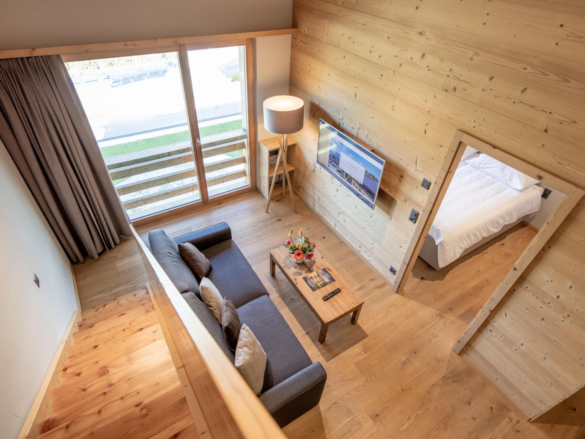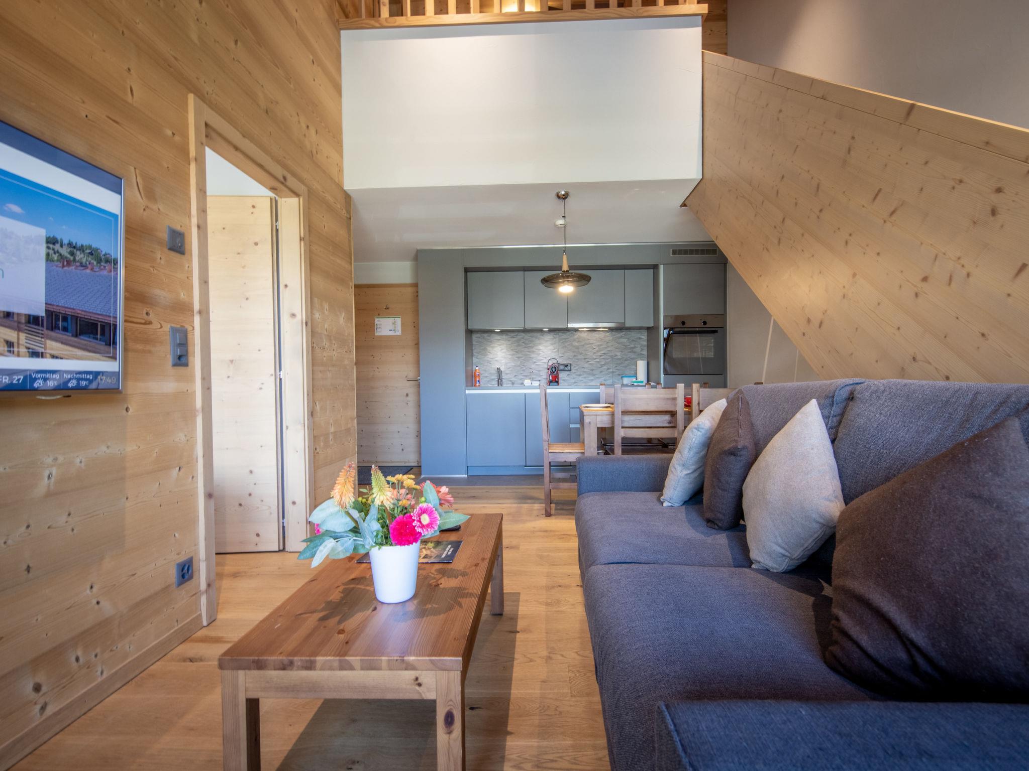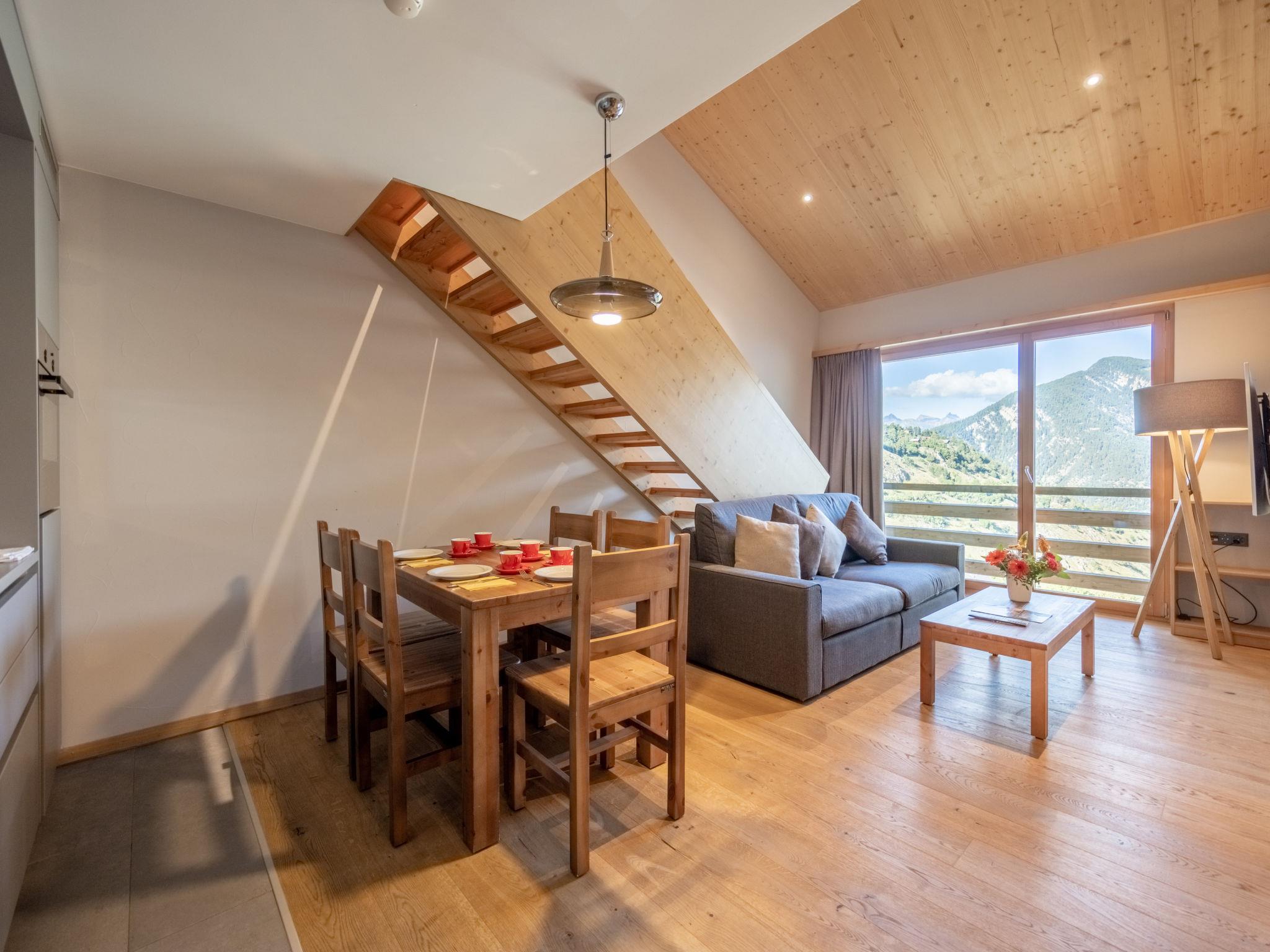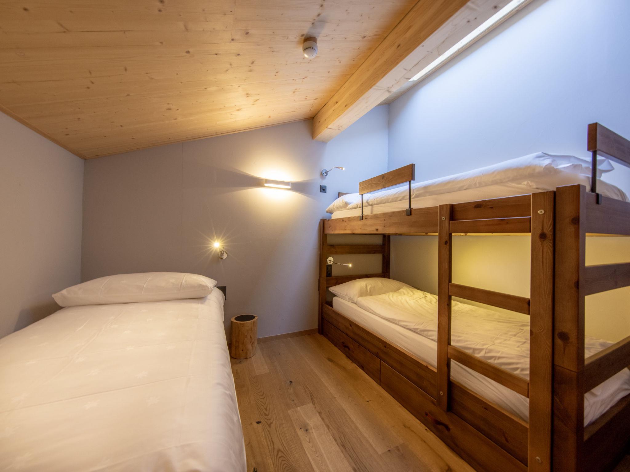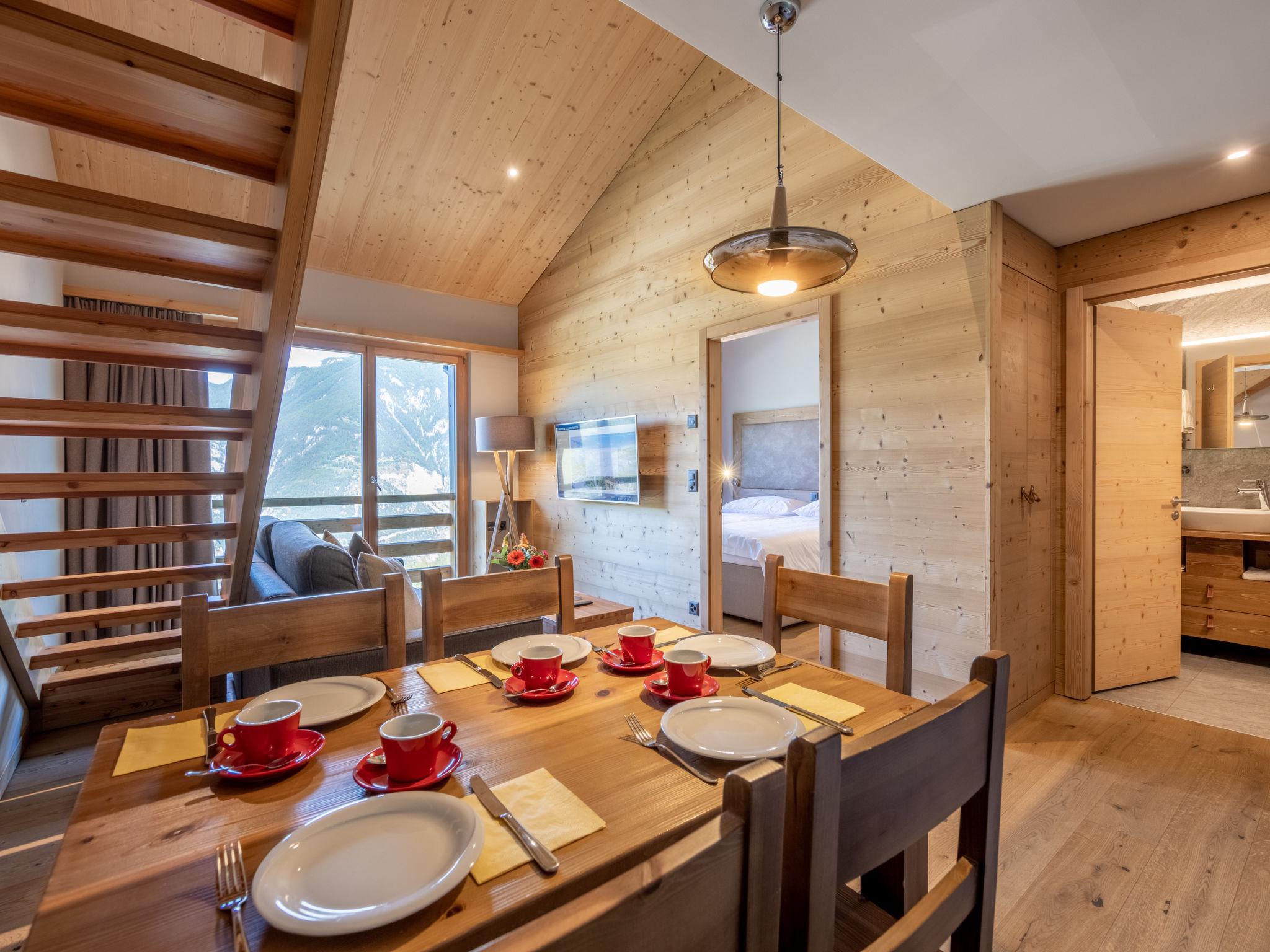 "5 personnes 2 chambres Duplex", 3-room apartment 55 to 62 m2 on 2 levels. Tasteful and cosy furnishings: living/dining room with 1 double sofabed (160 cm). 1 room with 1 double bed (2 x 90 cm). Open kitchen (oven, dishwasher, 4 ceramic glass hob hotplates, electric coffee machine, Capsules for coffee machine (Nespresso) extra). Shower/WC. Underfloor heating. Upper floor: 1 room with 1 x 2 bunk beds (90 cm). Bath/WC. Underfloor heating. Parquet floors. Facilities: hair dryer. Internet (WiFi, free). Please note: non-smoking house. 1 pet/ dog allowed. Smoke alarm. The property is one of a type of property or apartment. A fondue set (meet or cheese) as well as a raclette grill can be borrowed at the reception against a deposit.