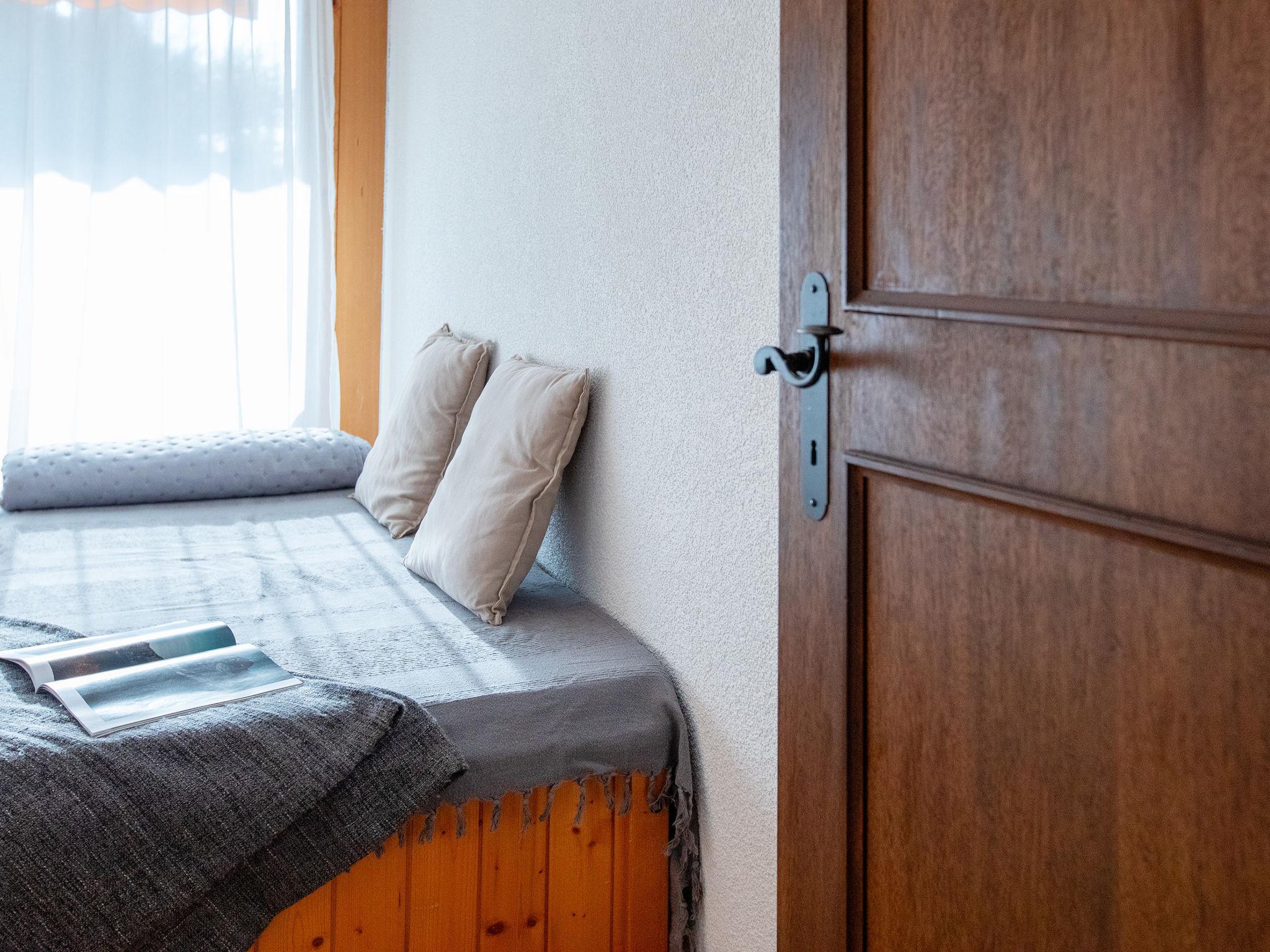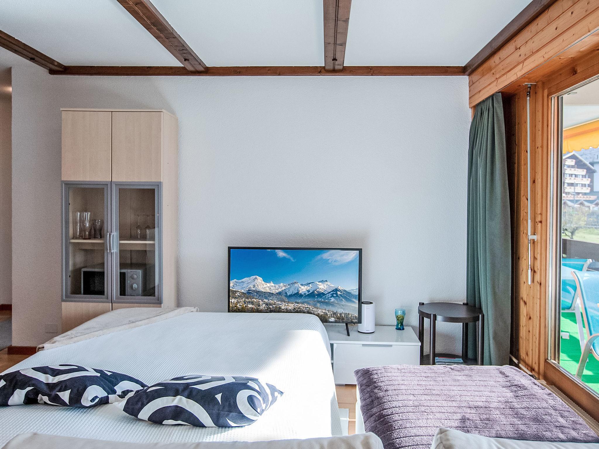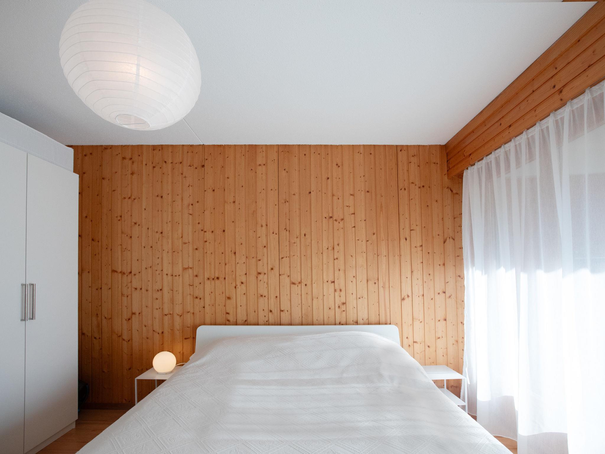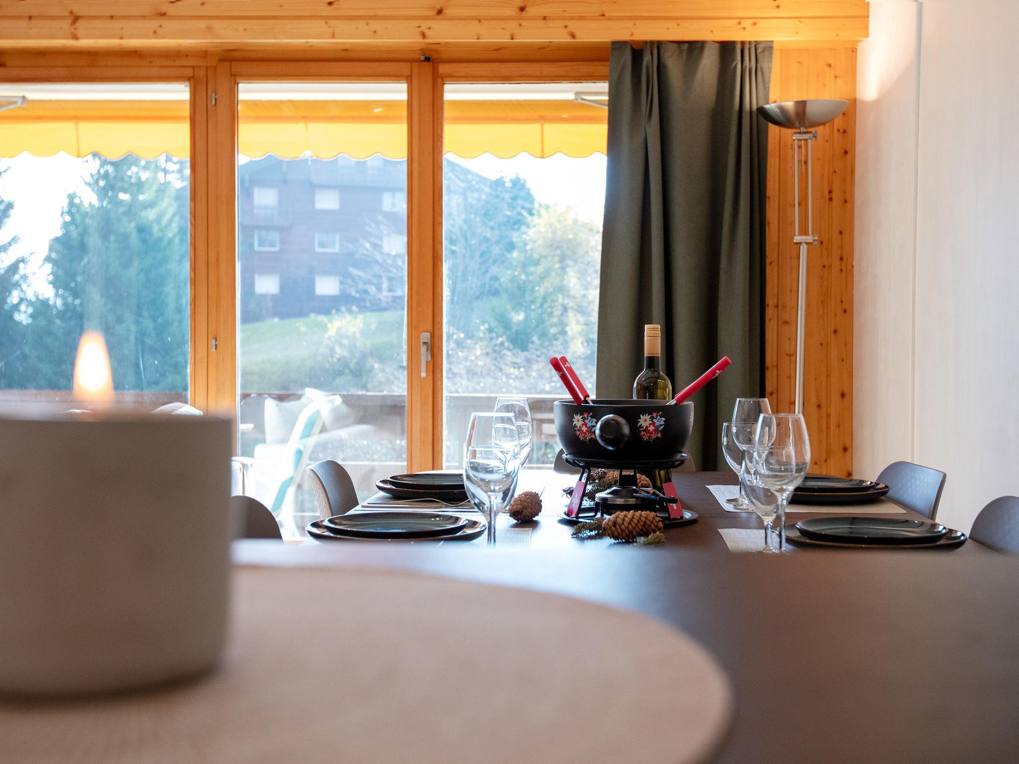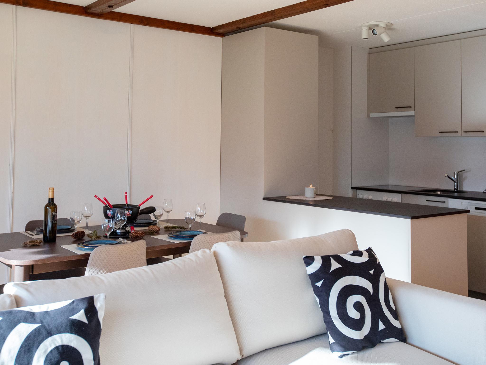 "Opale 24", 2-room apartment 48 m2 on 2nd floor, south facing position. Partly renovated in 2024, practical and comfortable furnishings: living/dining room with panoramic window with 1 sofabed (160 cm), dining table and TV (flat screen). Exit to the balcony, south facing position. 1 room with 1 french bed (1 x 160 cm). Exit to the balcony, south facing position. Open kitchen (oven, dishwasher, 4 ceramic glass hob hotplates, toaster, kettle, microwave, electric coffee machine, Capsules for coffee machine (Nespresso) extra, raclette grill, fondue Set (chinoise, cheese)). Bath/WC. Large balcony, south facing position. Balcony furniture. Partial view of the mountains and the countryside. Facilities: Internet (WiFi, free). Garage space n 19 (1 car). Please note: non-smokers only.
