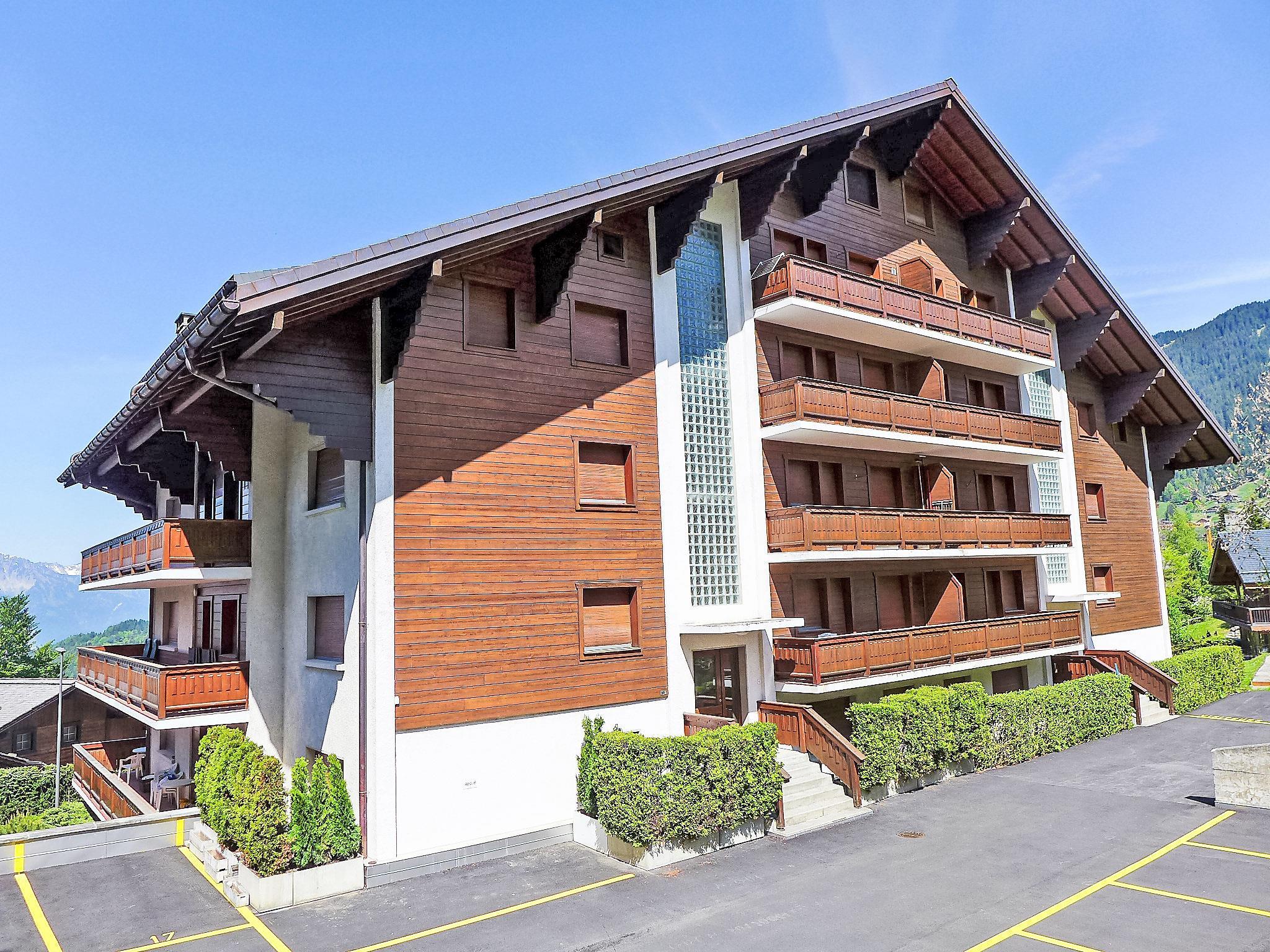 "Les Girolles B14", 1-room apartment 20 m2 on 3rd floor, south facing position. Simple and beautiful furnishings: living/dining room with 1 double sofabed (140 cm, length 200 cm), satellite TV. Exit to the balcony, south facing position. Kitchenette (3 hot plates, oven, toaster, kettle, electric coffee machine, raclette grill, fondue Set (cheese)) with bar. Shower/WC. Terrace furniture. Marvellous panoramic view of the mountains and the valley. Facilities: hair dryer. Internet (WiFi, free). Parking space n 14. Please note: fridge without freezer. Maximum 1 pet/ dog allowed.