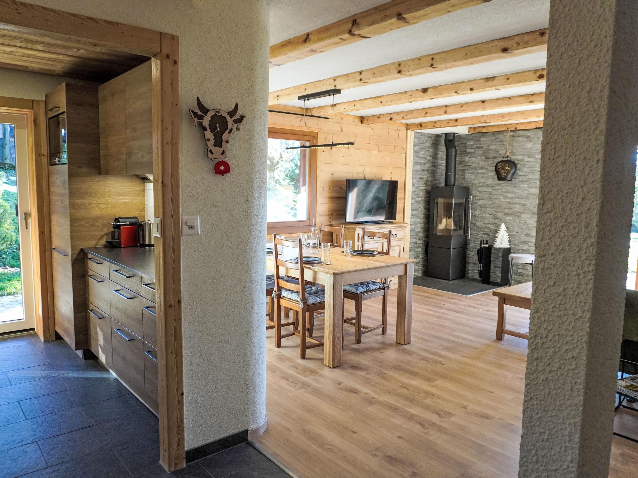 "Chantebrise A1", 3-room apartment 78 m2, on the ground floor, south facing position. Bright, practical and comfortable furnishings: living/dining room with Scandinavian wood stove, dining table and TV (flat screen). Exit to the garden, south facing position. 1 room with 1 french bed (1 x 160 cm). Exit to the garden, south facing position. 1 room with 1 x 2 bunk beds (120 cm). Open kitchen (oven, dishwasher, 4 ceramic glass hob hotplates, microwave, freezer, electric coffee machine, Capsules for coffee machine (Nespresso) extra, raclette grill, fondue Set (chinoise, cheese)). Exit to the garden, east facing position. Bath/WC, shower/WC. Large garden, south facing position and, east facing position. Terrace furniture, barbecue. Beautiful view of the mountains. Facilities: hair dryer. Internet (WiFi, free). Garage space n 1. Please note: non-smokers only.