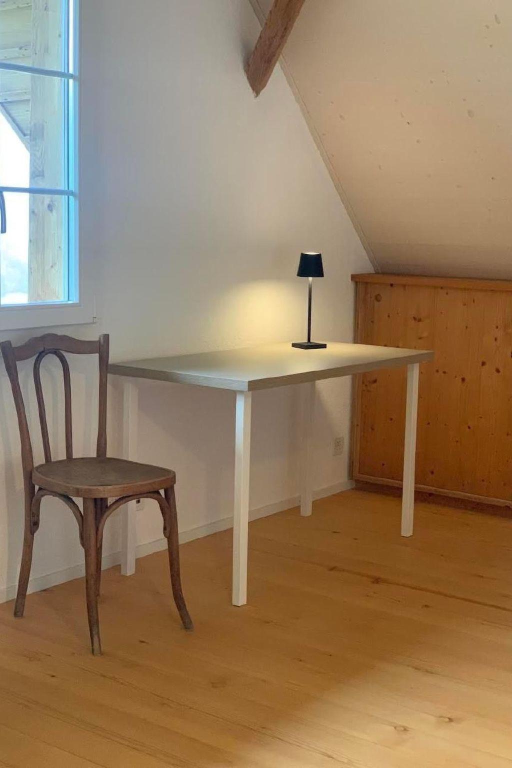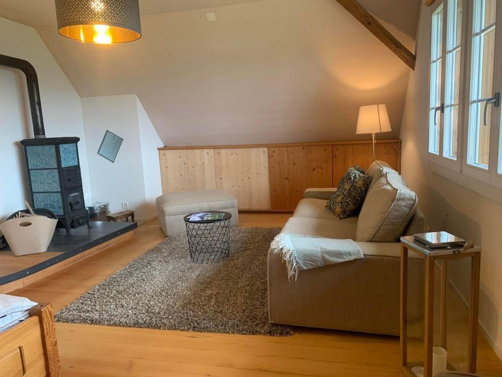 The older and newly renovated farmhouse is situated above the village of Wikartswil at just under 900 metres with a view of the beautiful local mountains Eiger, Mönch and Jungfrau as well as the hilly Emmental landscape. If you are looking for a quiet place surrounded by nature, whether for hiking or just to switch off, this is the place for you. Cycling tours and hikes can be started right on the doorstep. And if you would like to visit Thun, Bern or Burgdorf, the cities are just a 30-minute drive away. The nearest railway station with a direct connection to Bern is in Worb (SBB). This can be reached by car in approx. 10 minutes. The flat is located on the top floor of our lovingly renovated farmhouse. We lived in the flat ourselves until recently. We live on the farm with our horses and now live in the lower part of the house. The flat was renovated in 2021 and has a beautiful antique stove, which can be used to create a cosy atmosphere on cooler days. An outdoor seating area is available for warmer days. Look forward to a peaceful, relaxing atmosphere surrounded by nature.