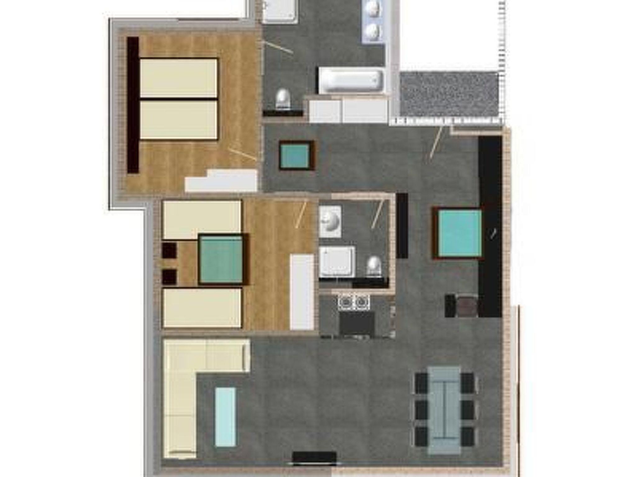 1 double bedroom with integrated bathroom with bath, shower, WC and washbasin and 1 bedroom with 2 single beds, separate shower and WC. Both bedrooms have a built-in wardrobe.
