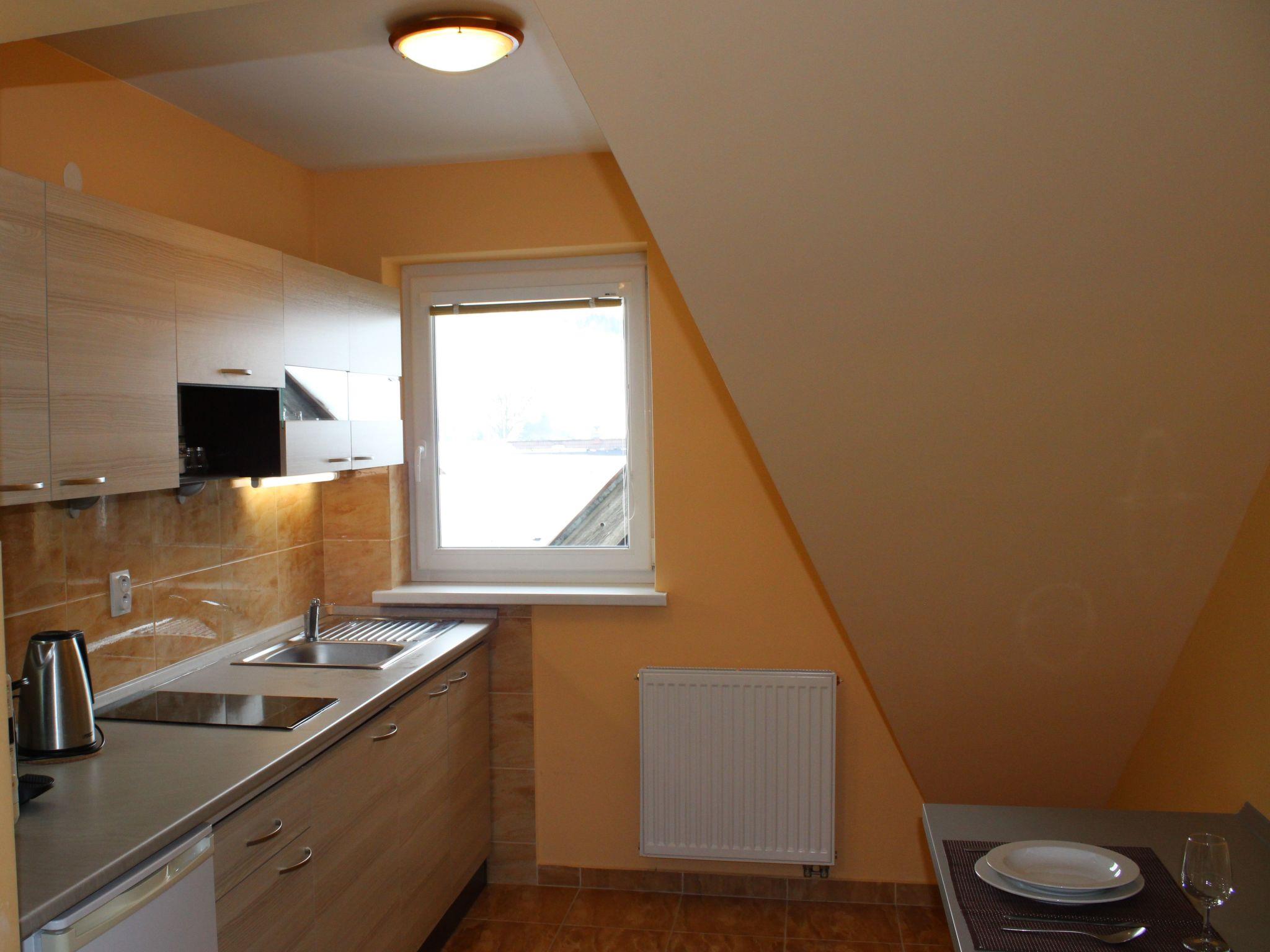Inside the flat you will find a practically furnished bedroom and a bathroom with shower. The equipment includes a 2-plate induction cooker, a capsule coffee machine and a kettle, which will make your stay uncomplicated and cosy. The well thought-out interior design creates a pleasant ambience in which you can relax after an eventful day.