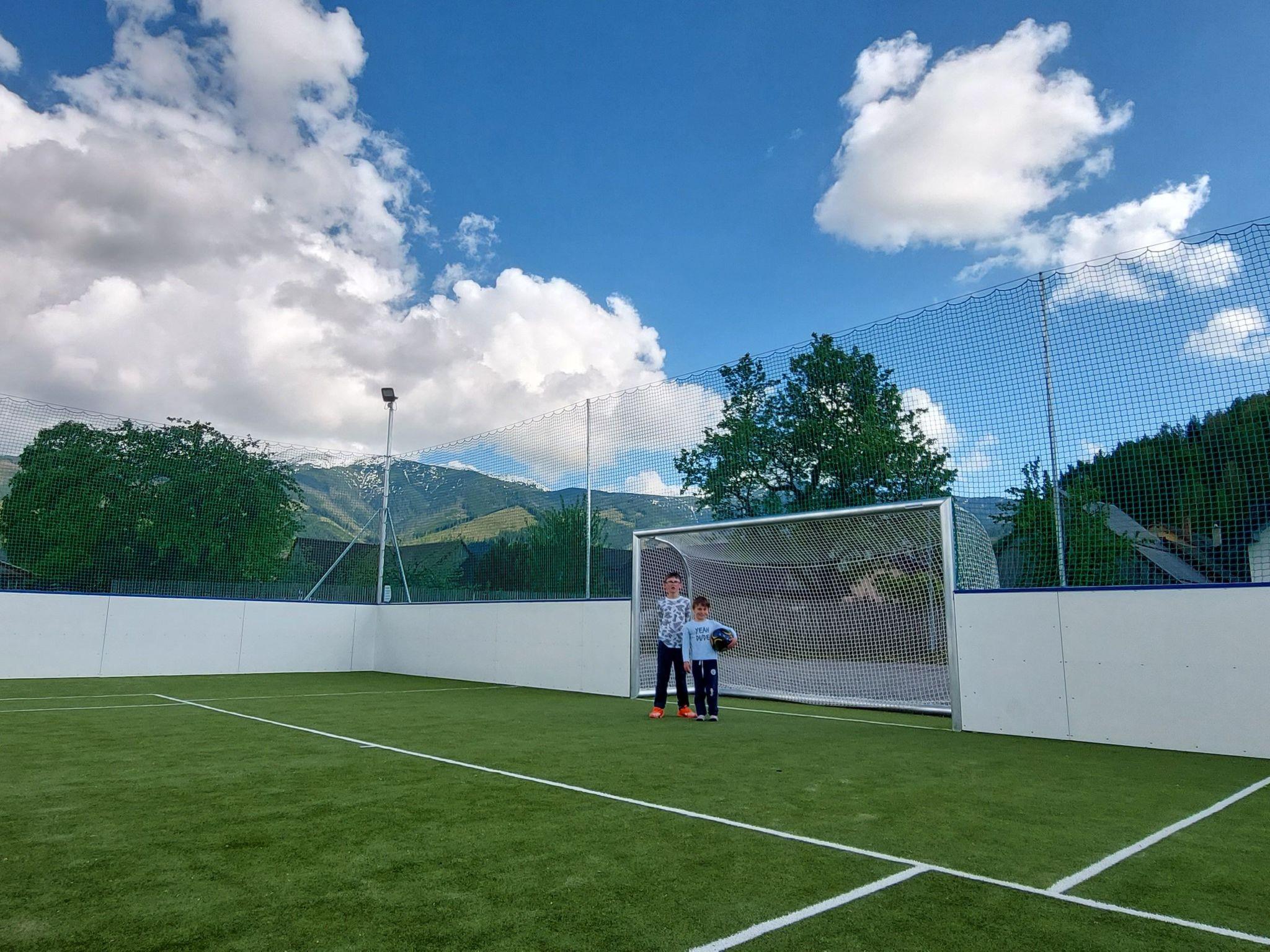 Relaxation is provided by the private wellness area with sauna and hot tub, ideal for unwinding after an active day. Sports and leisure facilities include a sports room with table football, a pavilion for cosy hours outdoors and a children's playground with slide and trampoline.