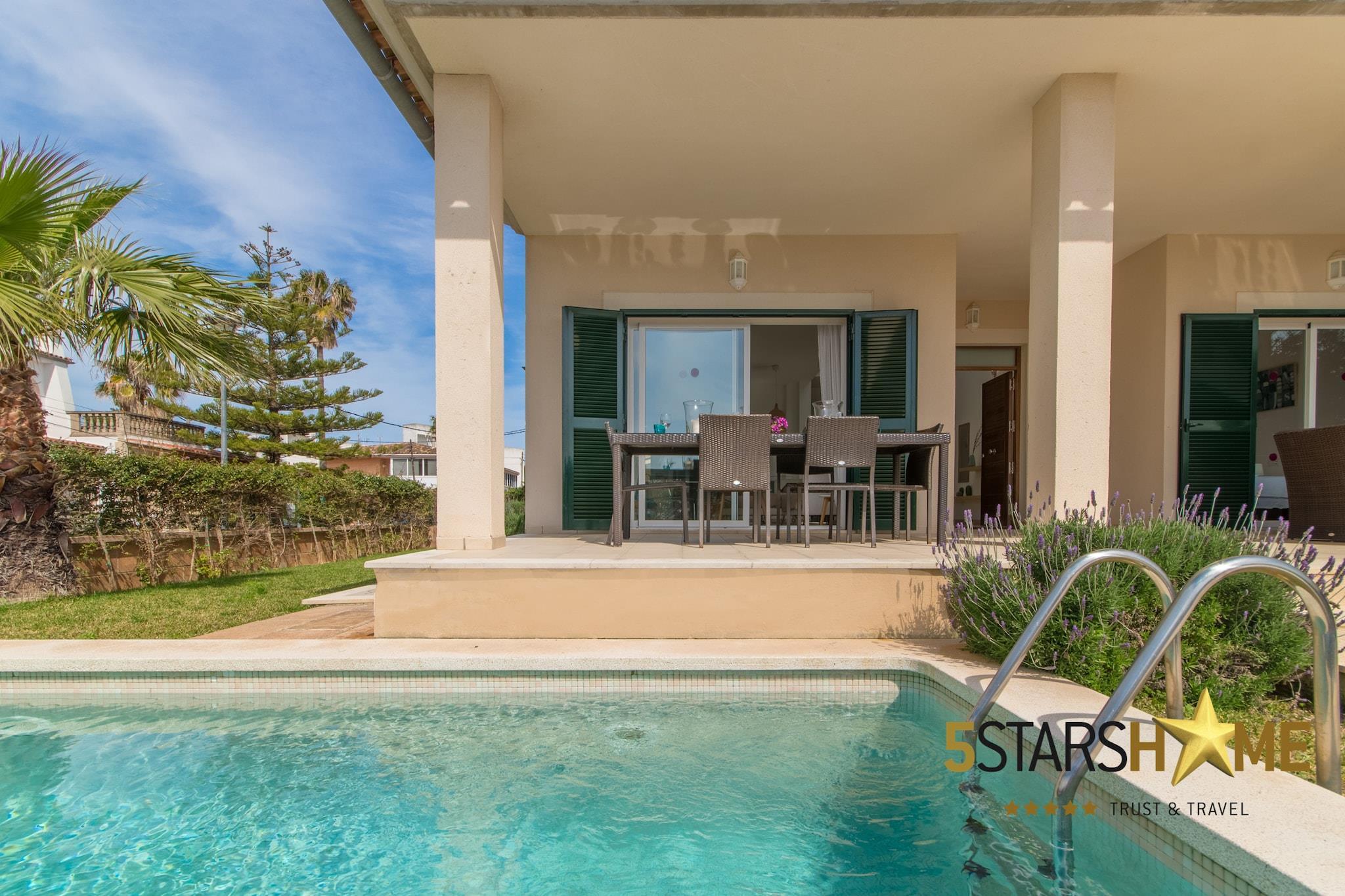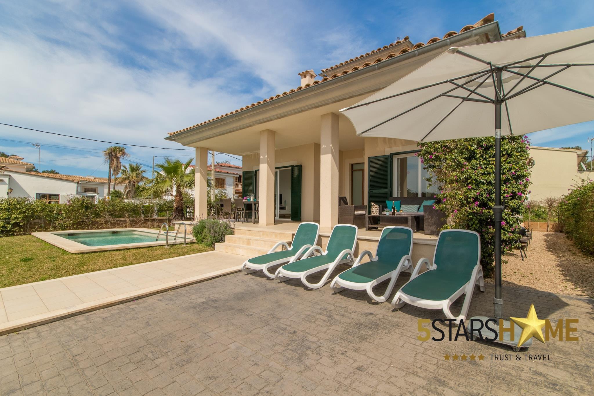 Beliggende kun 130 meter fra stranden, dette moderne feriehus, Bella Mar 1, er det perfekte tilflugtssted for familier eller grupper, der tilbyder indkvartering for op til 8 gæster med 4 soveværelser med dobbeltsenge og 3 badeværelser. Ejendommen er udstyret med aircondition, varme og gratis Wi-Fi for at sikre et behageligt ophold. Gæsterne kan nyde den private pool, en velholdt have med grillplads og rummelige terrasser til udendørs spisning og afslapning. Dens beliggenhed i Barcares, nær Alcudia, gør det til et ideelt sted for dem, der leder efter en strandferie kombineret med nærhed til lokale attraktioner. Barcares er en populær familievenlig destination kendt for sit lave vand, hvilket gør det perfekt for børn at lege sikkert i havet. Den gamle bydel i Alcudia, kun en kort køretur væk, byder på charmerende gader at udforske, lokale tapasrestauranter og en række butikker. For dem, der er interesserede i vandsport, er den nærliggende Sa Marina et hotspot for kitesurfing og sejlads. Den pulserende marina og nærliggende strande tilbyder masser af muligheder for at slappe af, spise og nyde områdets naturlige skønhed. Husets moderne interiør strækker sig over to etager med et hyggeligt tv-hjørne, et separat køkken med direkte adgang til spisepladsen og et opholdsrum i åbent plan. Huset er designet med sans for detaljer og tilbyder alle de bekvemmeligheder du har brug for til en afslappende ferie. For familier med små børn er barnesenge og høje stole tilgængelige efter anmodning. Hvis du rejser med en større gruppe, kan både dette hus og dets tvilling, Bella Mar 2, lejes sammen for op til 16 gæster. Lejelicensnummeret er ETV/3399