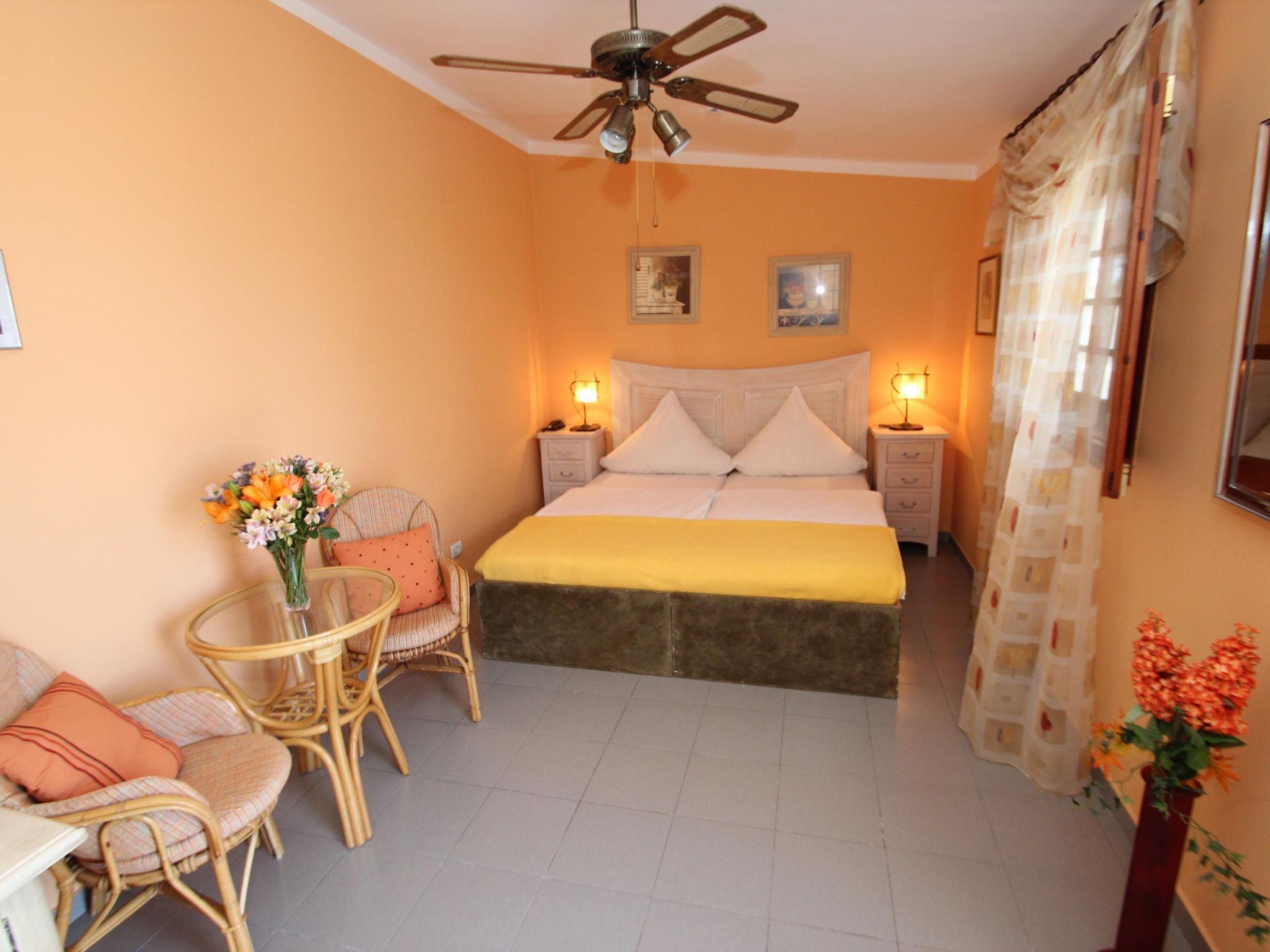 Inside, you will find a tastefully furnished living room/bedroom with an integrated, modern kitchenette. You will find a comfortable sofa set with granite table, a breakfast table with direct sea view and a large double bed (2mx2m), equipped with high-quality bed linen. The kitchenette leaves nothing to be desired and offers a 2-plate ceramic hob, fridge, coffee machine and much more. A modern bathroom with shower, WC, bidet and a selection of bath towels, hand towels and bathrobes round off the interior. Of course, amenities such as Internet with WLAN, satellite TV with German channels and air conditioning in the living area are at your disposal.