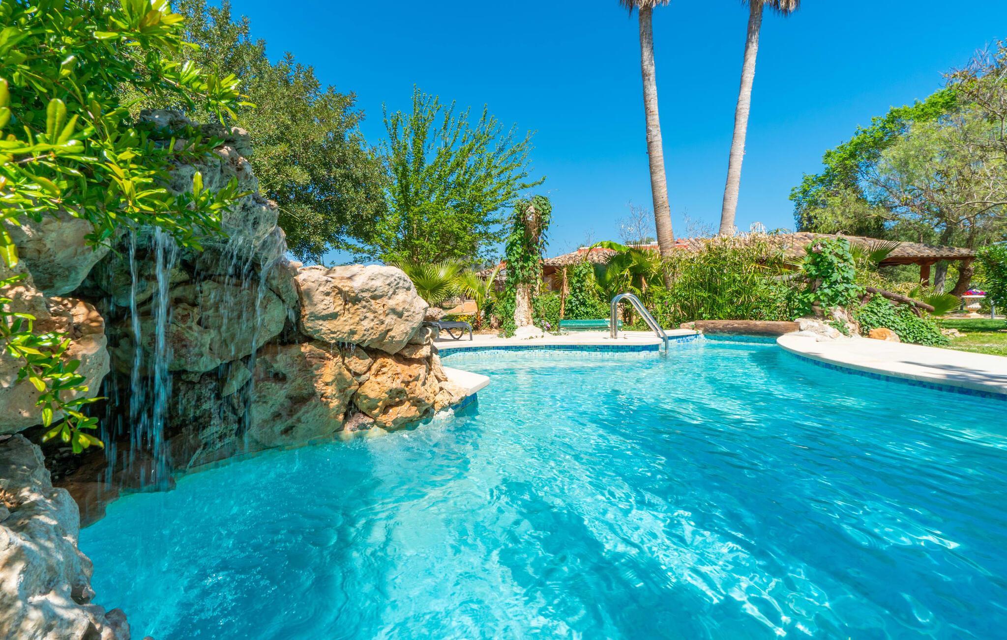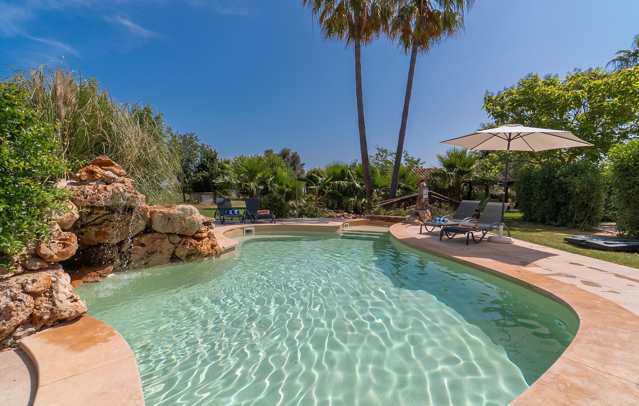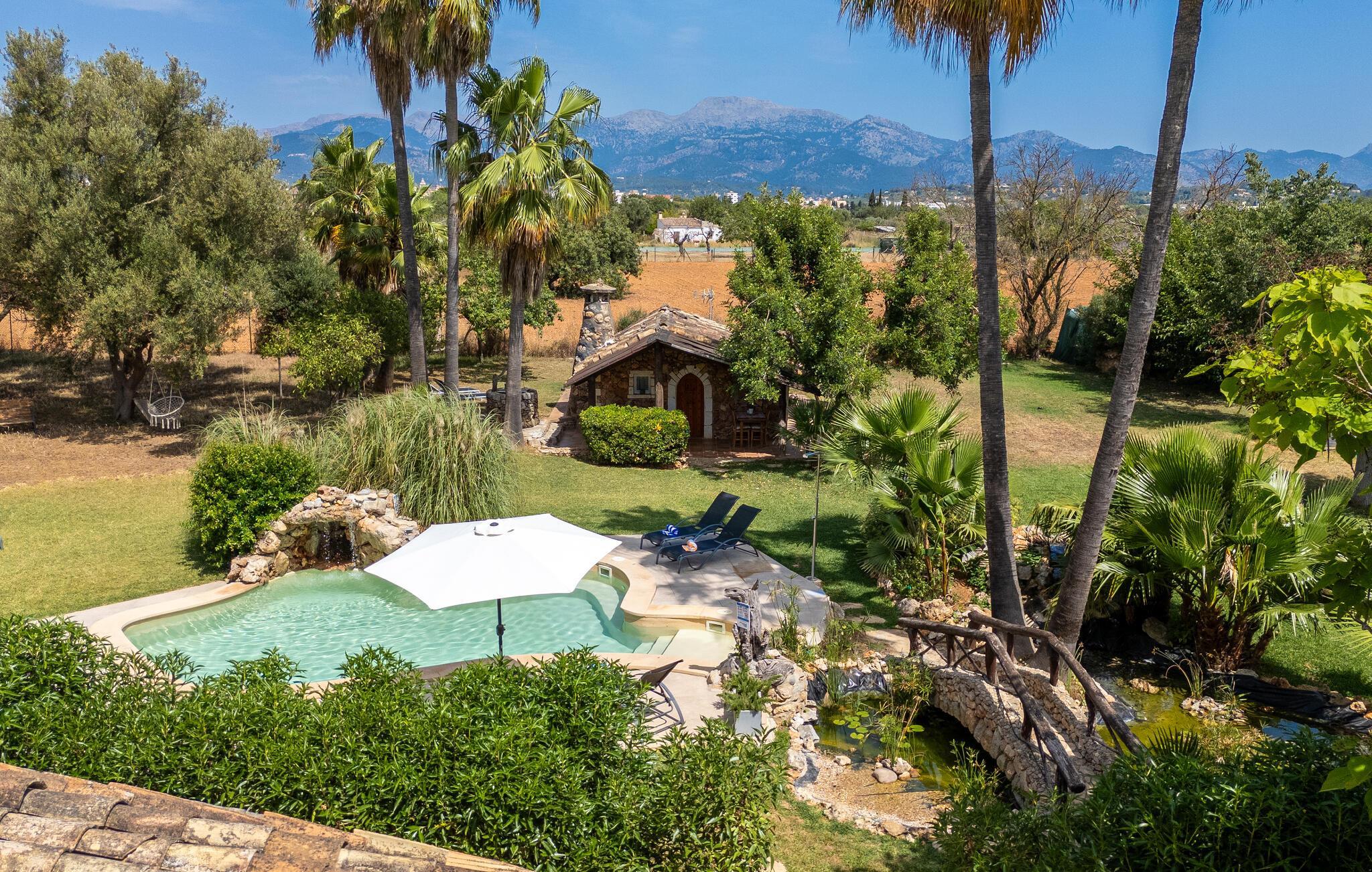 Landstedet "Ca Na Marlis" er ideelt, hvis du ønsker at tilbringe en afslappende ferie med gode venner på Mallorca. Bygningernes arkitektur kan minde om det nordlige Spanien, hvilket ikke er tilfældigt: De tilhørte engang en asturisk restaurant. Dette er et Fincallorca feriehus. Ejendommen er blevet nænsomt restaureret og omdannet til tre separate og komfortable boligenheder, fordelt på en afsondret havegrund med masser af græsplæne, fortryllende skyggefulde områder og en eksotisk designet pool med en lille grotte og vandfald. Der er masser af komfortable liggestole og siddepladser til læsning, solbadning og afslapning. Hvert hus har en individuelt designet terrasse. Det indre af hovedhuset og de to bungalower er oversvømmet med lys og indrettet i en moderne landlig stil. Hovedhuset har en stue, en spisestue, et moderne køkken med en anden spiseplads og tre rummelige soveværelser, hvoraf to har eget badeværelse. I tilknytning til huset finder I en skøn lounge, flere terrasser og en grillplads. Hver af de to bungalower har et dobbeltværelse med eget badeværelse. Den tredje bungalow med rustik indretning har ikke et soveværelse. Der er et lille fitnessrum, en hyggelig stue med pejs, en lille bar og et værelse med spil og et bordfodboldbord. Her kan du skabe din egen feststemning uden at skulle forlade dit sommerhus på Mallorca. Feriehuset ligger kun 1 km fra Inca. Der er en paddlebane og flere tennisbaner i umiddelbar nærhed. Herfra kan du nå de lange, hvide strande på nordøstkysten på cirka 25 minutter i bil.