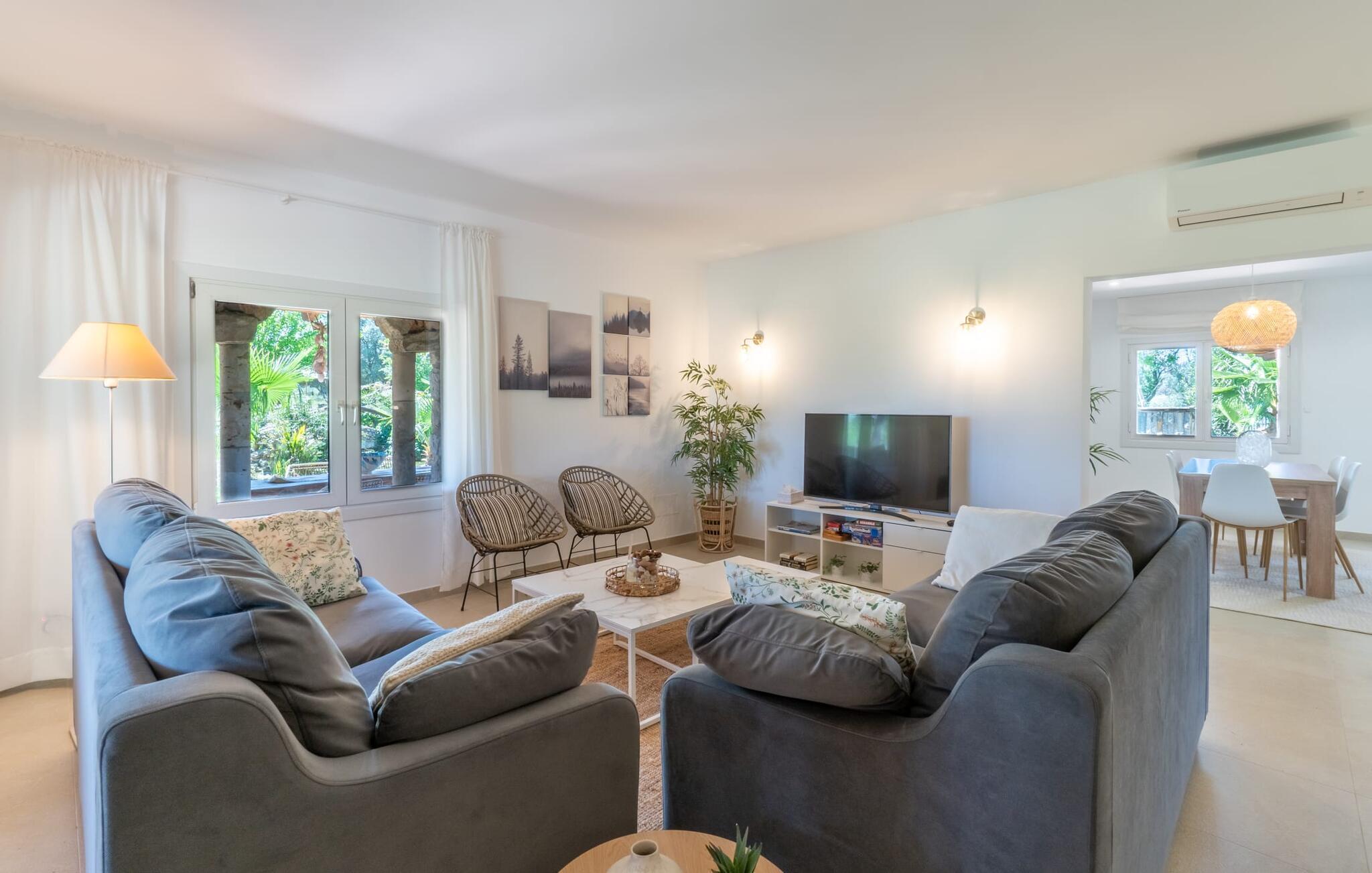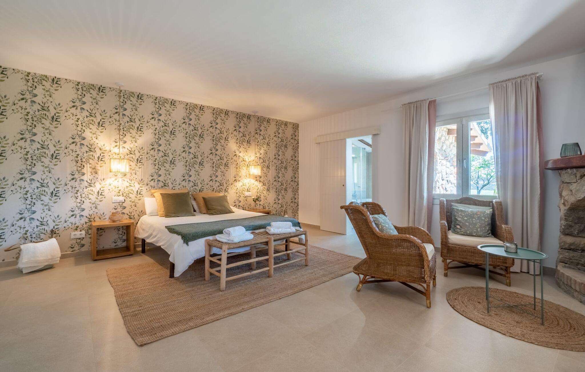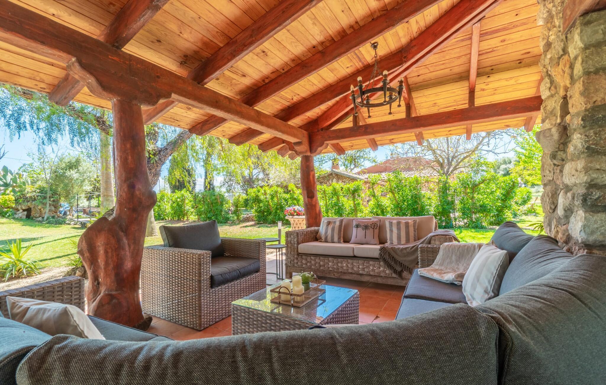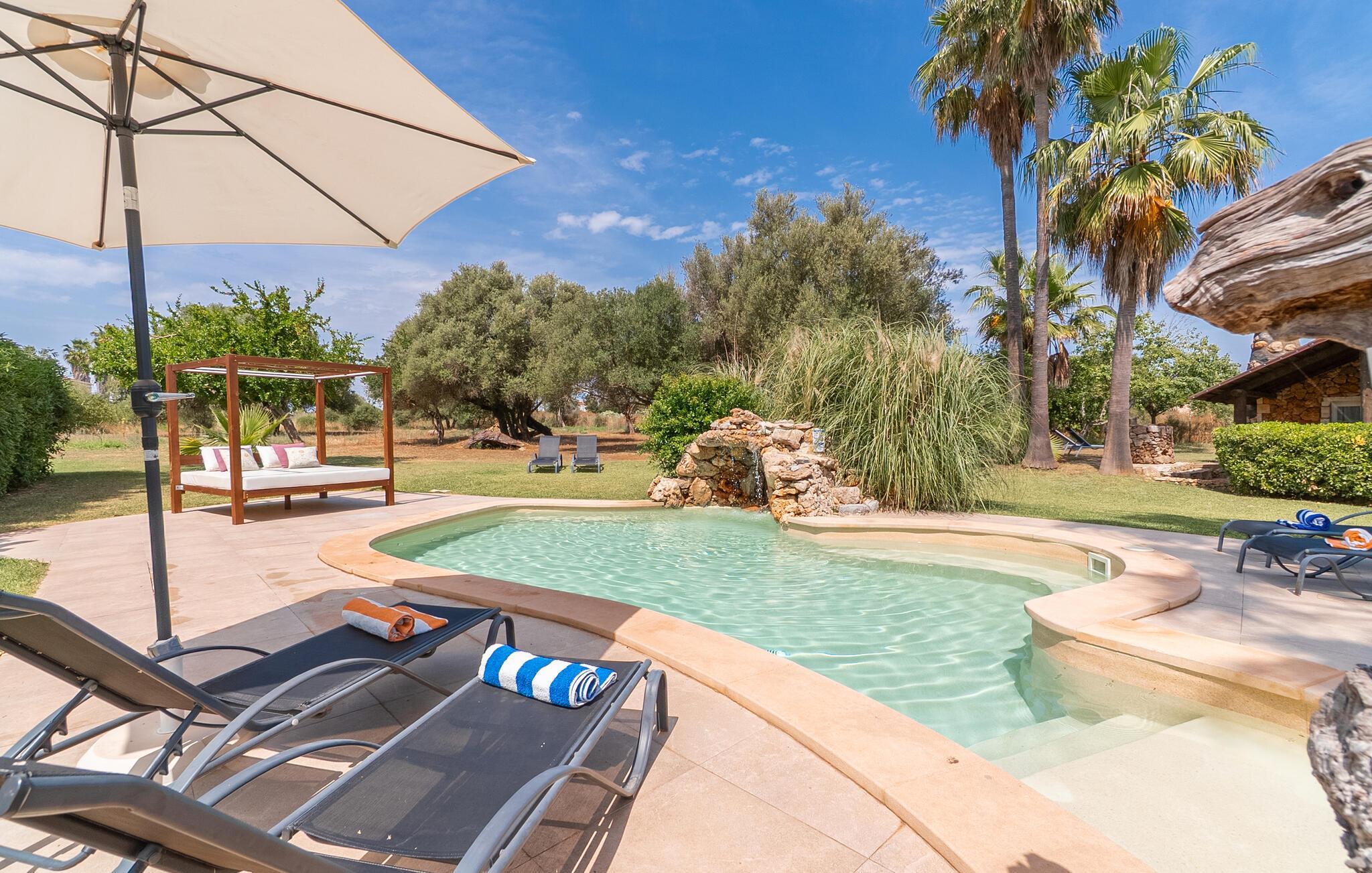 Landstedet "Ca Na Marlis" er ideelt, hvis du ønsker at tilbringe en afslappende ferie med gode venner på Mallorca. Bygningernes arkitektur kan minde om det nordlige Spanien, hvilket ikke er tilfældigt: De tilhørte engang en asturisk restaurant. Dette er et Fincallorca feriehus. Ejendommen er blevet nænsomt restaureret og omdannet til tre separate og komfortable boligenheder, fordelt på en afsondret havegrund med masser af græsplæne, fortryllende skyggefulde områder og en eksotisk designet pool med en lille grotte og vandfald. Der er masser af komfortable liggestole og siddepladser til læsning, solbadning og afslapning. Hvert hus har en individuelt designet terrasse. Det indre af hovedhuset og de to bungalower er oversvømmet med lys og indrettet i en moderne landlig stil. Hovedhuset har en stue, en spisestue, et moderne køkken med en anden spiseplads og tre rummelige soveværelser, hvoraf to har eget badeværelse. I tilknytning til huset finder I en skøn lounge, flere terrasser og en grillplads. Hver af de to bungalower har et dobbeltværelse med eget badeværelse. Den tredje bungalow med rustik indretning har ikke et soveværelse. Der er et lille fitnessrum, en hyggelig stue med pejs, en lille bar og et værelse med spil og et bordfodboldbord. Her kan du skabe din egen feststemning uden at skulle forlade dit sommerhus på Mallorca. Feriehuset ligger kun 1 km fra Inca. Der er en paddlebane og flere tennisbaner i umiddelbar nærhed. Herfra kan du nå de lange, hvide strande på nordøstkysten på cirka 25 minutter i bil.