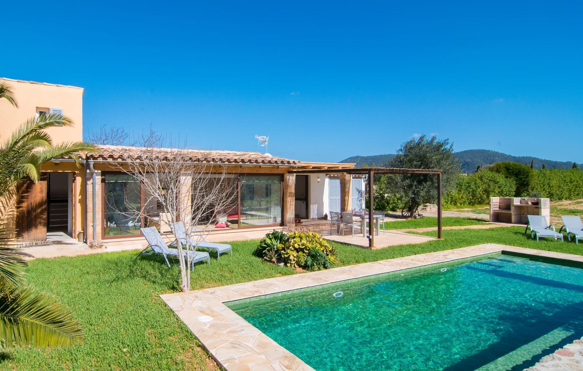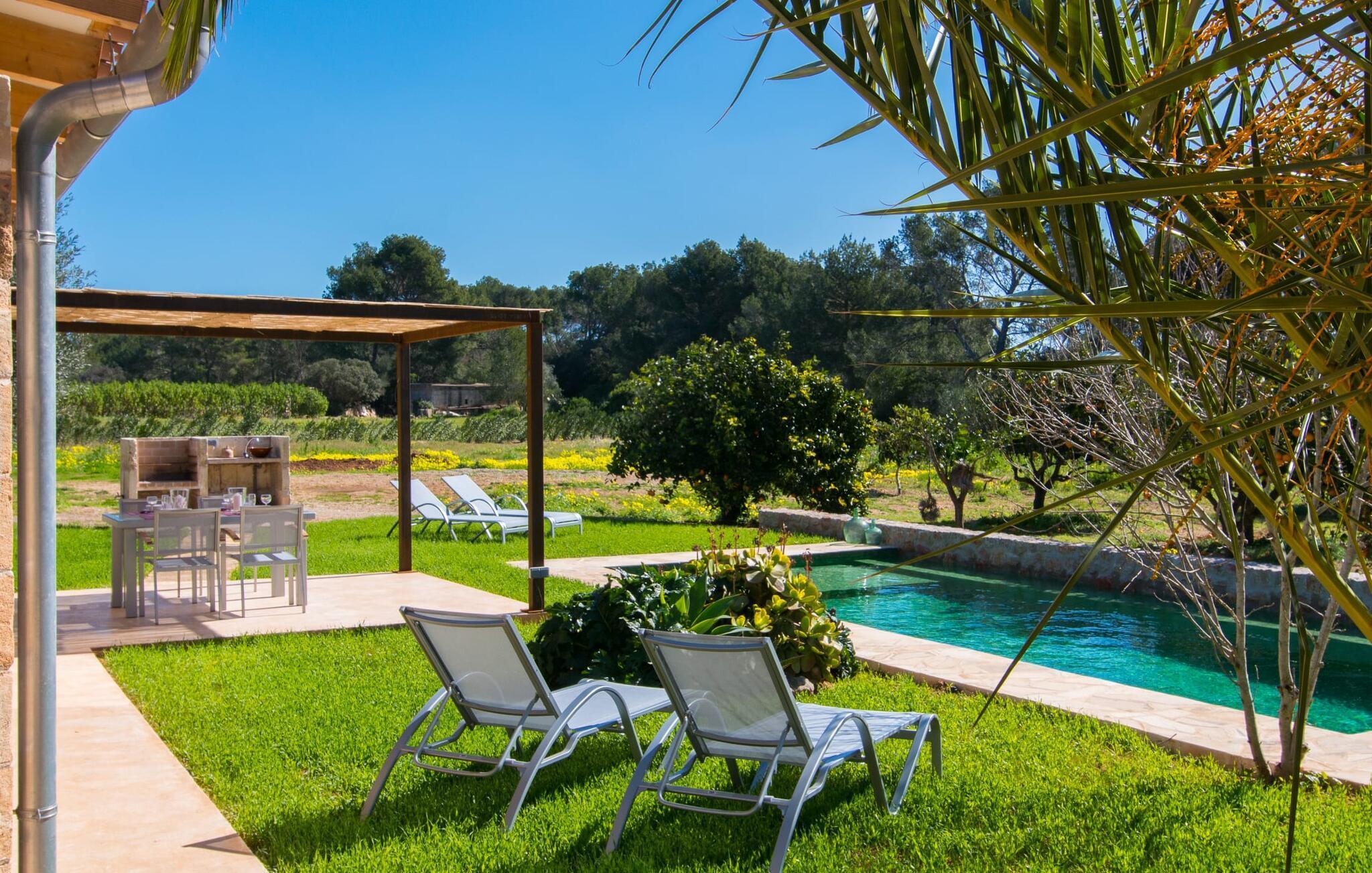Villa "Ca Ses Nines" er en fantastisk, moderne villa i de perfekte afsondrede omgivelser, ideel for par, der søger en fredelig ferie. Dette er et feriehus i Fincallorca. Den store terrasse har udsigt over en frodig have med pool, liggestole og en grillplads til udendørs spisning. Villaen er omgivet af træer, herunder en lille appelsinlund, og tilbyder komplet privatliv og ro. Friske appelsiner, når der er sæson, er en lækker fornøjelse under dit ophold. Den rummelige opholdsstue er oversvømmet med naturligt lys takket være tre store glaspaneler, der forbinder rummet med terrassen. En daybed med en vidunderlig udsigt over haven inviterer til afslapning, mens en behagelig sofa foran tv'et forstærker den hjemlige følelse yderligere. Det hvide køkken er fuldt udstyret til selvforplejning, og der er en trendy spiseplads i landlig stil ved siden af. Et soveværelse er i underetagen med to enkeltsenge og en sandstensvæg, mens der i stueetagen er et stilfuldt badeværelse med bruseniche. Ovenpå byder det andet soveværelse på en komfortabel 1,60 m bred dobbeltseng, et privat badeværelse og charmerende tilbehør. Den charmerende villa er beliggende nær den maleriske kystby Port Verd på den østlige del af øen. Her, som i nærliggende Son Servera, kan du nemt gøre dine daglige indkøb. De farverige ugentlige markeder i Son Servera, Artà, Cala Ratjada og Capdepera er bestemt et besøg værd, mens du i Cala Millor med sin strandpromenade og vandsport finder butikker, supermarkeder, restauranter og caféer. Den velkendte "Pula Golf" kan nås hurtigt. Stranden Sa Marjal ligger kun 2,7 km væk, og den lange sandstrand i Cala Millor er kun omkring 10 minutter væk i bil.