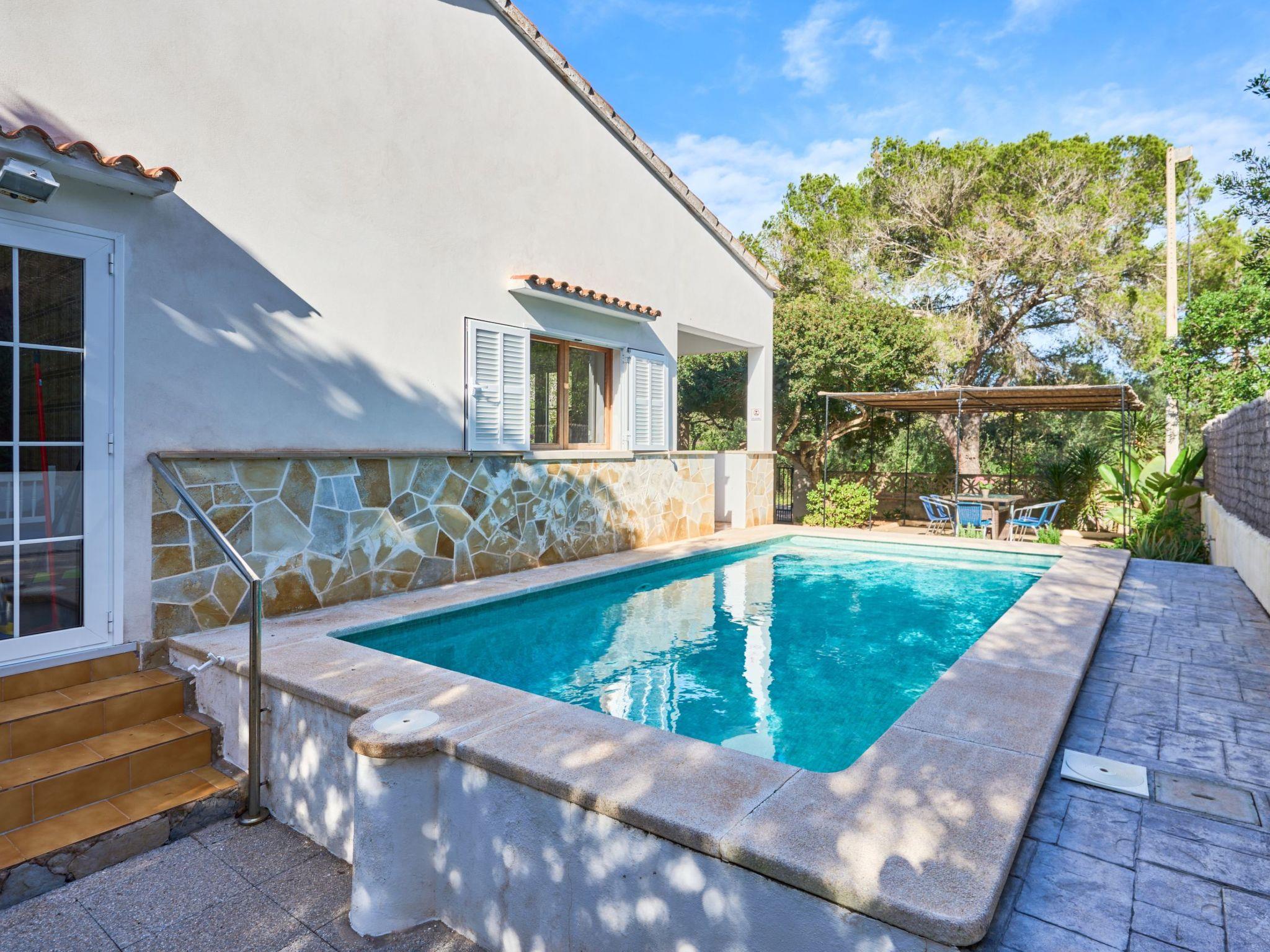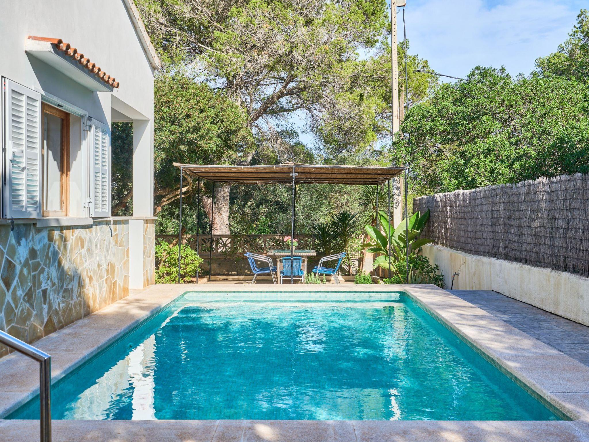 Surrounded by pine trees, the holiday home Villa Es Pinar is a small oasis of peace for up to 6 people. It is located just 1600 metres from the protected beach of S'Amarador, next to Cala Mondragó, and just a few hundred metres from the rocky coastline. A lovely covered terrace is perfect for dining or just relaxing. The terraces surrounding the house have beautiful flowerbeds and trees. Barbecue (charcoal only due to fire risk).