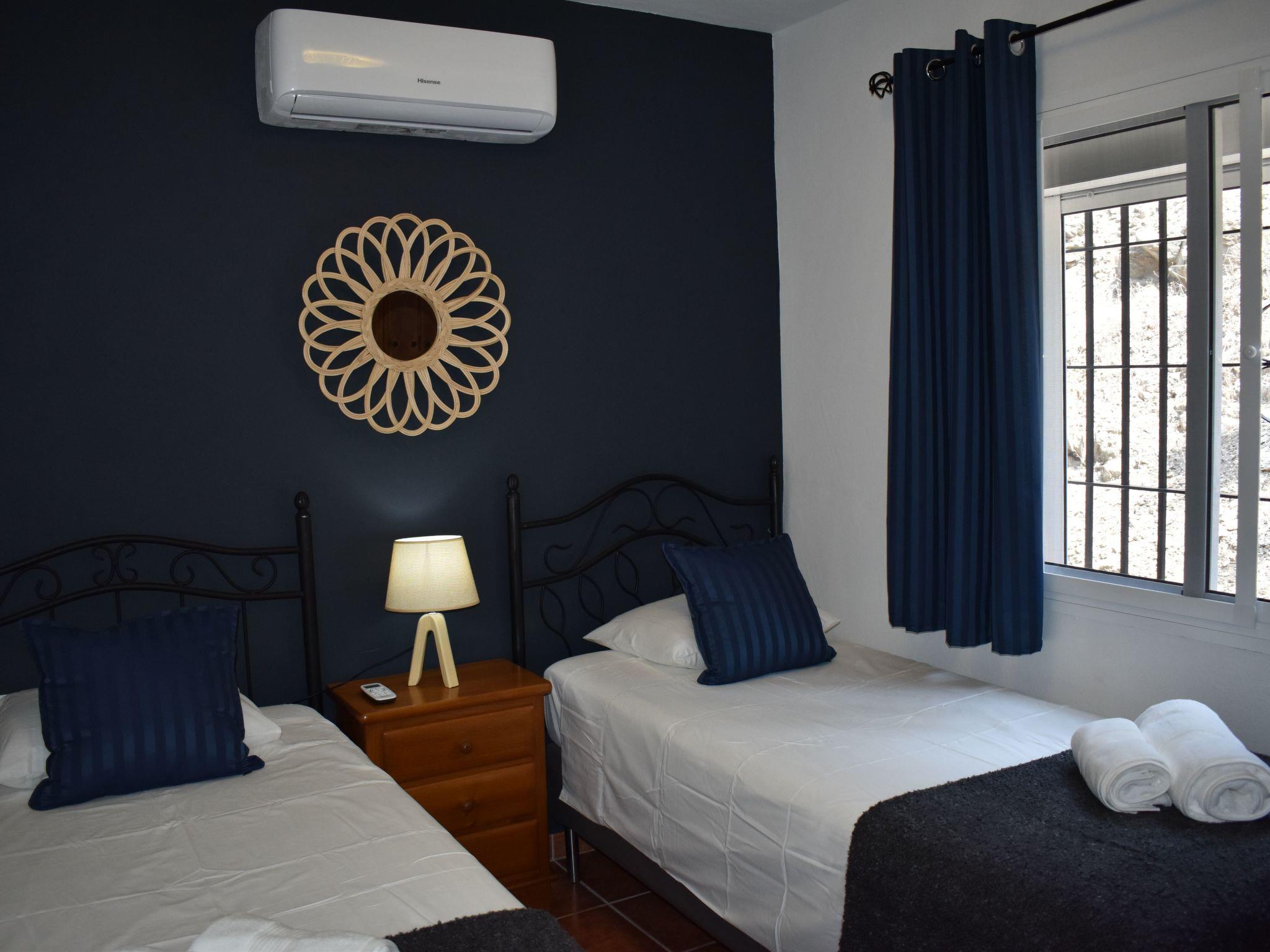 Finca Aguaillo offers a brand new fully-equipped kitchen with a breakfast bar. Spacious living / dining area with two leather sofas, Sharp Smart TV, dining table, wood burner for cozy winter nights and air-conditioning (hot&cold), 2 bedrooms, one with a double bed, and the other one with 2 single beds. Both bedrooms have fitted wardrobes and air conditioning (hot&cold). Bathroom has