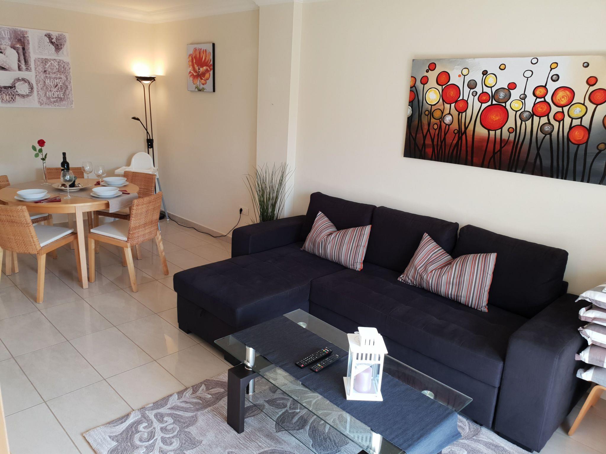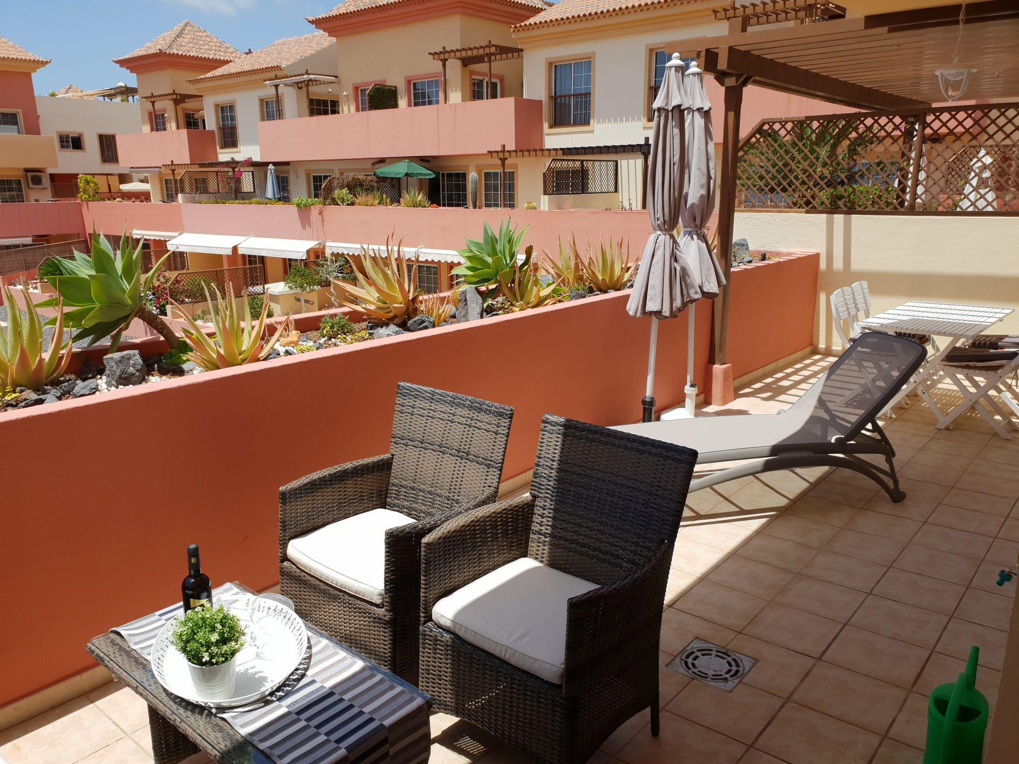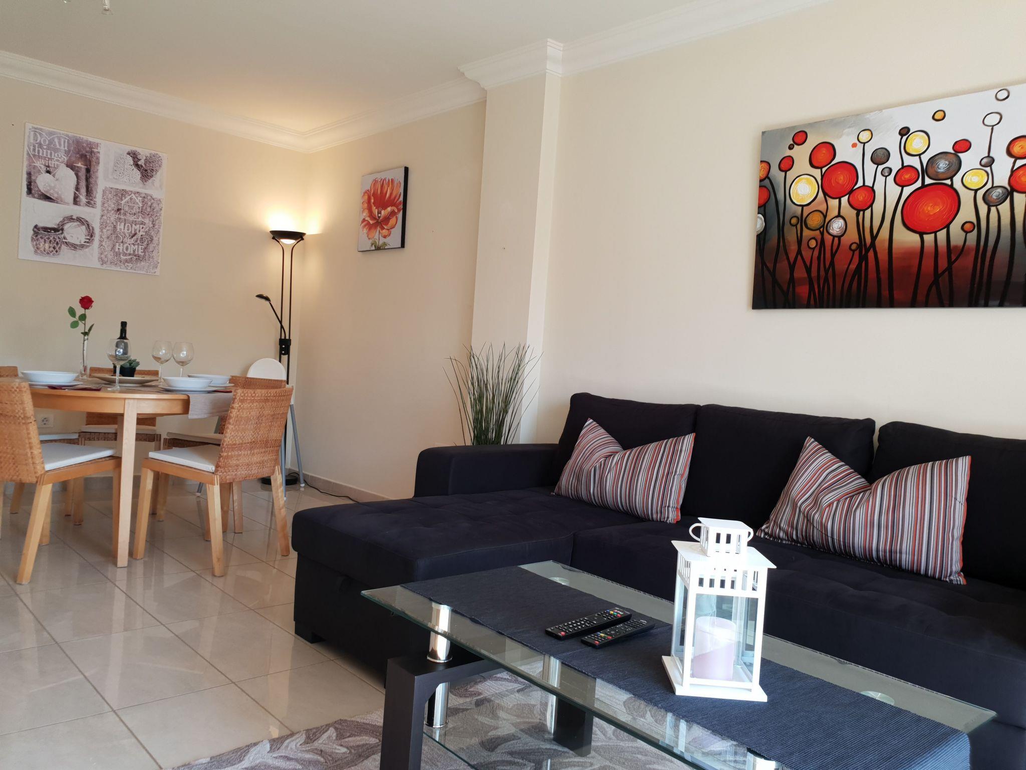This very exclusive flat in a prime location in Costa Adeje surprises with a large terrace from which you have a fantastic sea view. There you can enjoy the many sunny days to the full. The property belongs to the absolute top class on Tenerife in the popular and exclusive district of El Duque. You can expect an incredible view over the Atlantic Ocean that stretches all the way to La Gomera - here you can watch wonderful sunsets every day and enjoy them with a glass of wine in the evening. This spacious flat offers two bedrooms, two bathrooms, a large living room and a fully equipped kitchen. The pool is heated in winter and has sun loungers. The modern kitchen has a dishwasher, cooker with ceramic hob, oven, microwave, coffee machine, toaster, kettle and a fridge-freezer. The living room has a sofa bed that can be used as sleeping accommodation for 2 additional people. There is also a flat screen TV with international satellite programmes in the living room, as well as a stereo system and free internet via Wifi. Many shops, restaurants and the beach are in the immediate vicinity, you can easily reach everything on foot.
