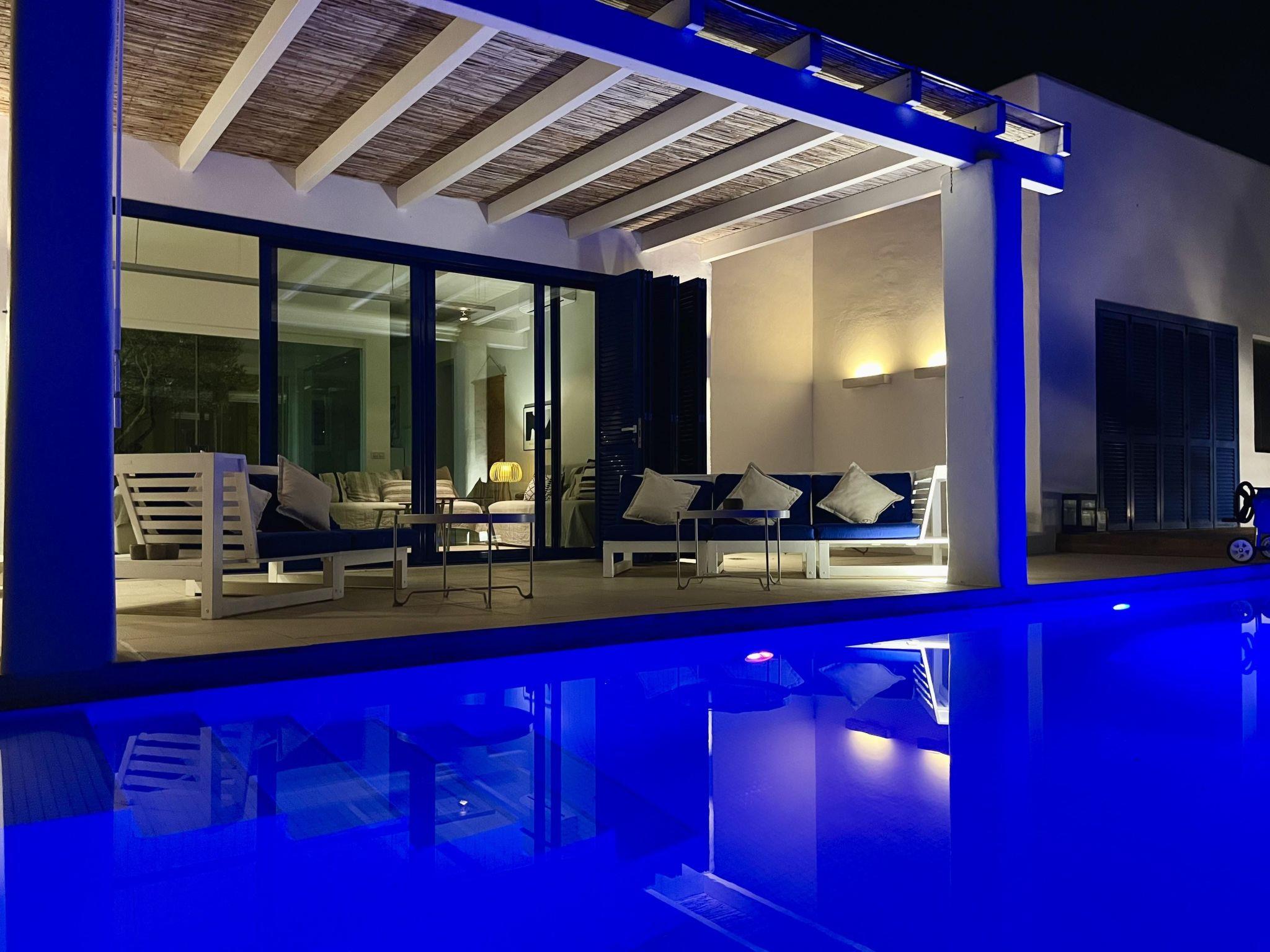 The exterior areas are on two levels. The main level is where the main outdoor area that borders the house is located, and is made up of the porch with the outdoor lounge, the infinity pool with the sunbathing area and the outdoor dining table. On the lower level there is also a sunbathing area and a patio with a Greek boat converted into a bench. A very quiet place to read.