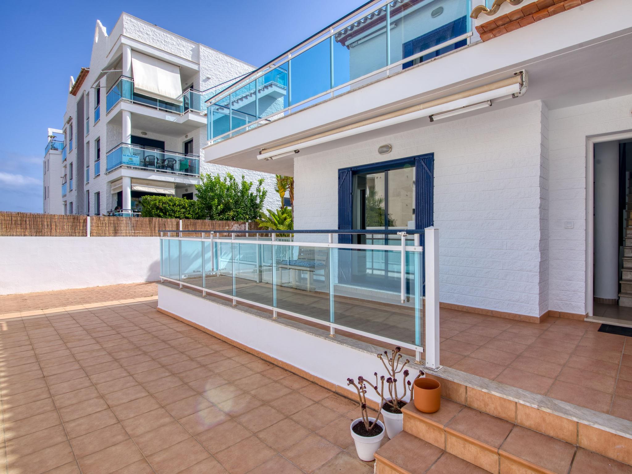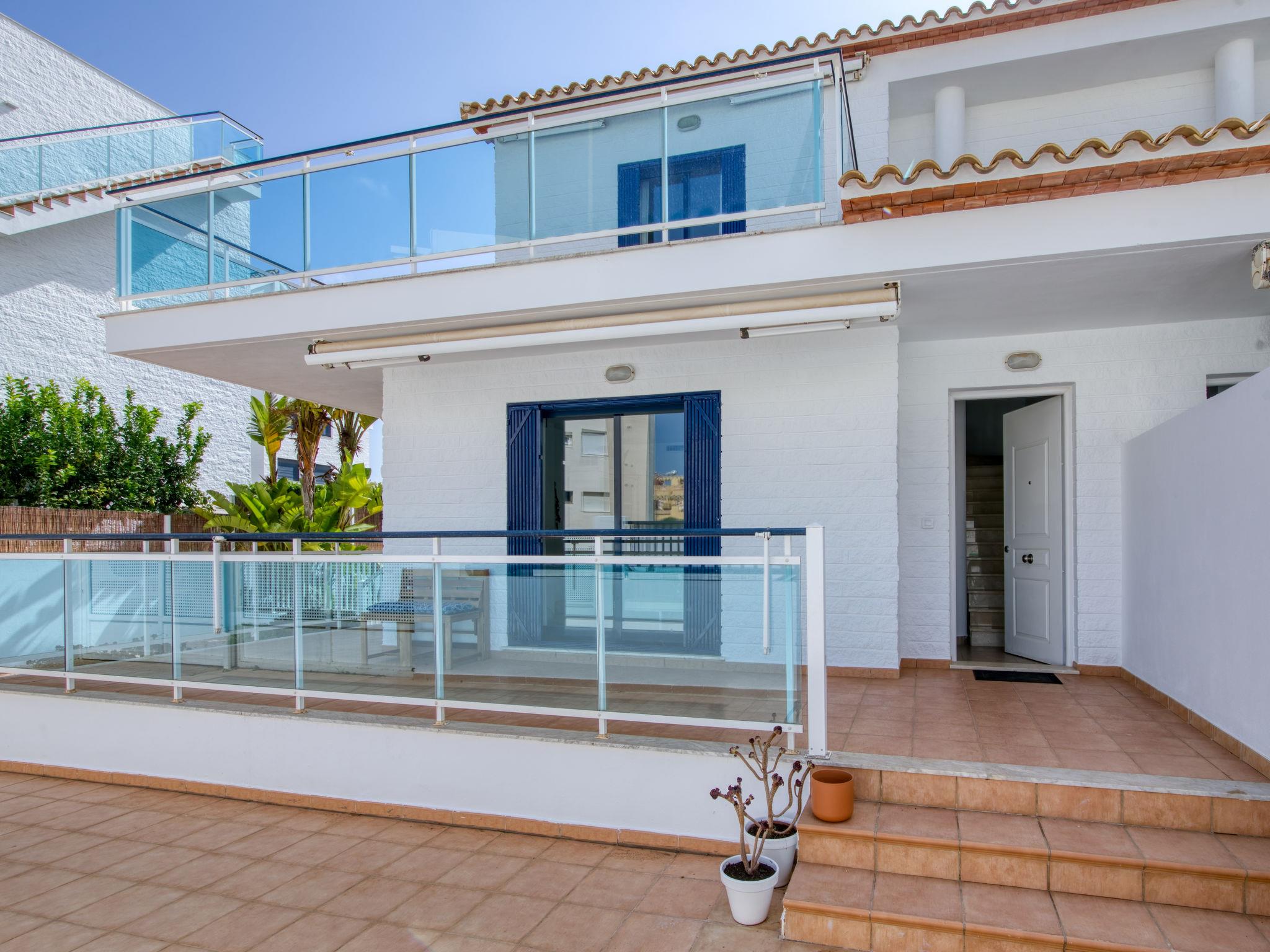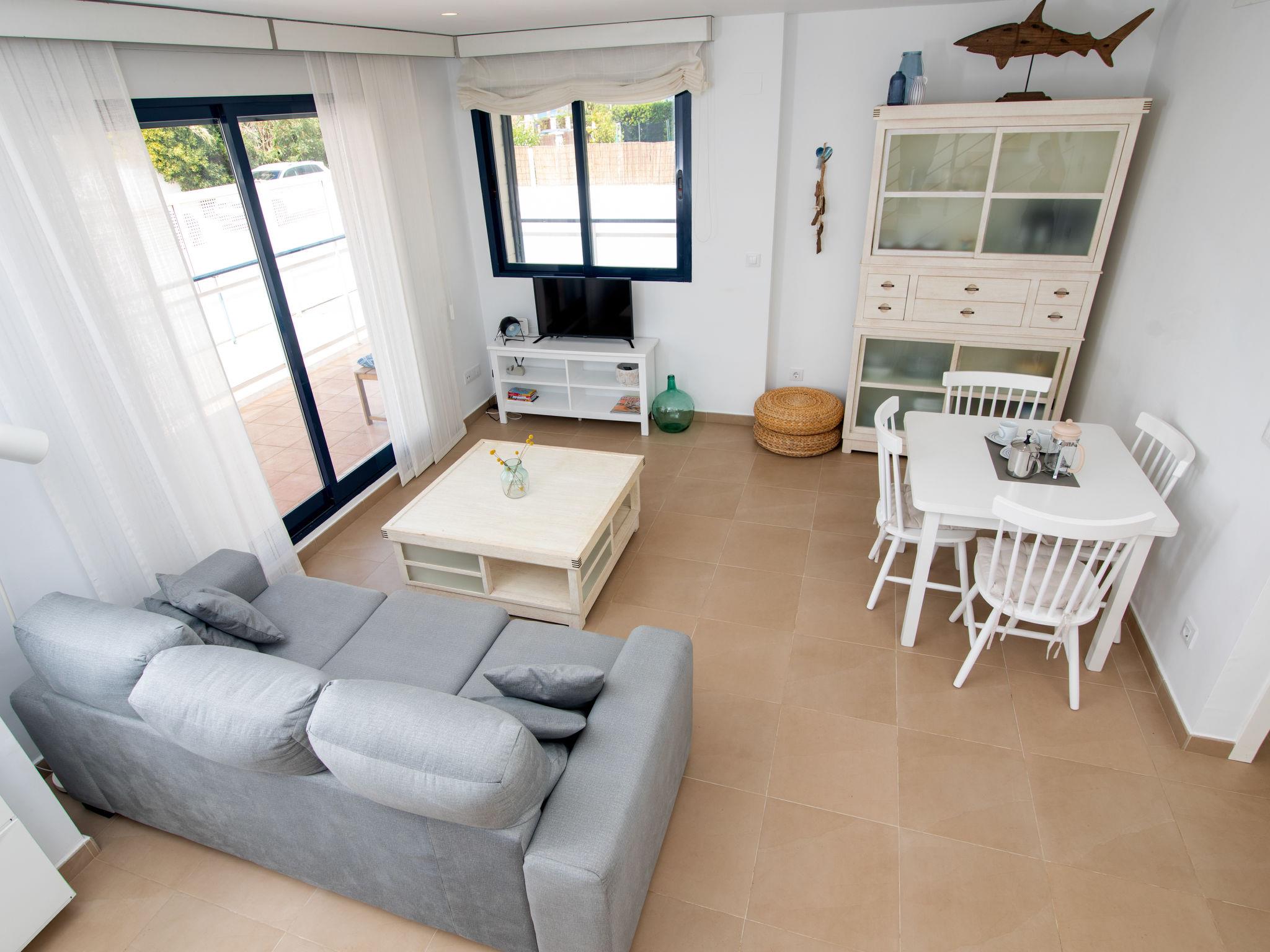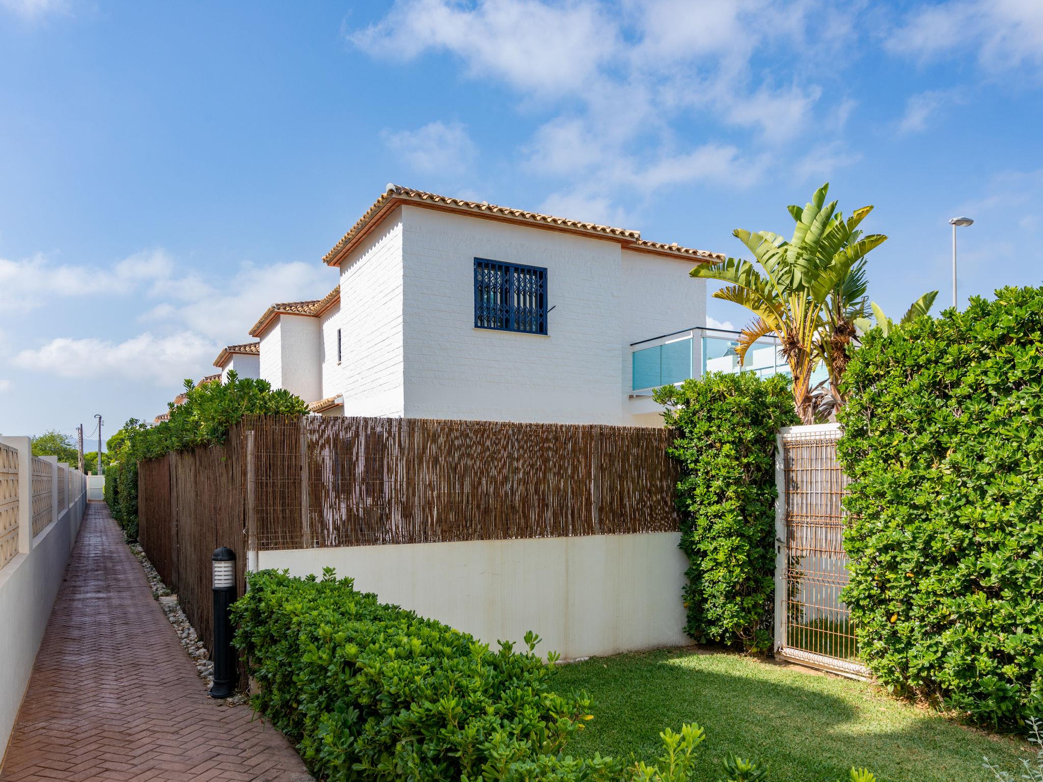 "Jardines de Denia V", 4-room semi-detached house 105 m2 on 2 levels. Spacious and bright, very beautiful and cosy furnishings: living/dining room with digital TV, air conditioning and forced-air heating. Exit to the patio. 1 room with 1 pull-out bed (2 pers. 2 x 90 cm, length 190 cm), air conditioning and forced-air heating. Kitchen (oven, dishwasher, 4 ceramic glass hob hotplates, microwave, freezer, electric coffee machine). Shower/WC. Upper floor: 1 room with 1 french bed (160 cm, length 190 cm), air conditioning and forced-air heating. Exit to the terrace. 1 room with 2 beds (90 cm, length 190 cm), air conditioning and forced-air heating. Bath/bidet/WC. Patio, lawn. Terrace furniture, barbecue. Very beautiful view of the sea. Facilities: washing machine, iron, children's high chair, baby cot, hair dryer. Internet (WiFi, free). Parking. Please note: TV only ES. R00000001