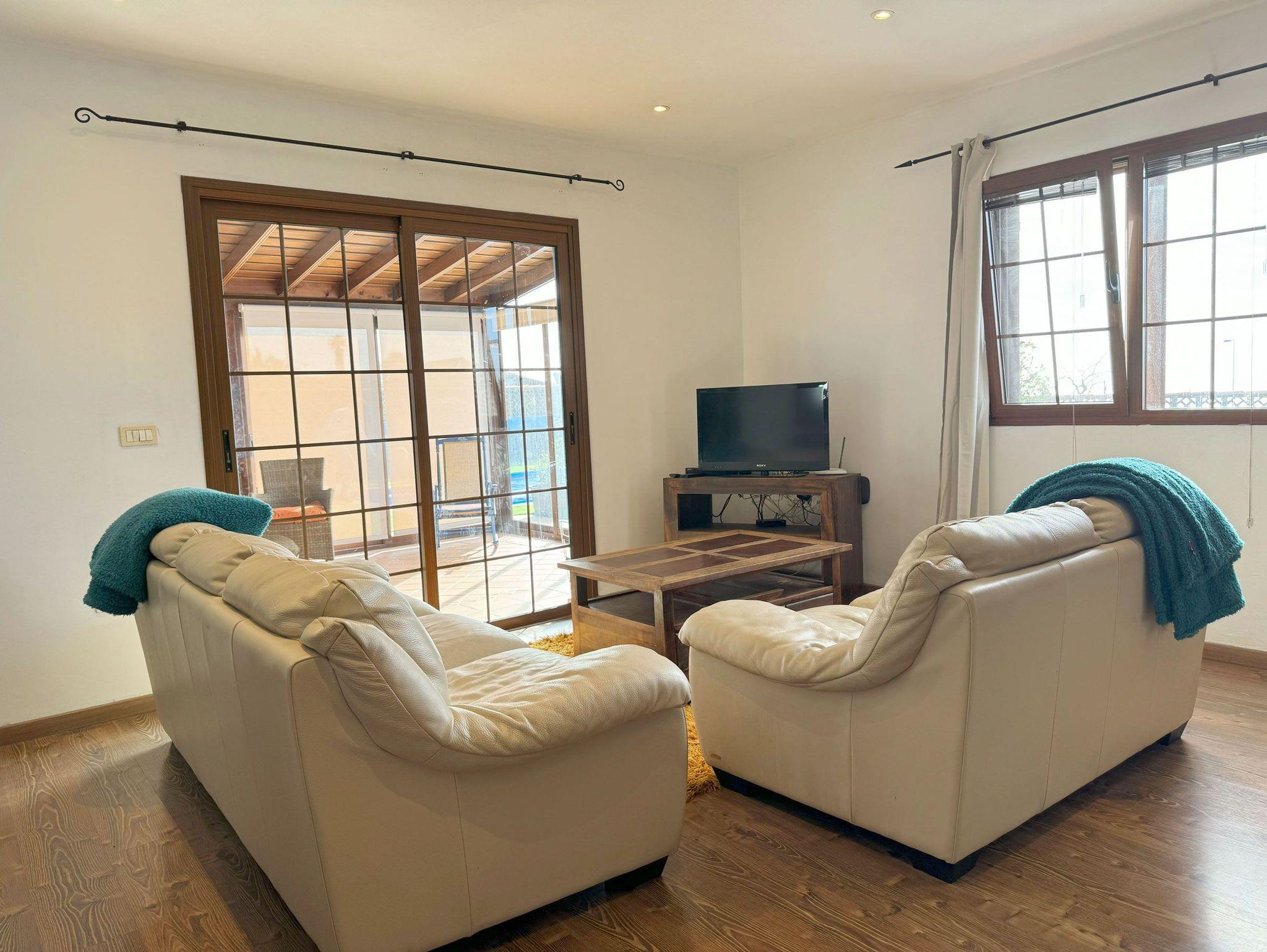 Ein echtes Highlight ist der Außenbereich der Casa Mirador Azul. Das 1000 Quadratmeter große Grundstück ist von einer Mauer umgeben und bietet viel Privatsphäre. Ein beheizbarer Pool mit Abdeckung lädt zum erfrischenden Schwimmen ein, eine Liegefläche mit 2 Sonnenliegen und Sonnenschirm zum Entspannen.